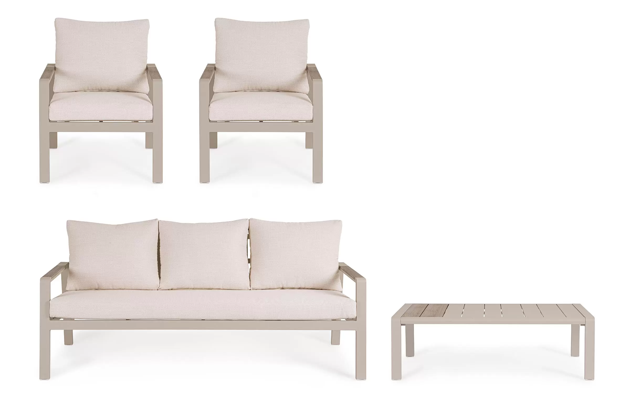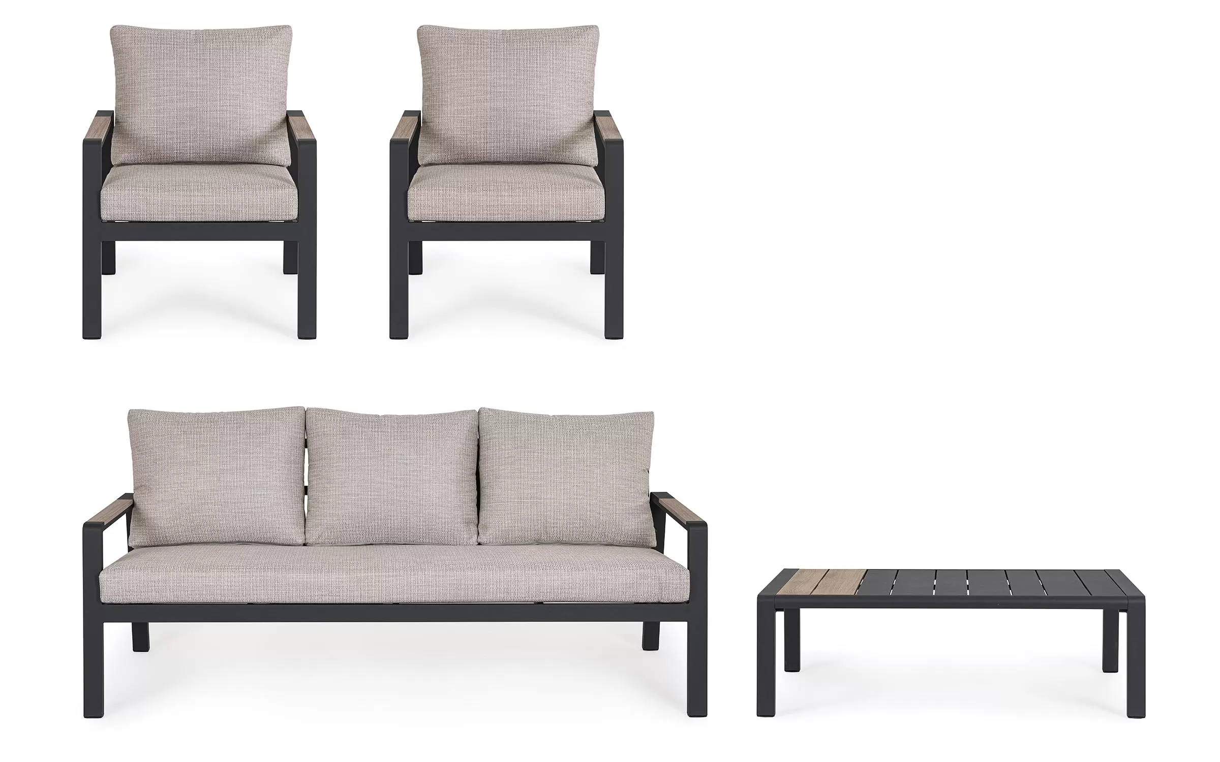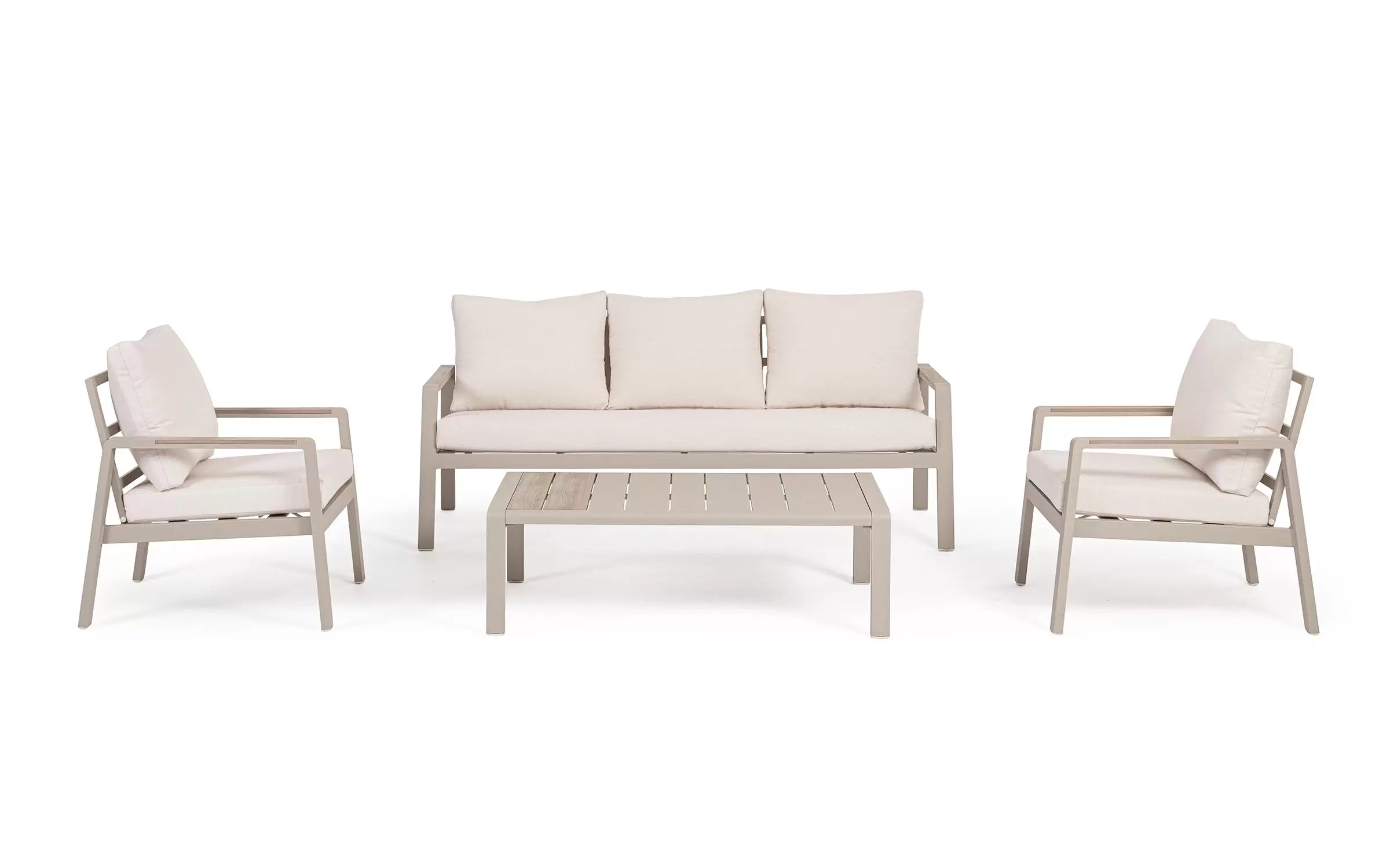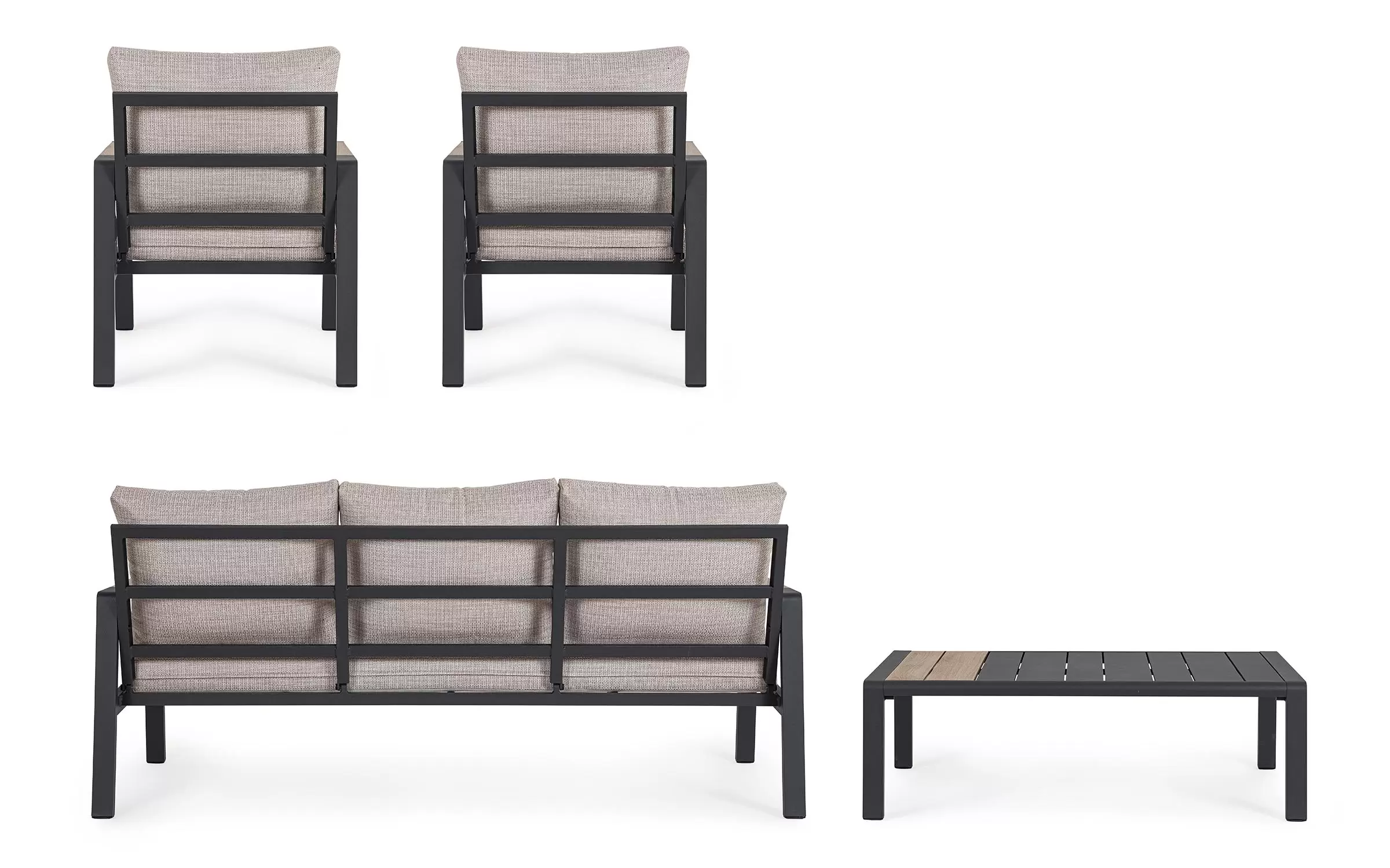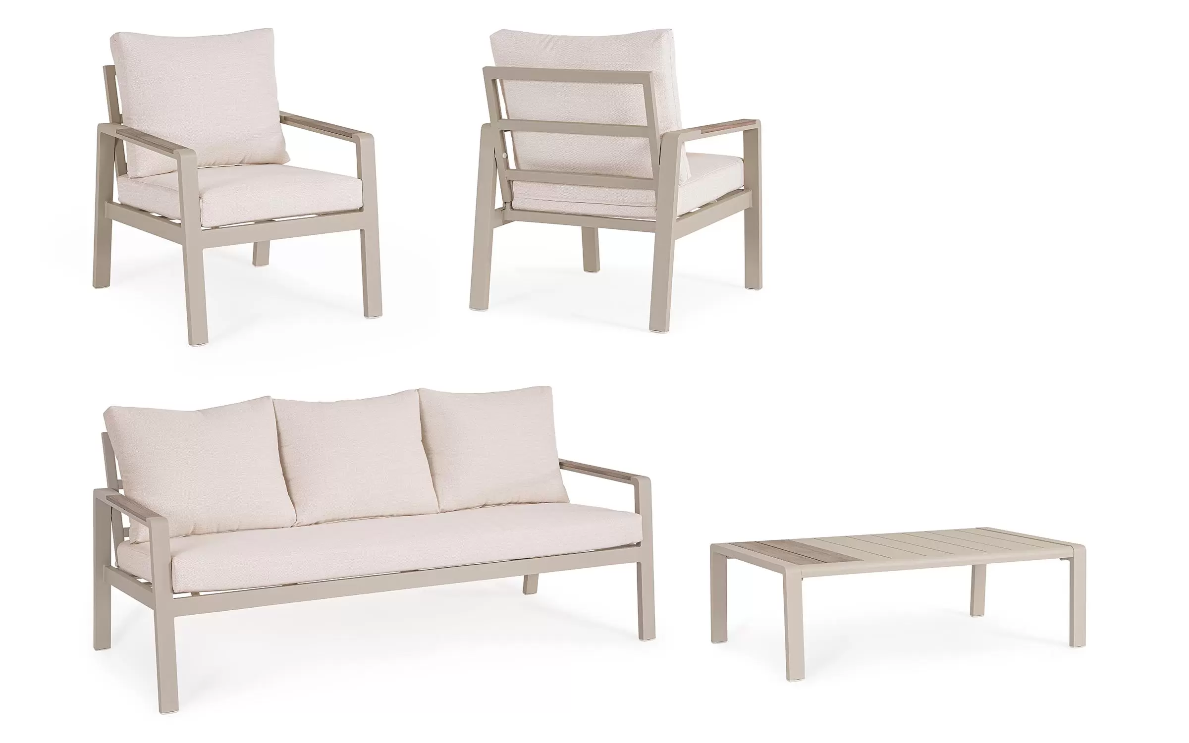 Meble ogrodowe wypoczynkowe dla pięciu osób do użytku na zewnątrz. Sofa, dwa fotele i stolik wykonane w lekkiej wizualnie formie.