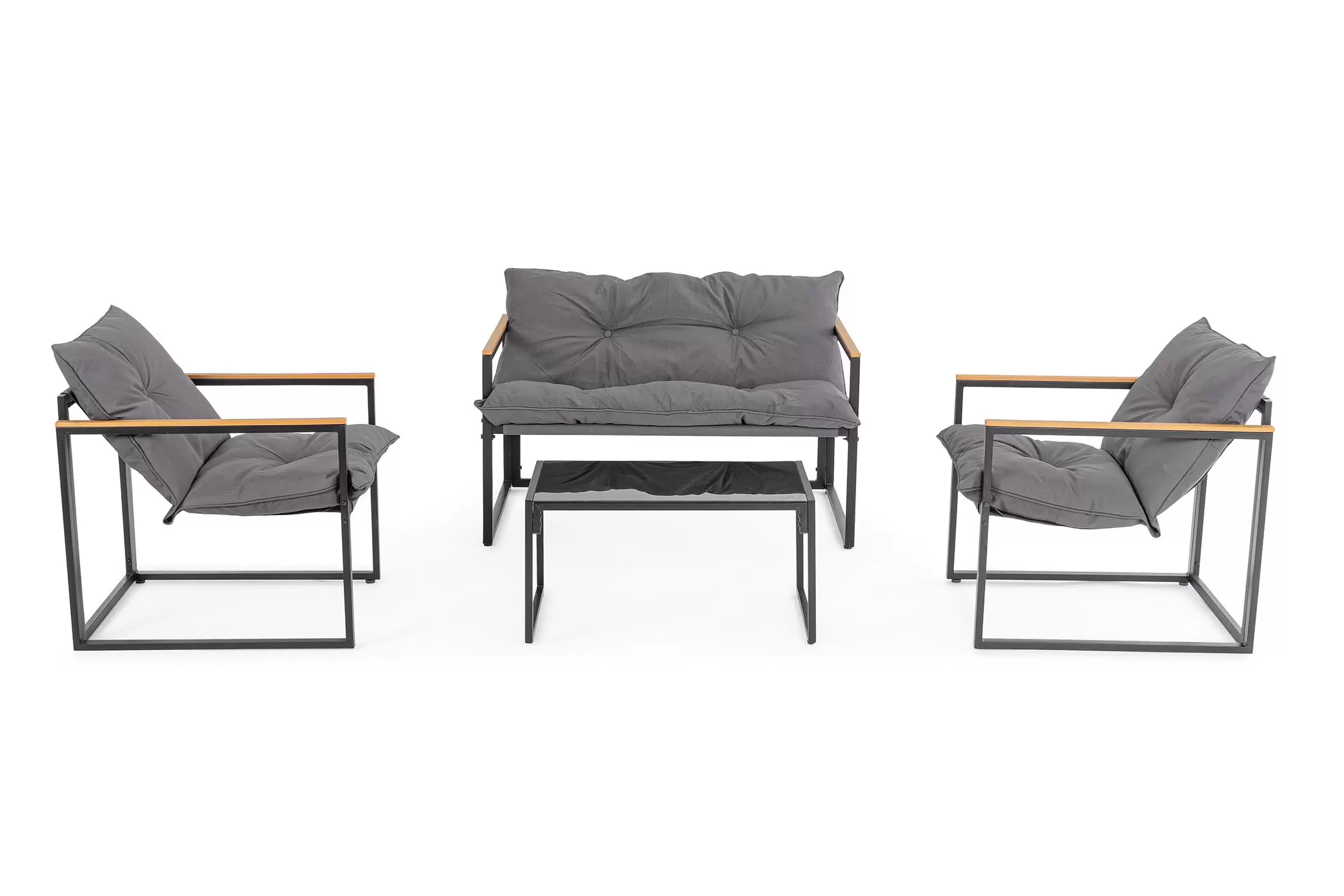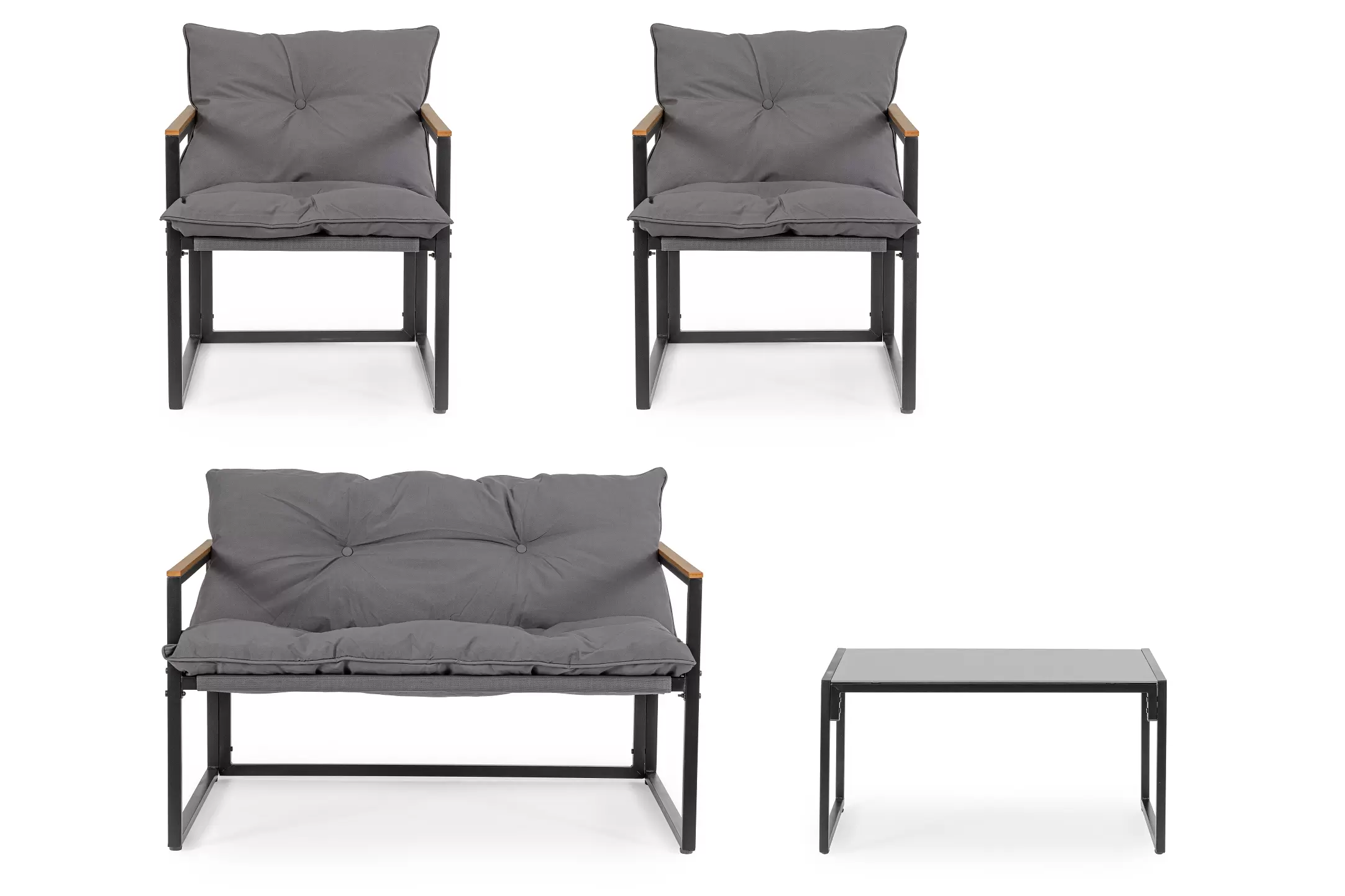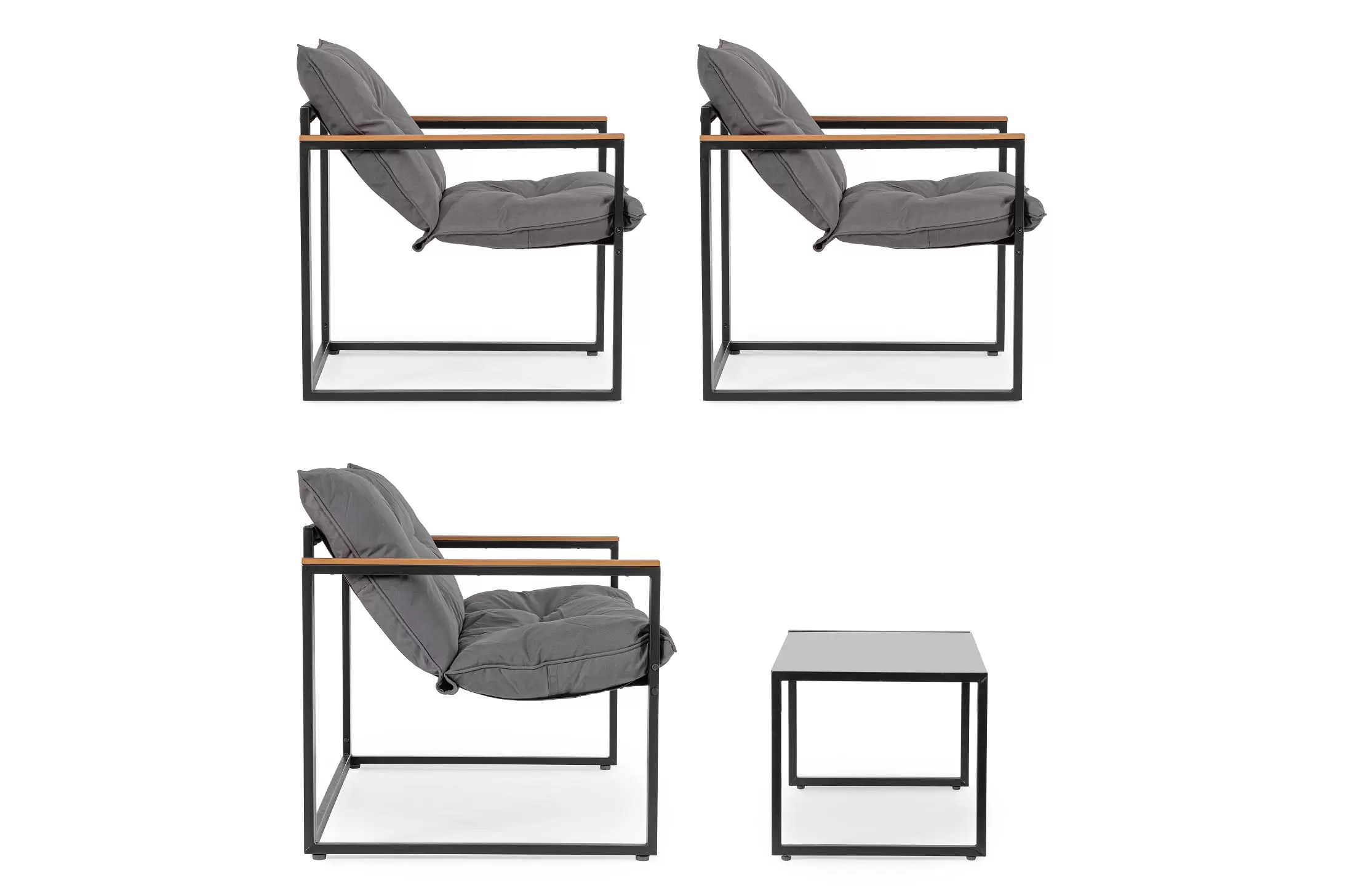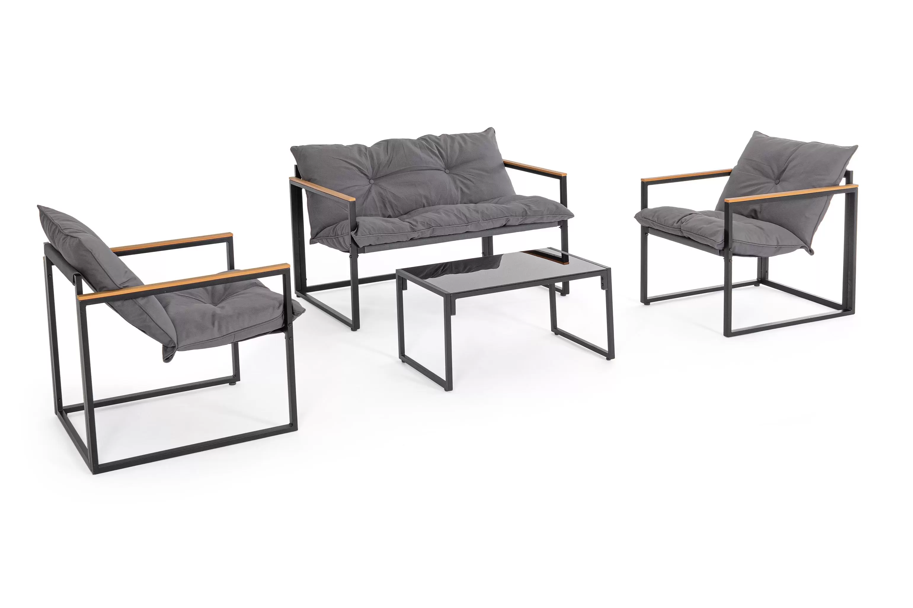 Stalowy komplet na taras o ramowej stylistyce z profili stalowych malowanych proszkowo na kolor antracyt. Podłokietniki z kompozytu drewnianego.