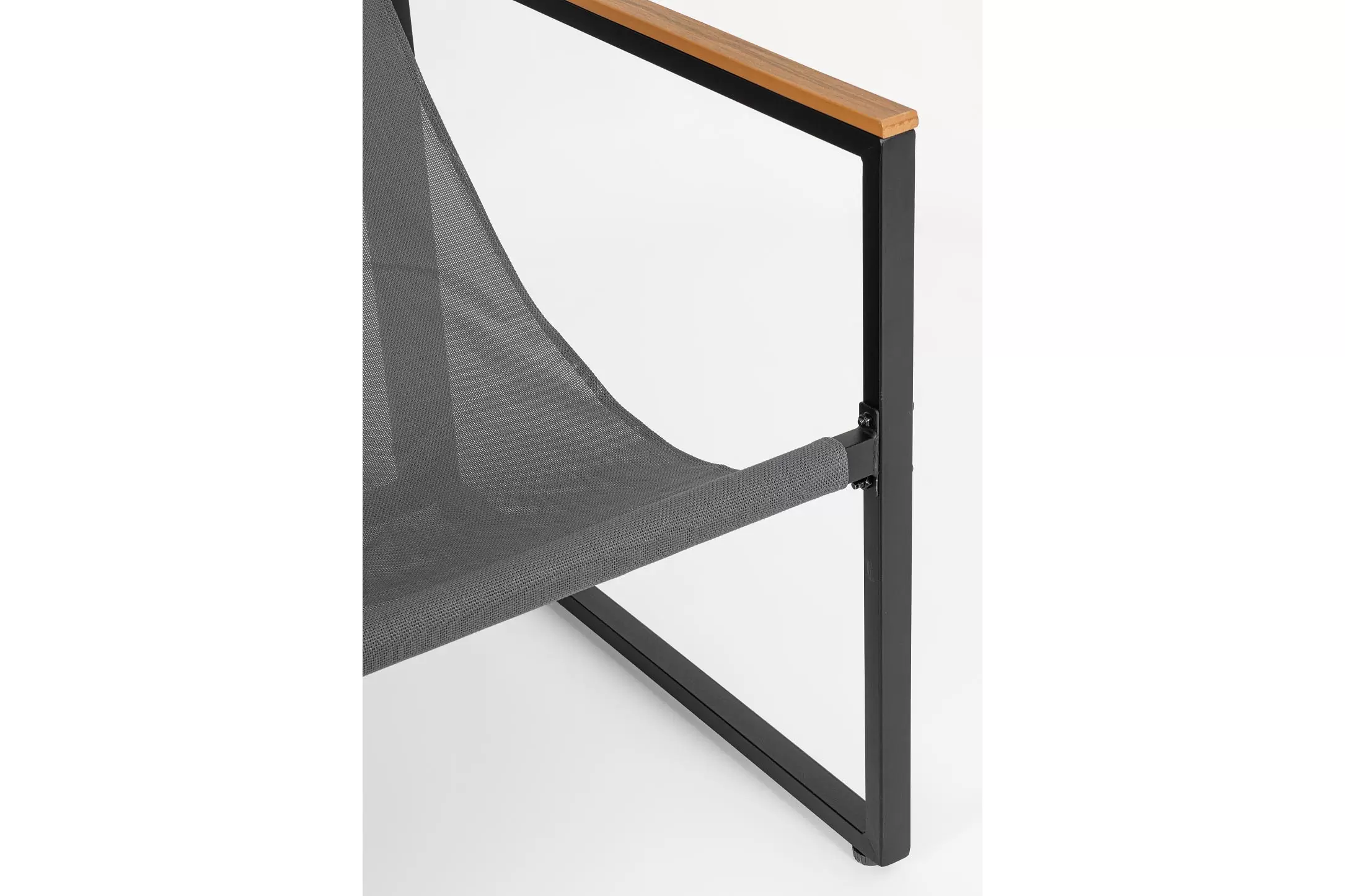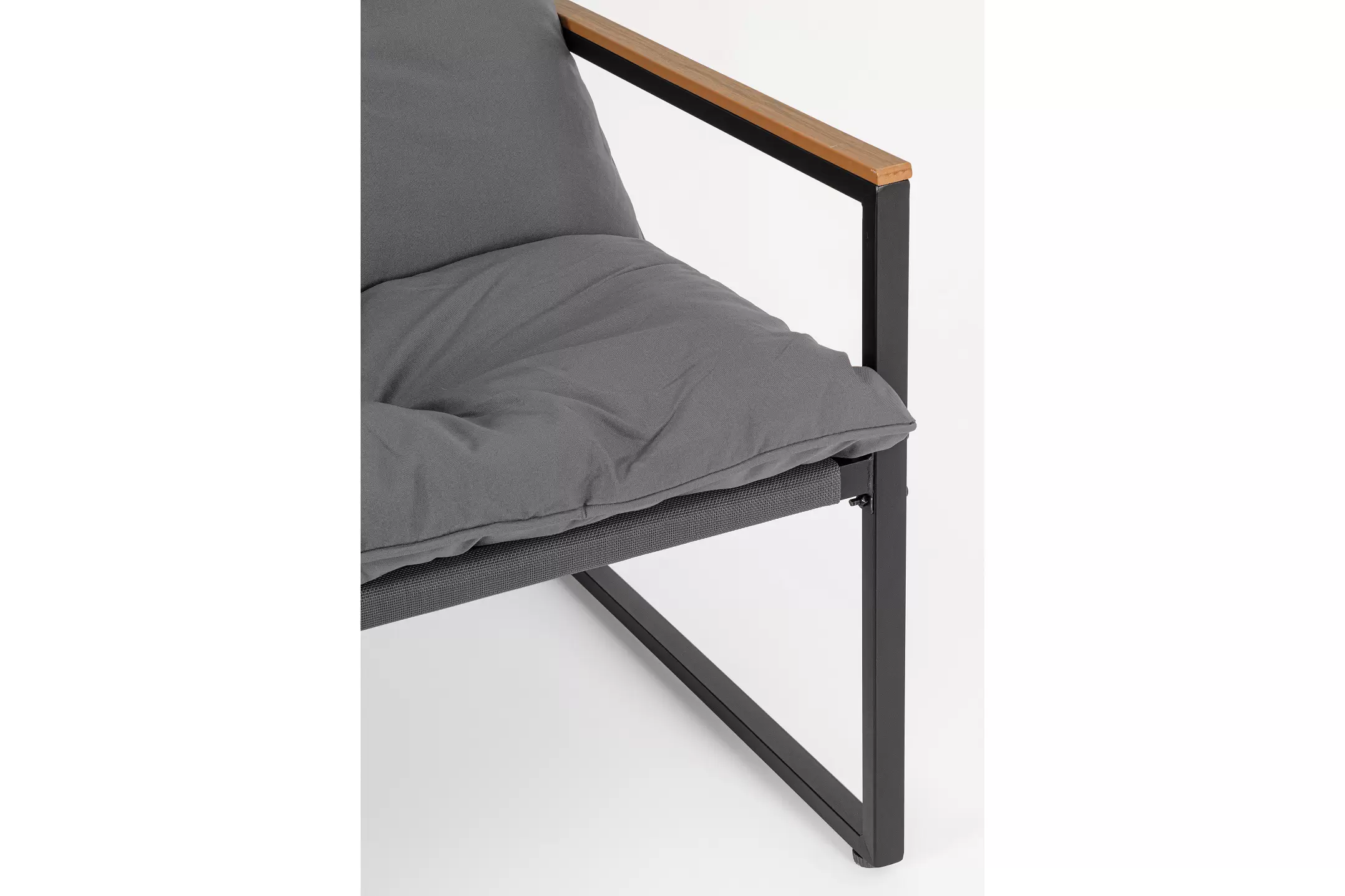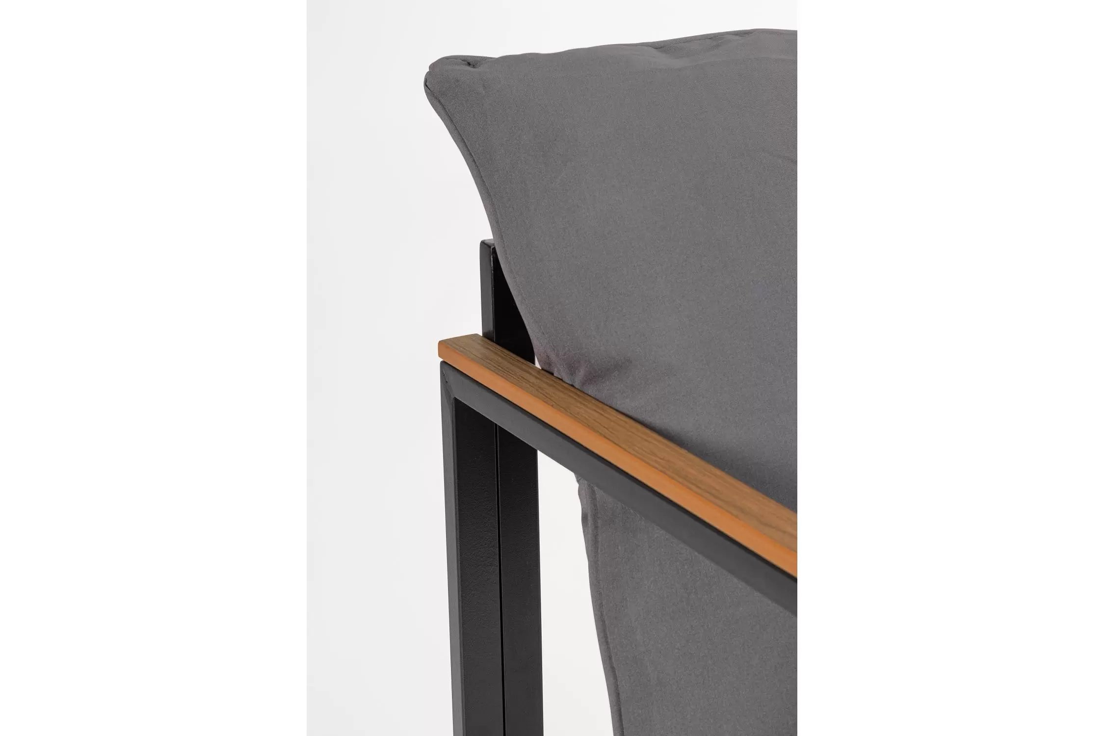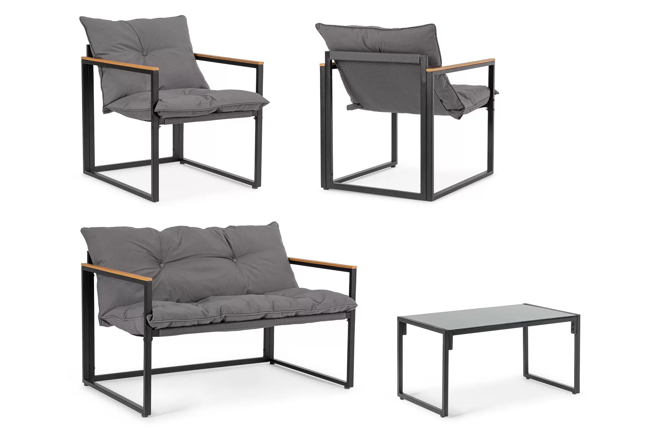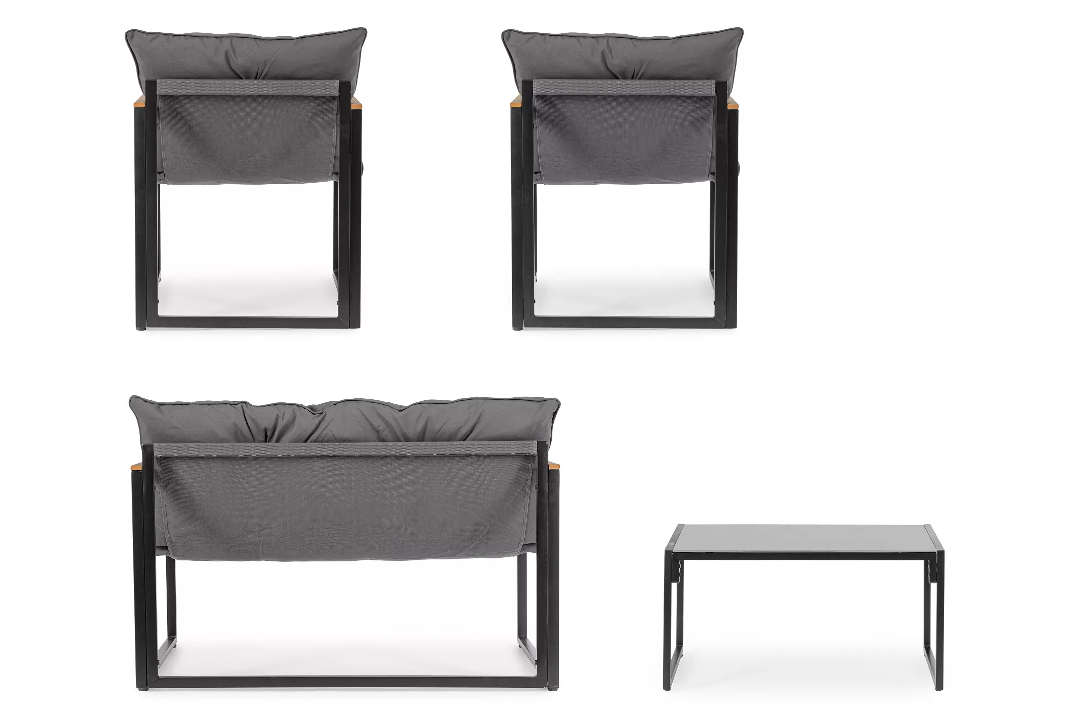 Stalowy komplet na taras o ramowej stylistyce z profili stalowych malowanych proszkowo na kolor antracyt. Podłokietniki z kompozytu drewnianego.