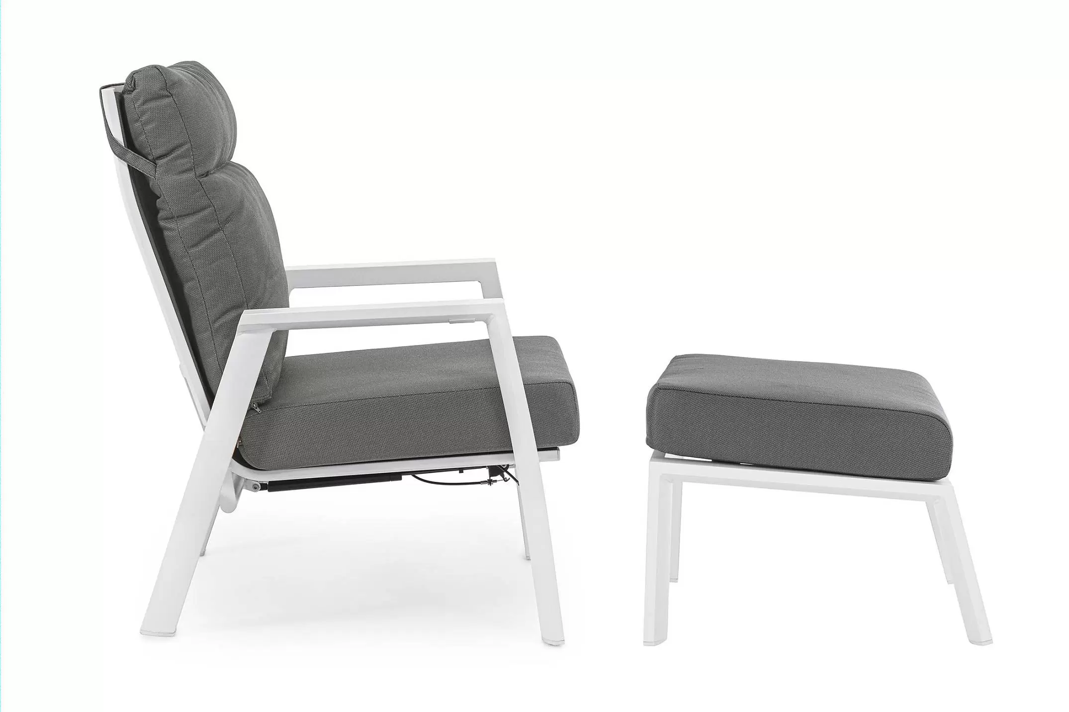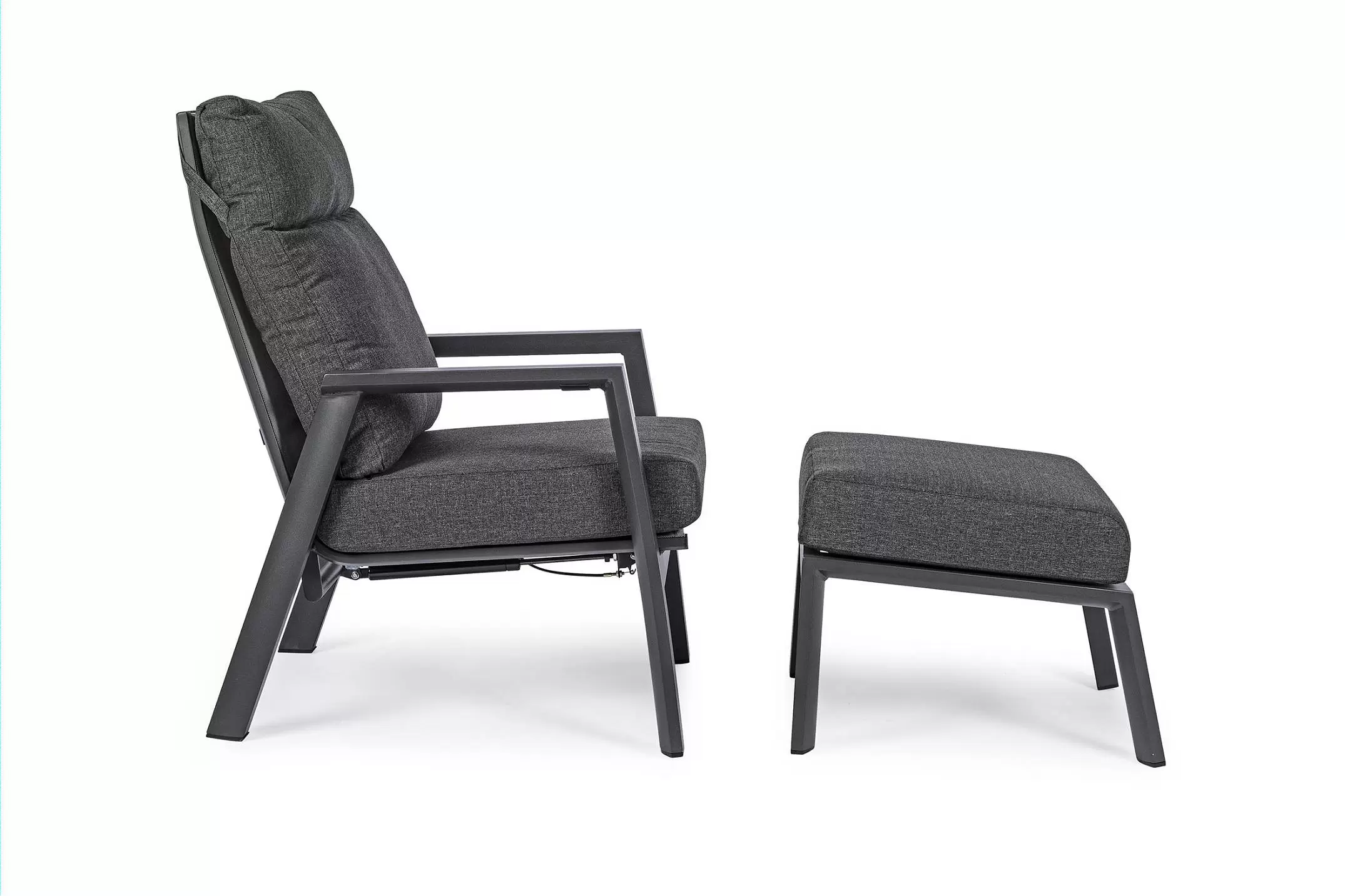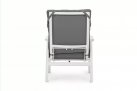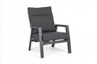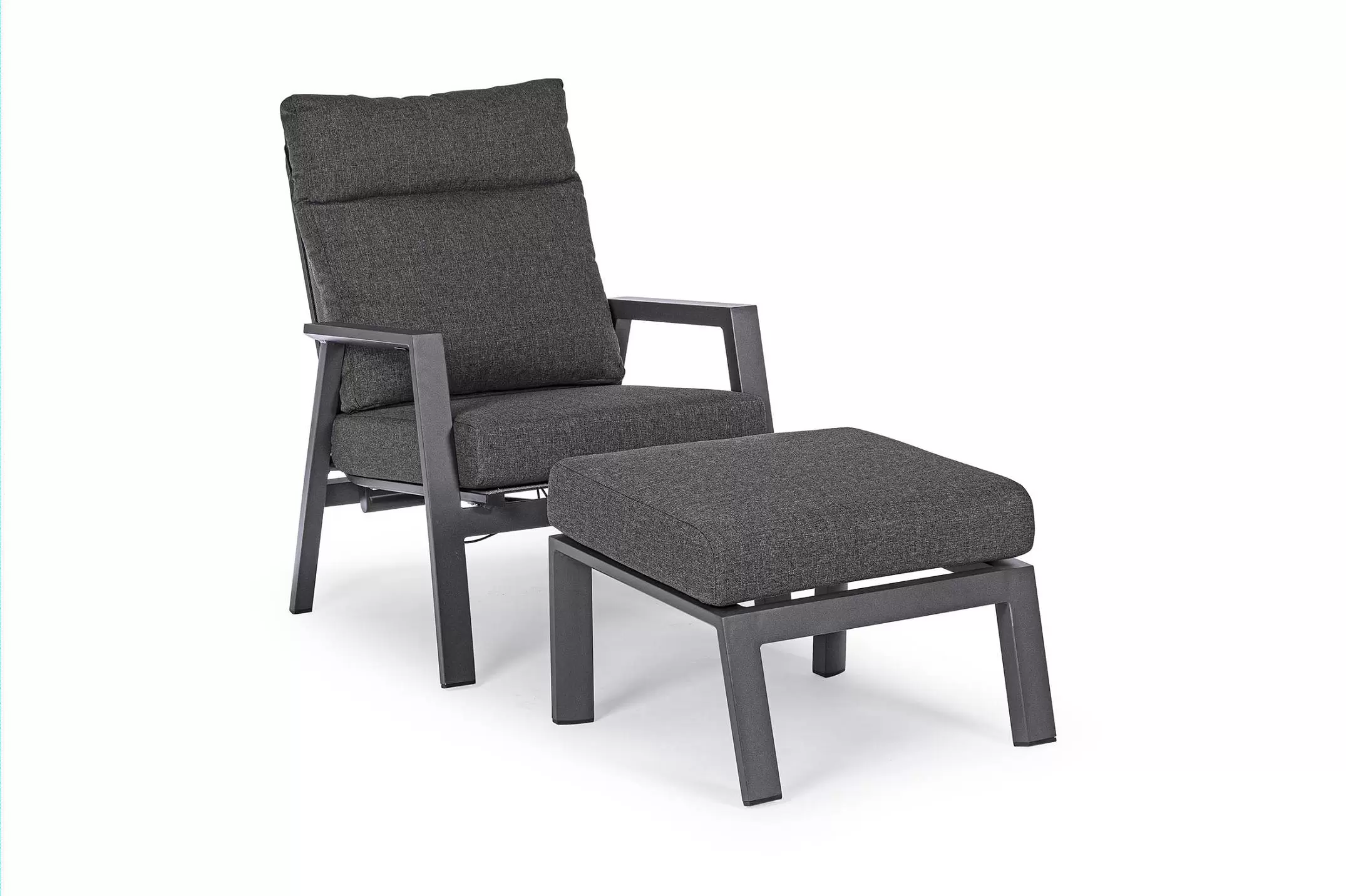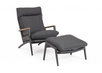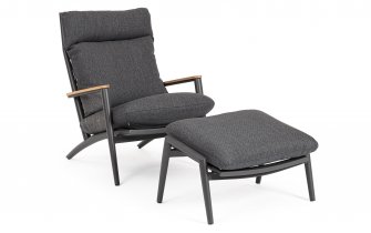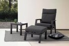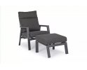 Aluminiowa fotel ogrodowy z wysokim, płynnie pochylanym oparciem oraz pasującym podnóżkiem.