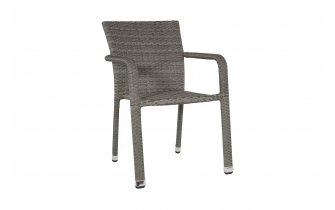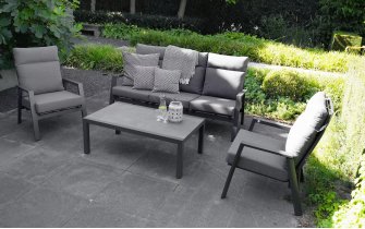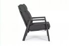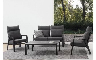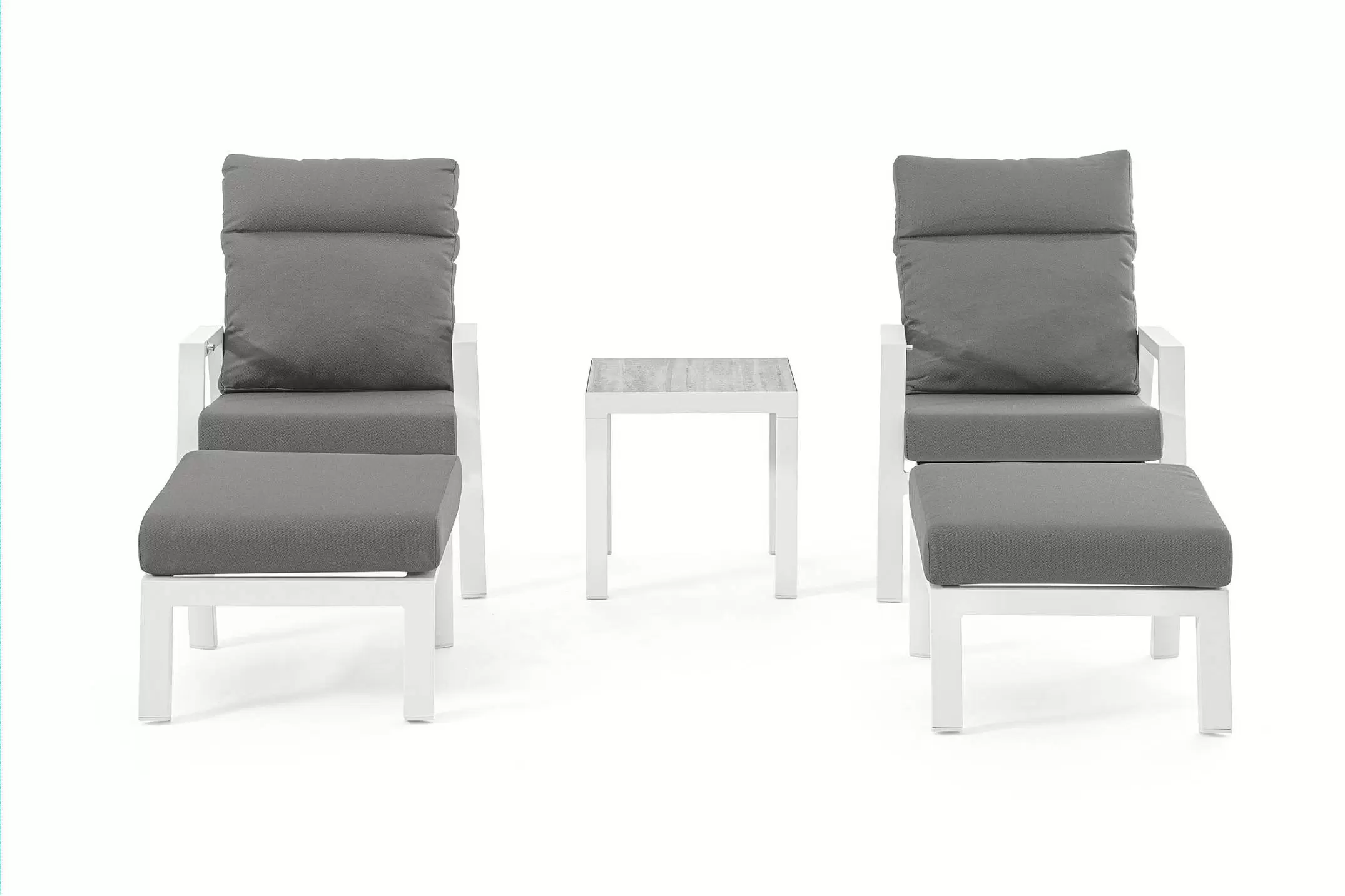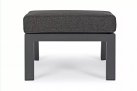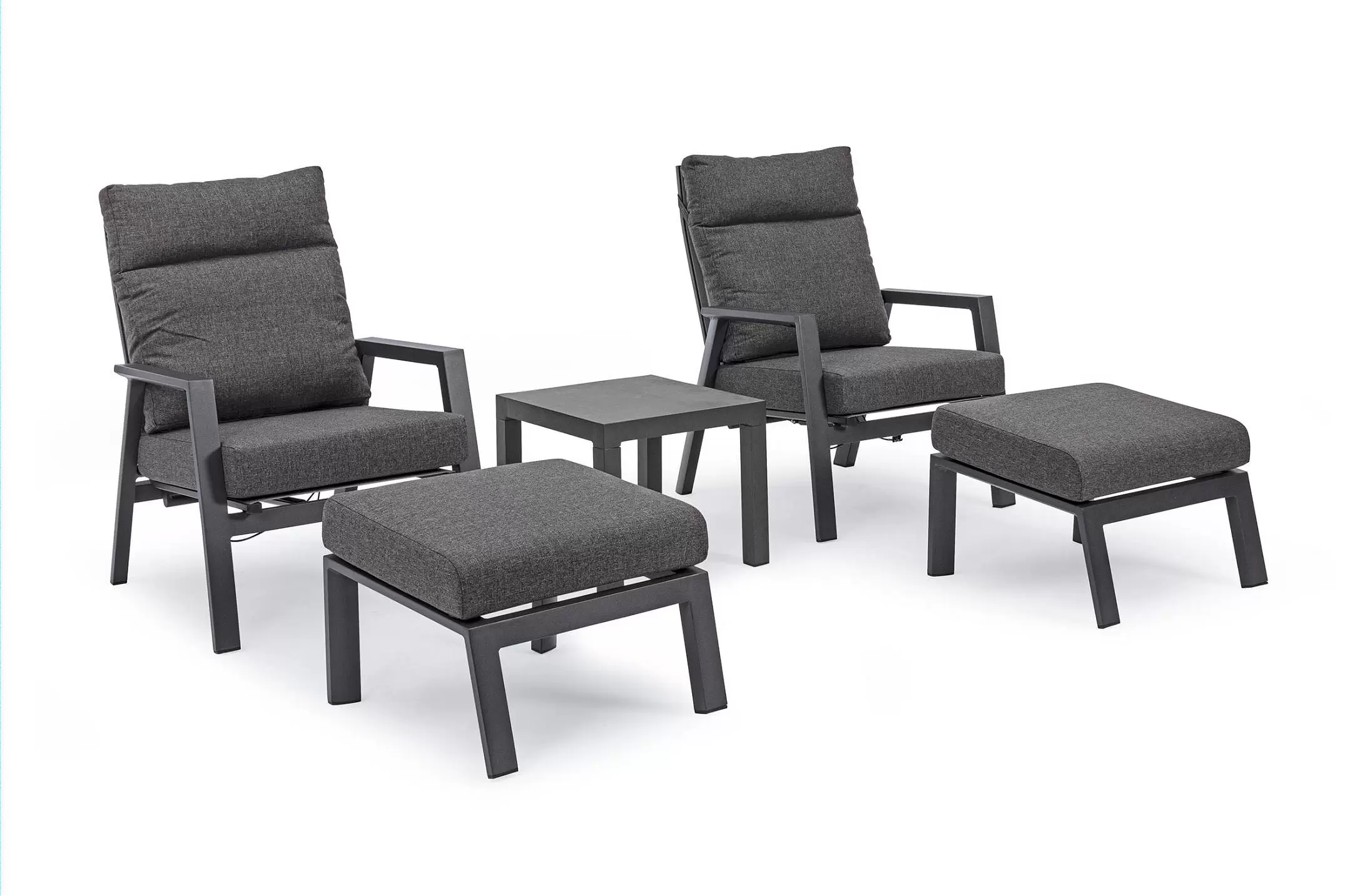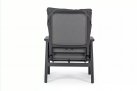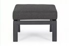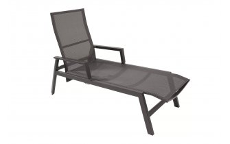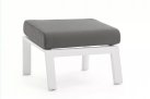 Aluminiowa fotel ogrodowy z wysokim, płynnie pochylanym oparciem oraz pasującym podnóżkiem.
