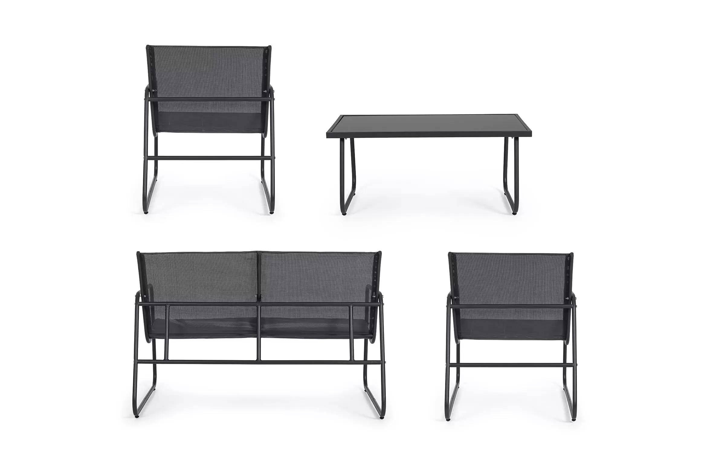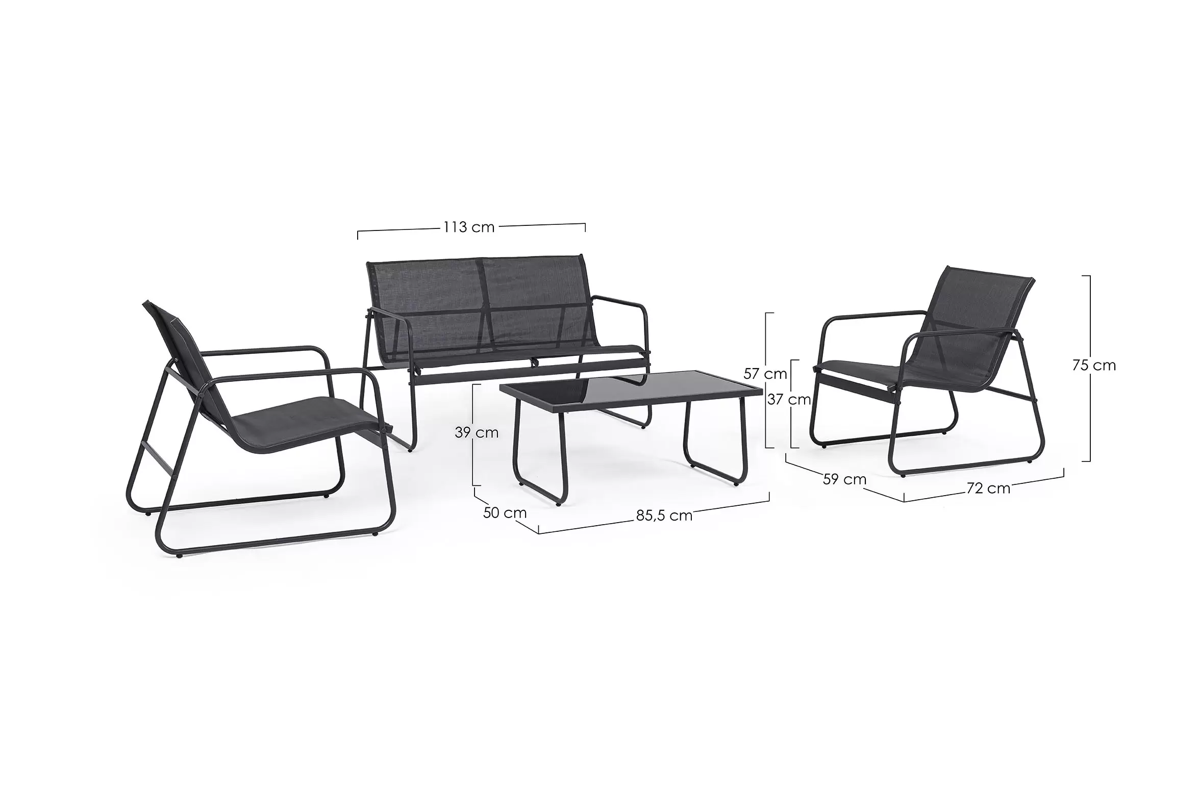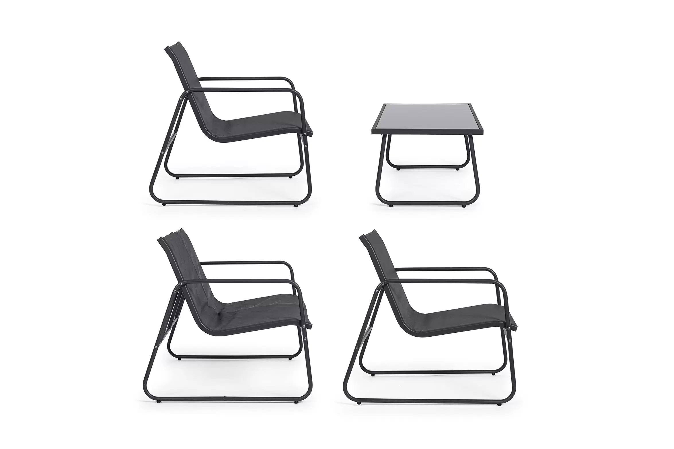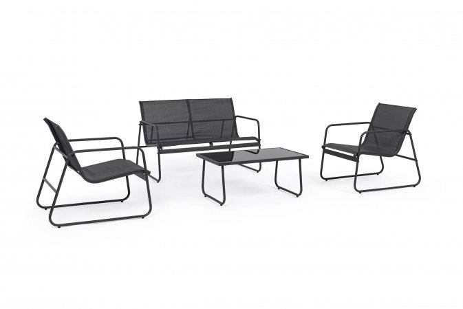 Lekki komplet wypoczynkowy o stalowej konstrukcji stalowej fosforanowanej i malowanej proszkowo.