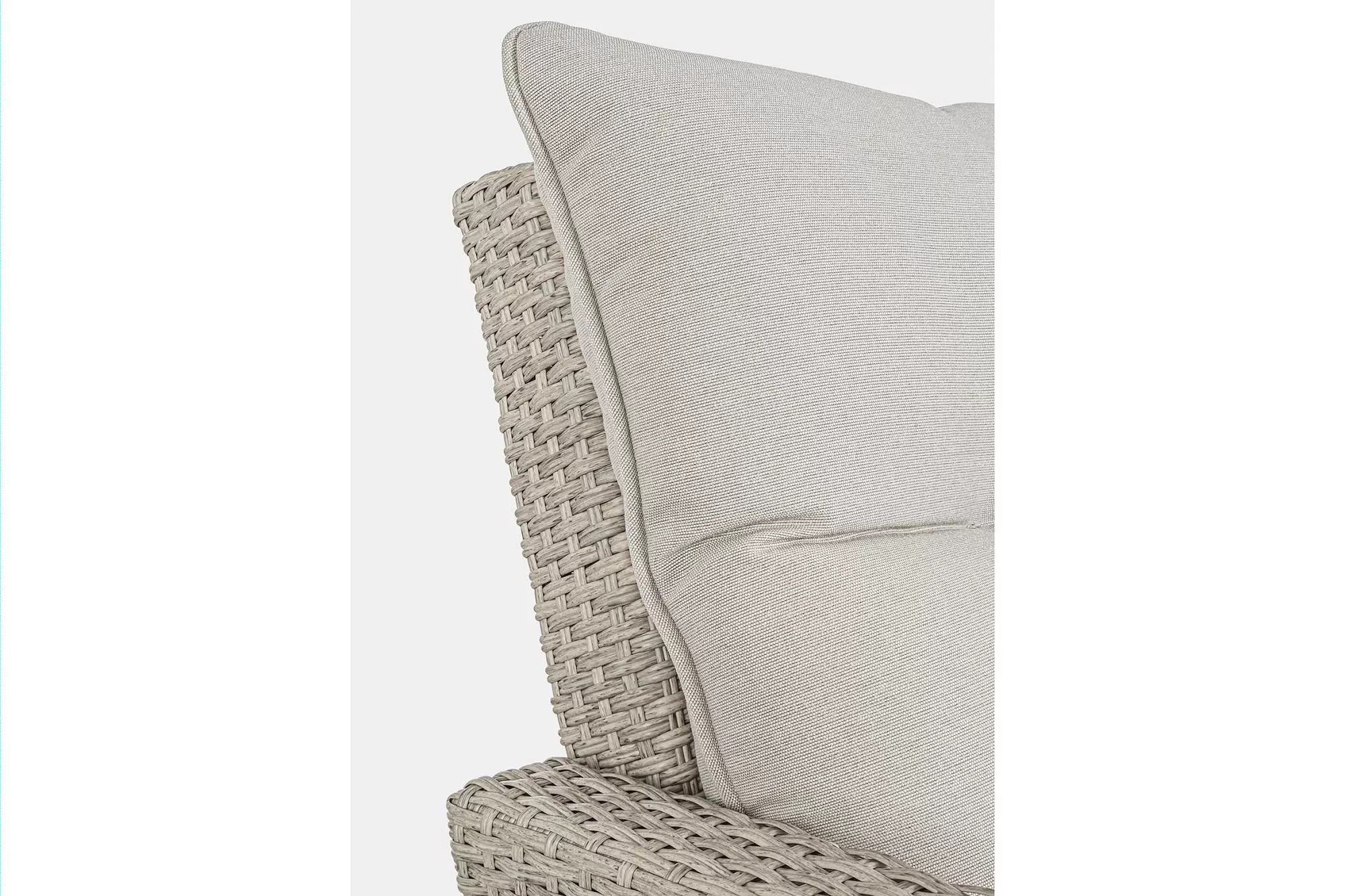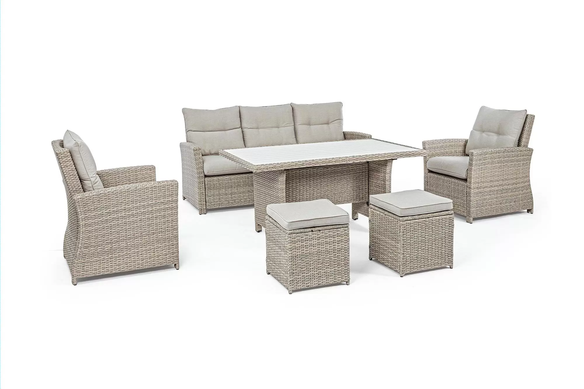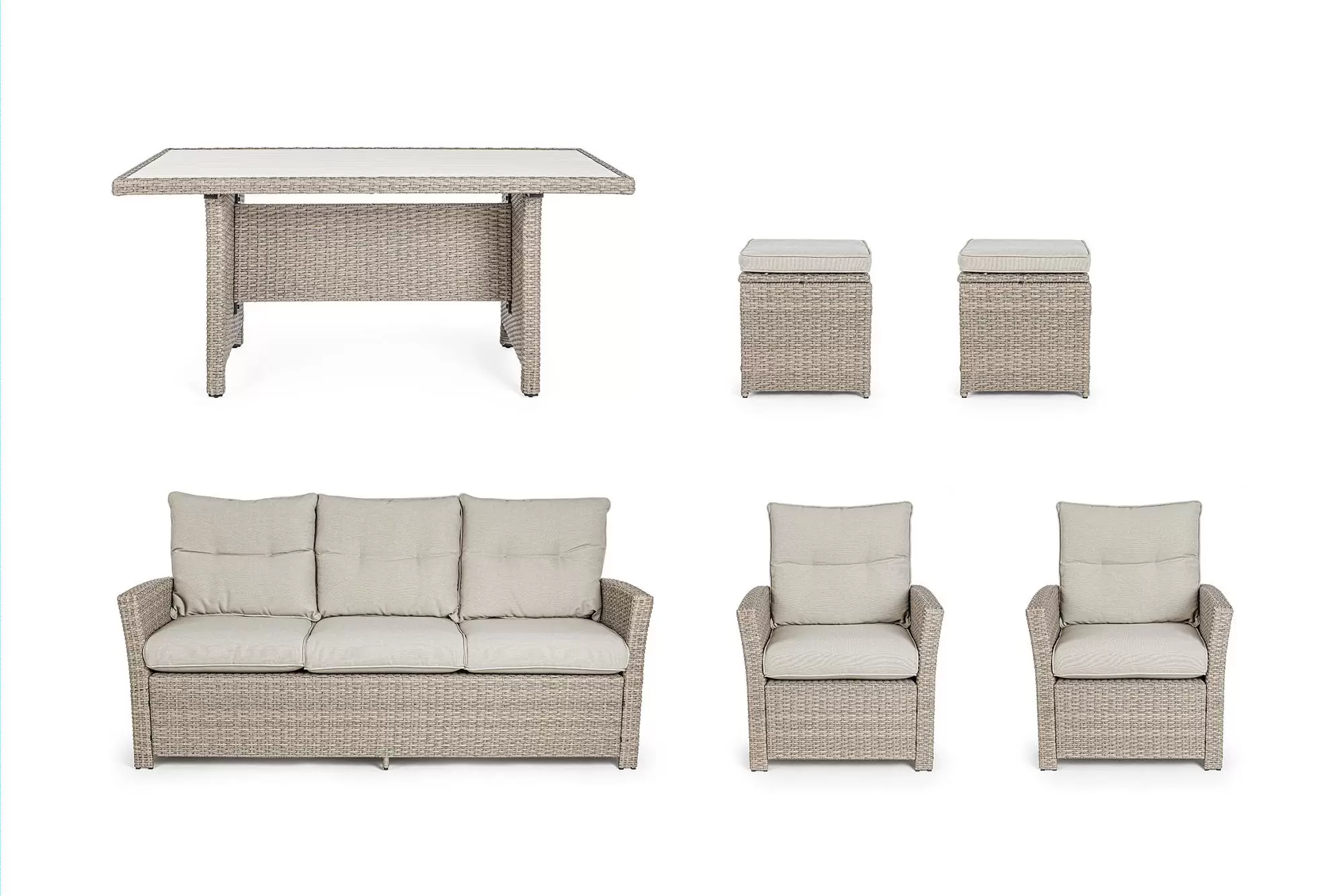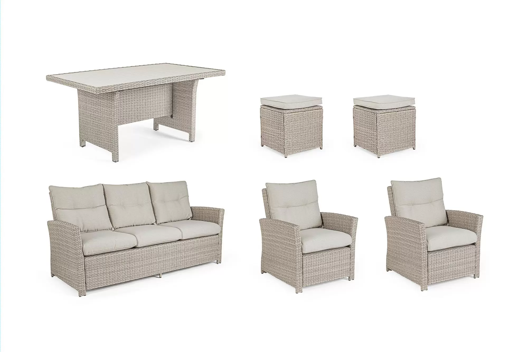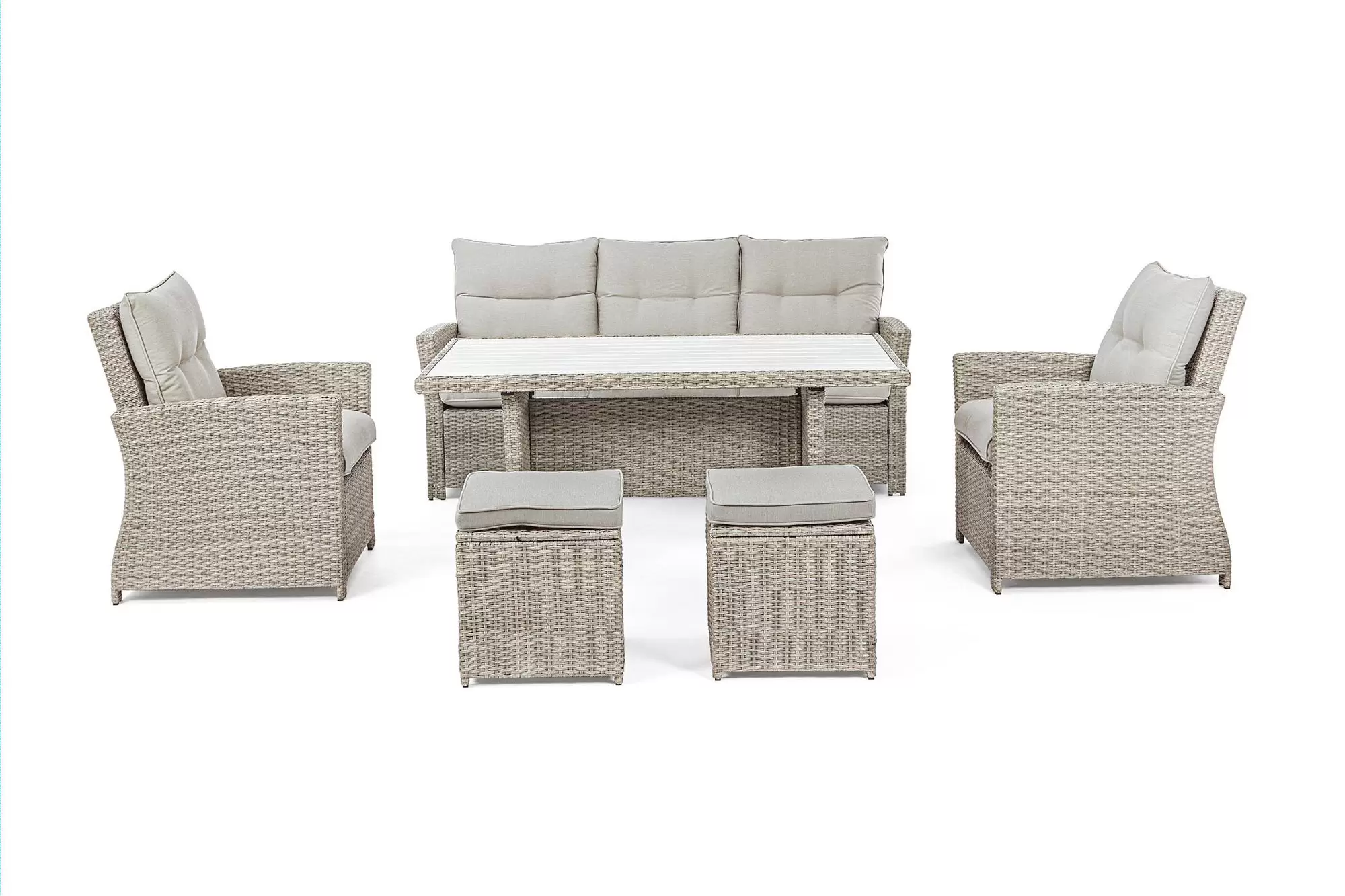 Meble wypoczynkowe z wysokim stołem co umożliwia wygodne spożycie obiadu na tarasie. Miejsce dla 7 osób.