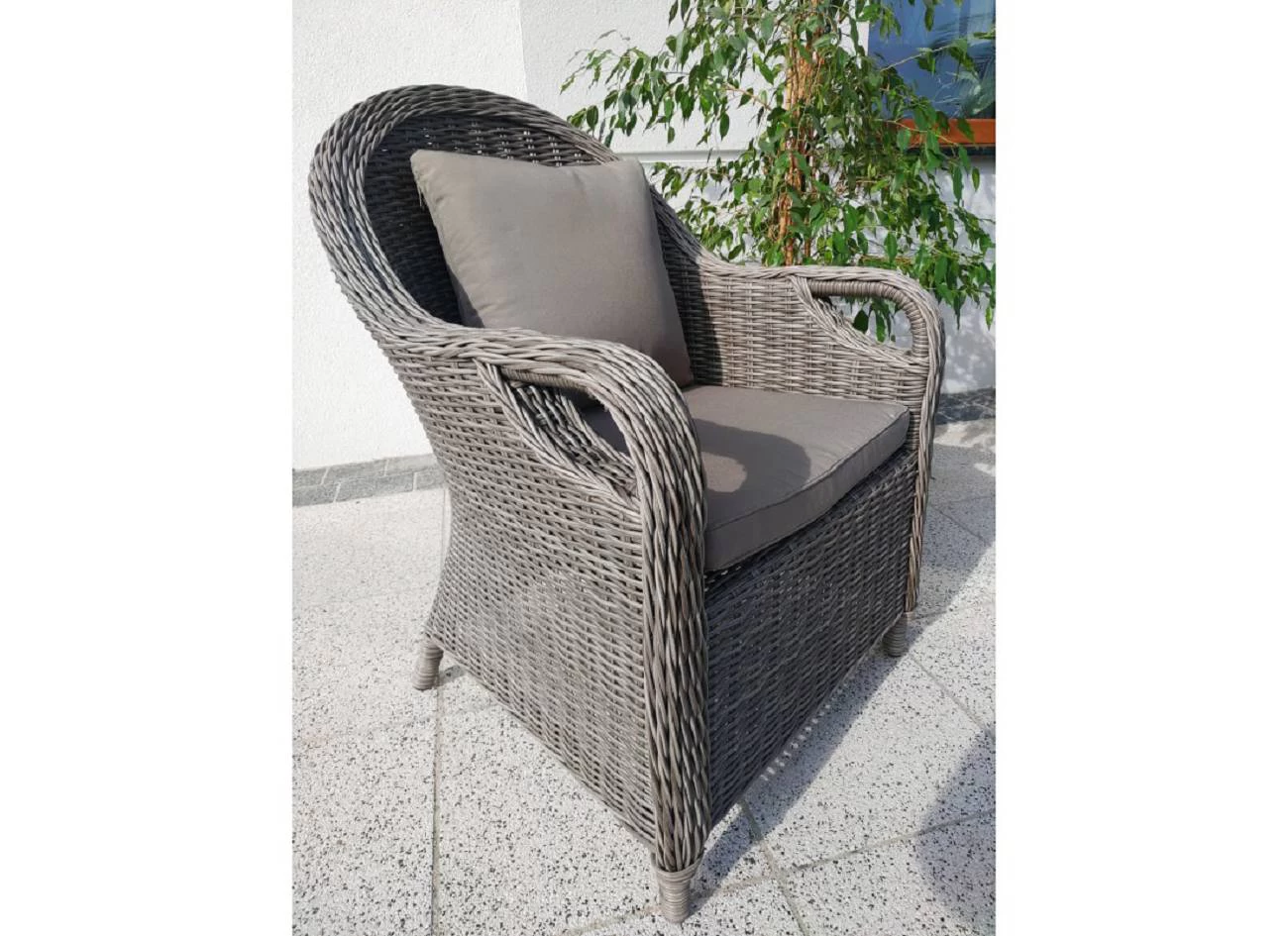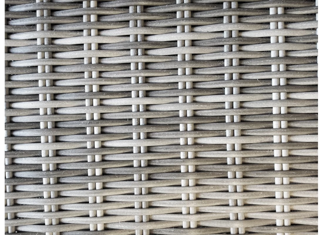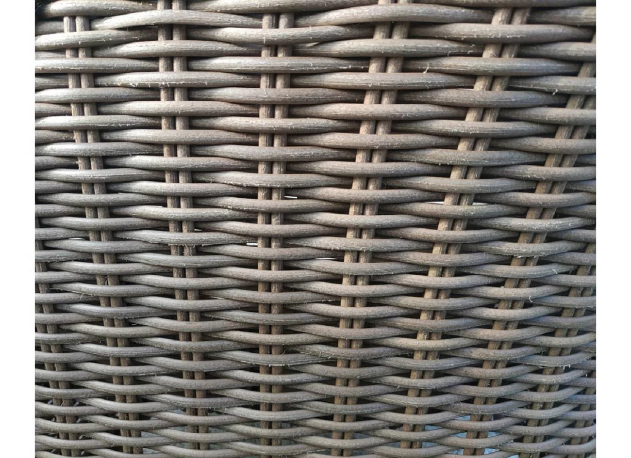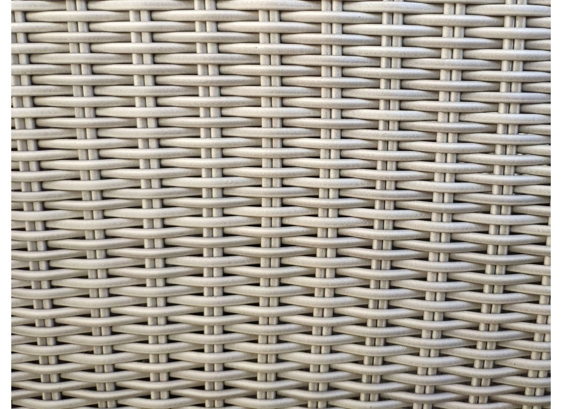 Zestaw technorattanowy w większości wykonane został z półokrągłej plecionki, natomiast ranty foteli wykończone są ozdobnym warkoczem z rattanu okrągłego.