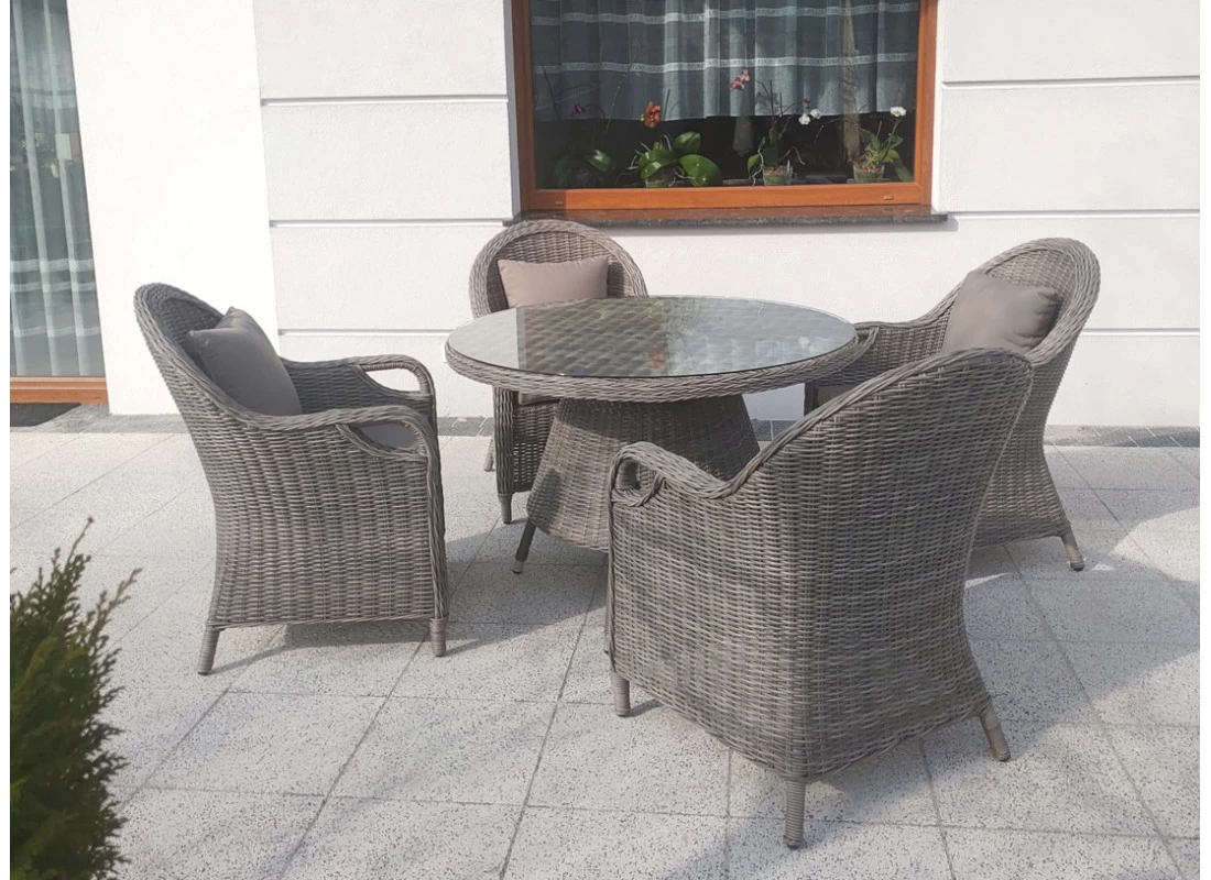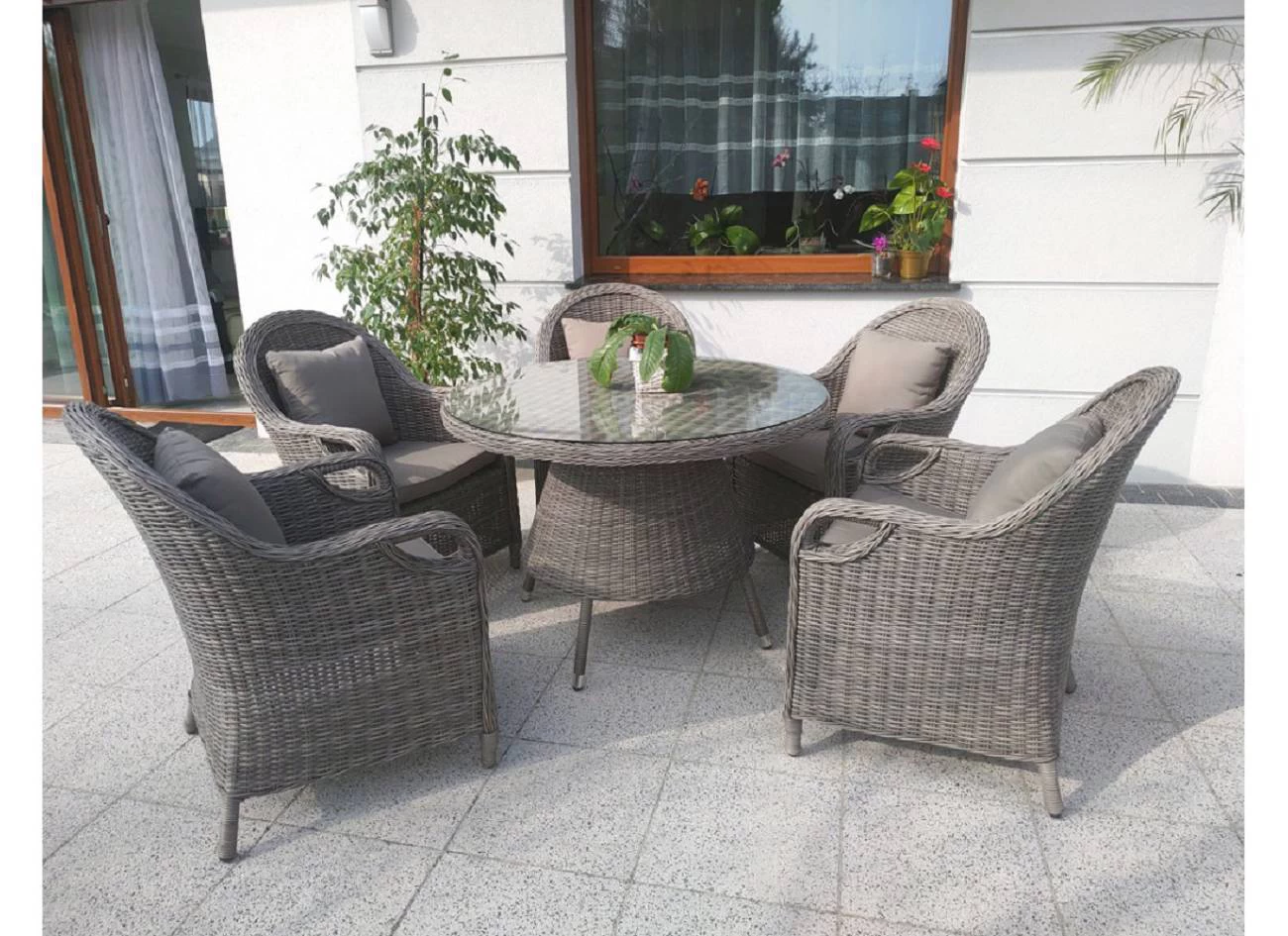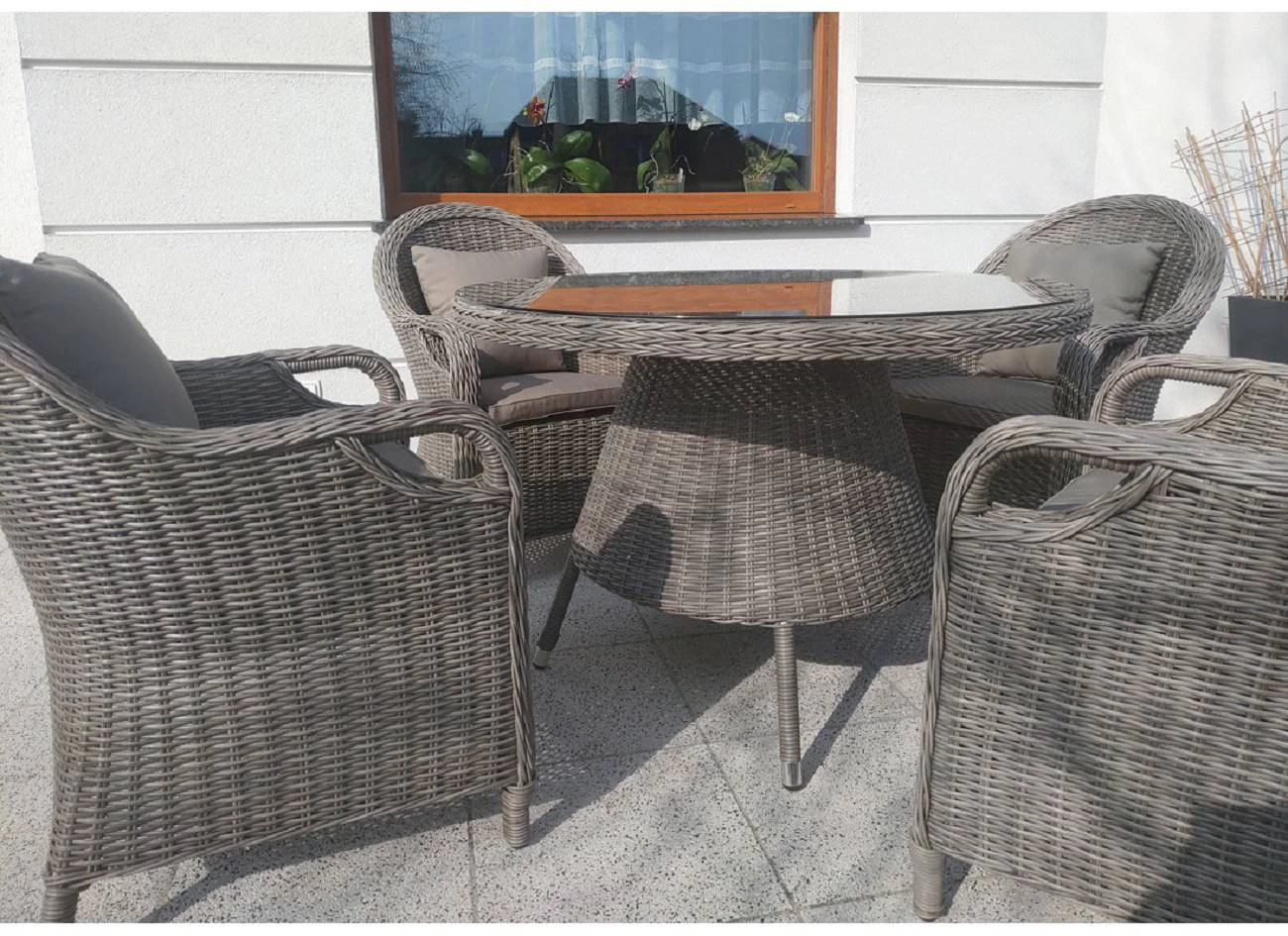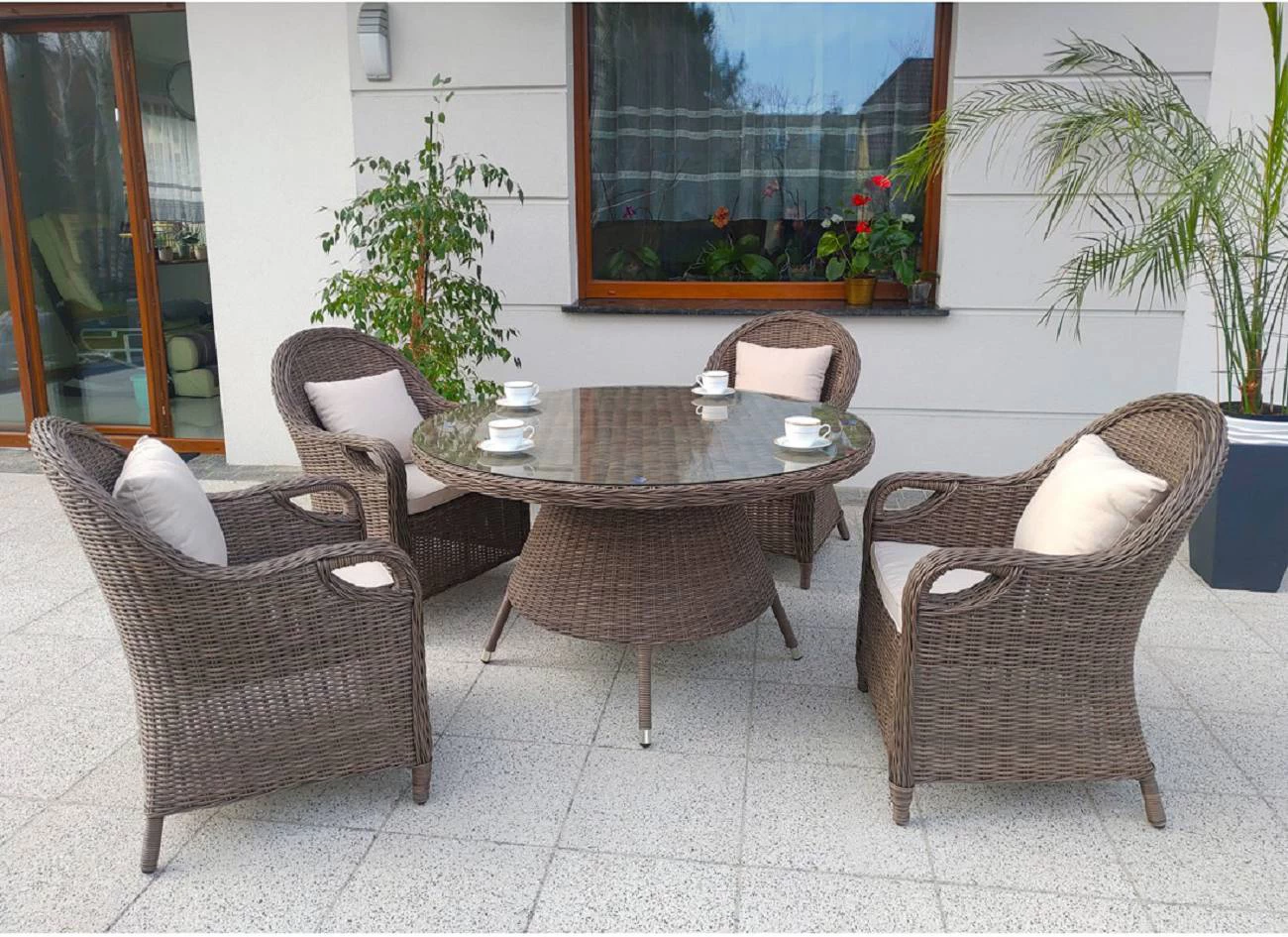 Zestaw stołowy ogrodowy z technorattanu to nowoczesny i wytrzymały zestaw obiadowy składający się z okrągłego stołu oraz wygodnych klasycznych foteli.