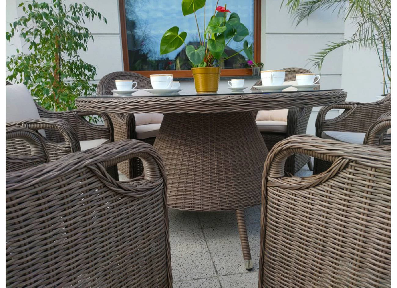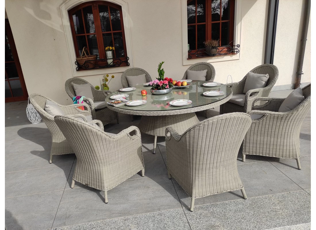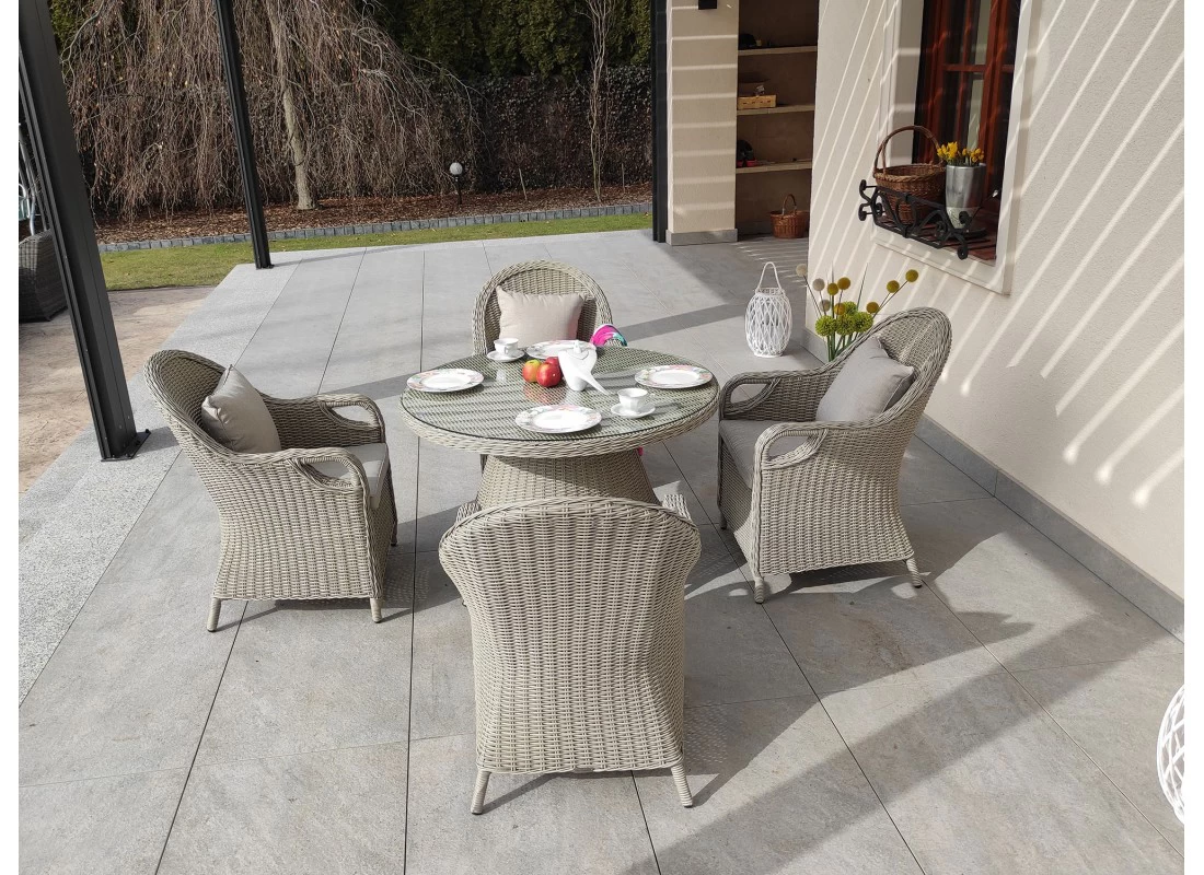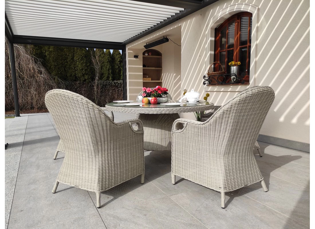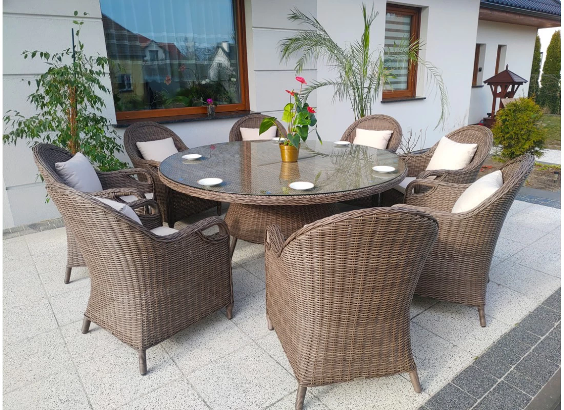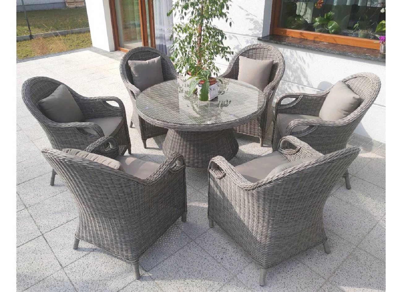 Zestaw stołowy ogrodowy z technorattanu to nowoczesny i wytrzymały zestaw obiadowy składający się z okrągłego stołu oraz wygodnych klasycznych foteli.