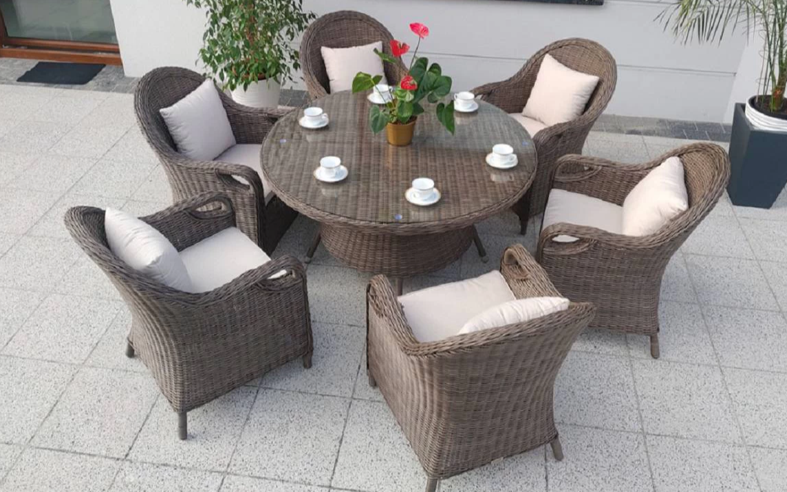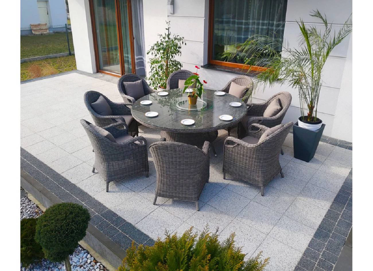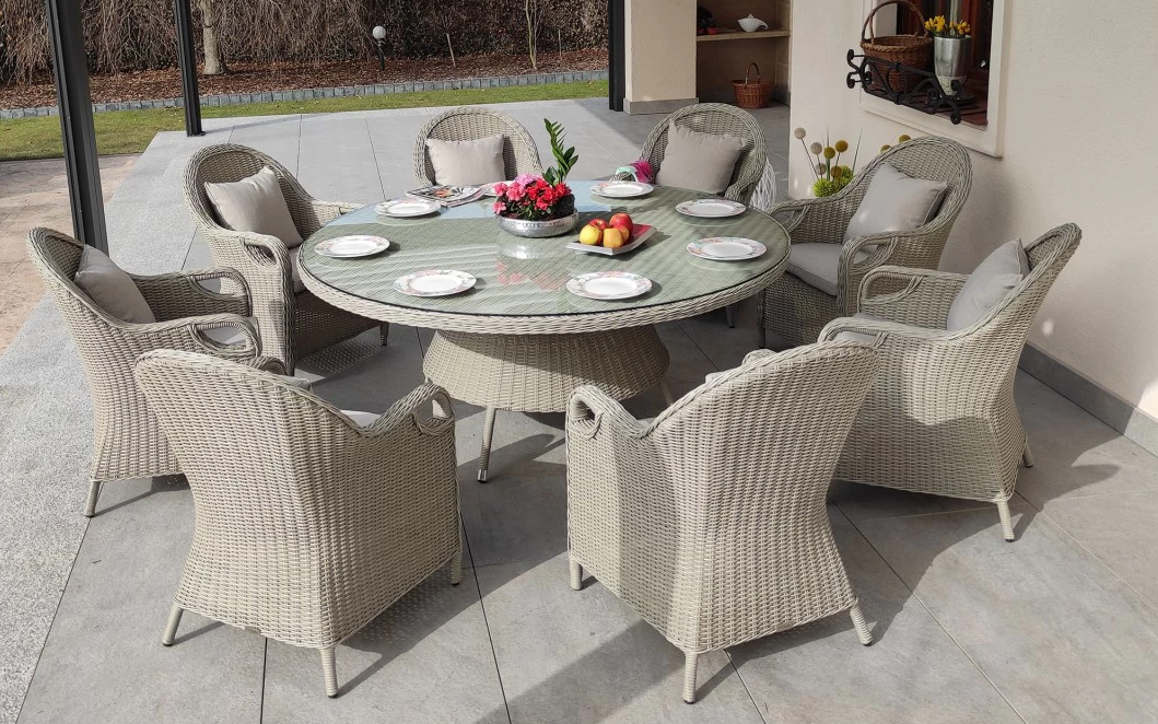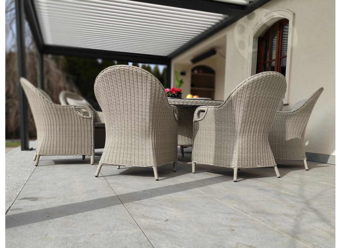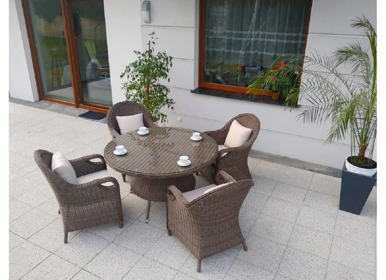 Zestaw stołowy ogrodowy z technorattanu to nowoczesny i wytrzymały zestaw obiadowy składający się z okrągłego stołu oraz wygodnych klasycznych foteli.