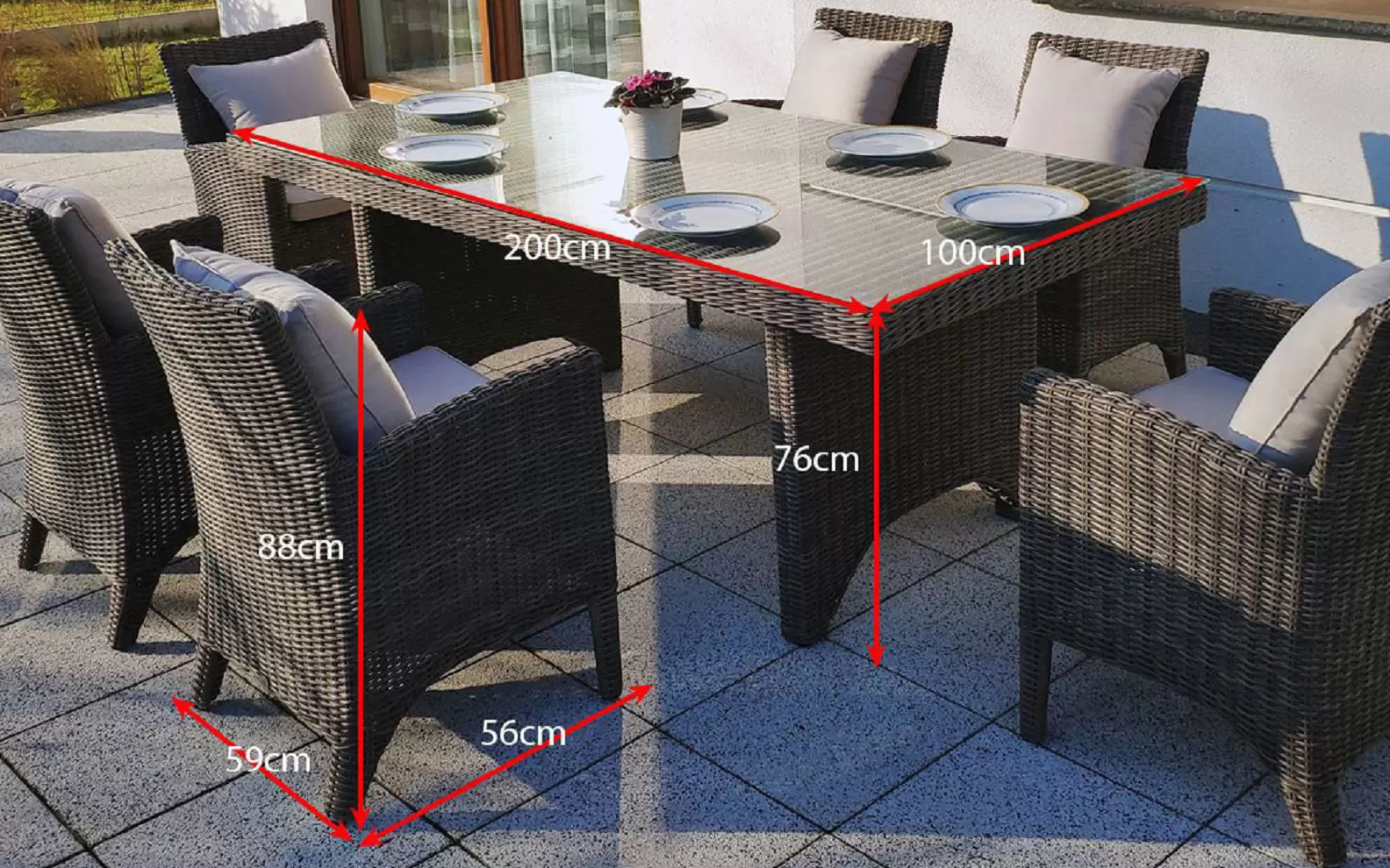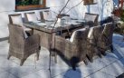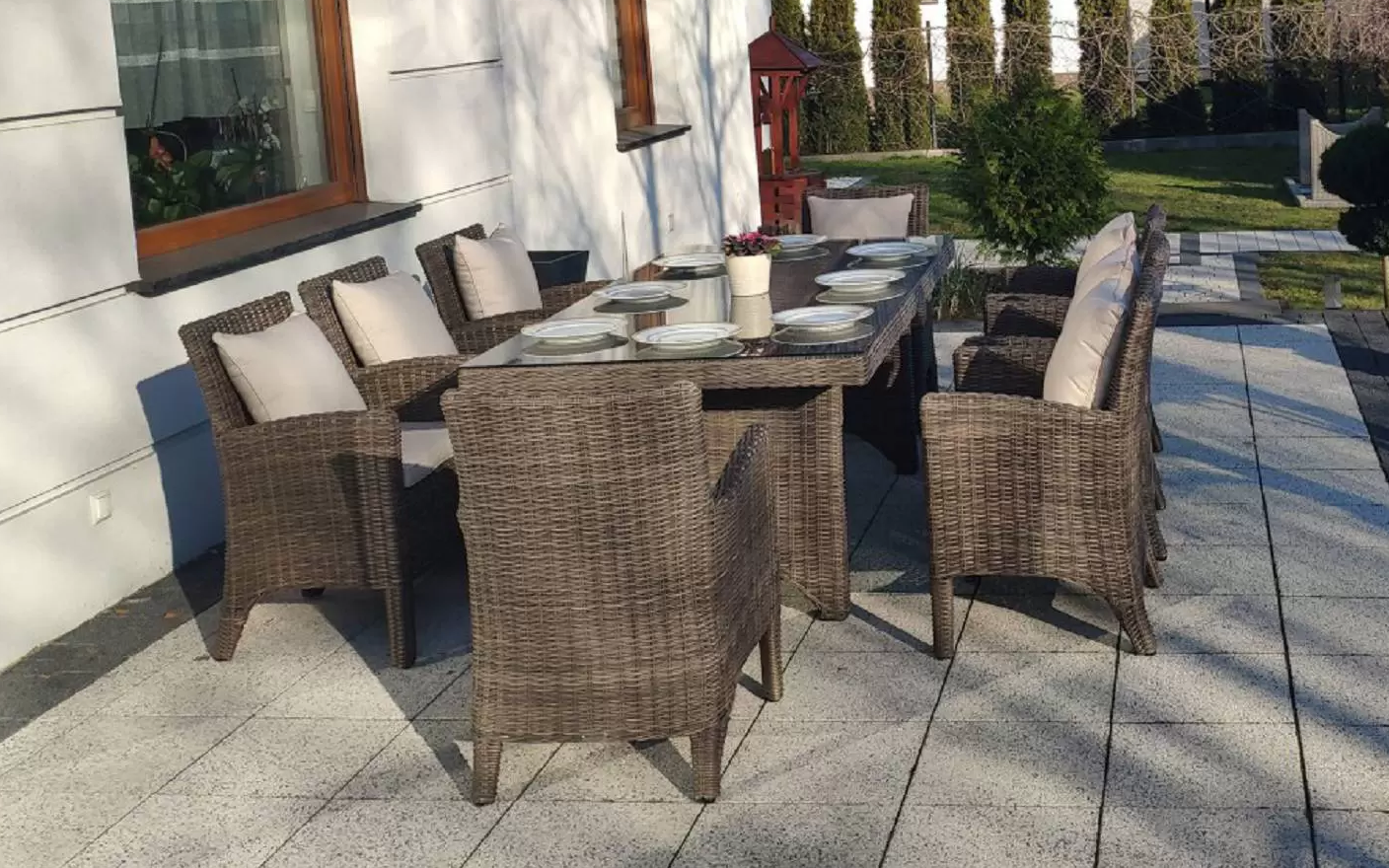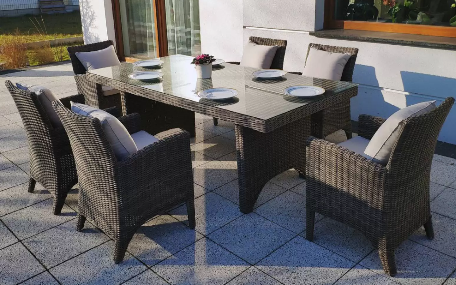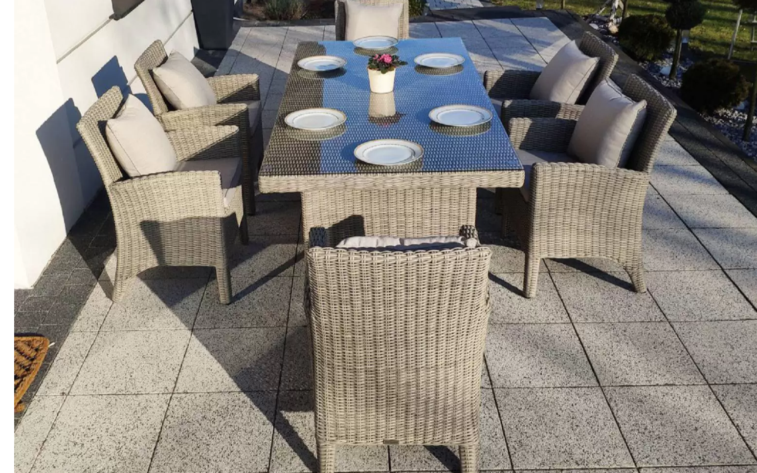Propozycja zestawu stołowego dla 6 osób z prostokątnym stołem 200 cm, który pomieści nawet 8 foteli. Komplet wykonany z półokrągłego technorattanu, który wyróżnia się dużą odpornością na warunki atmosferyczne, dzięki czemu ten zestaw ogrodowy świetnie sprawdzi się w polskich warunkach.