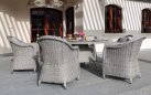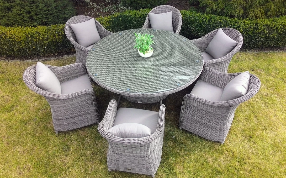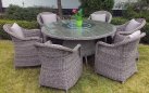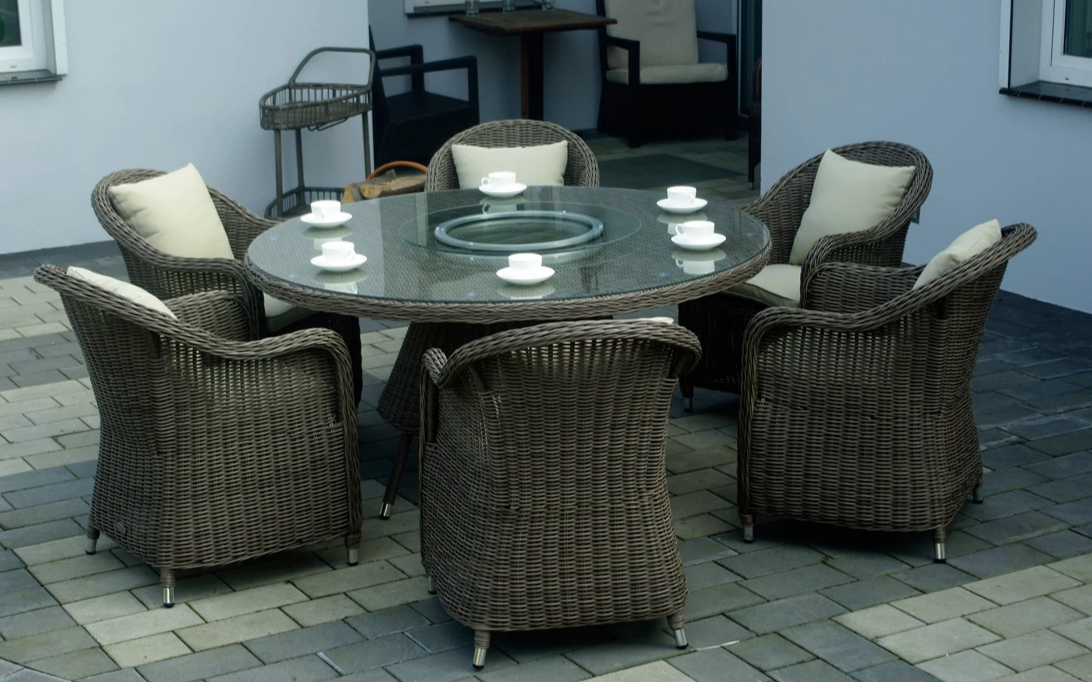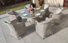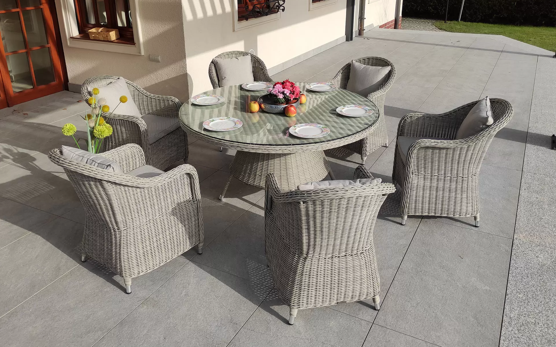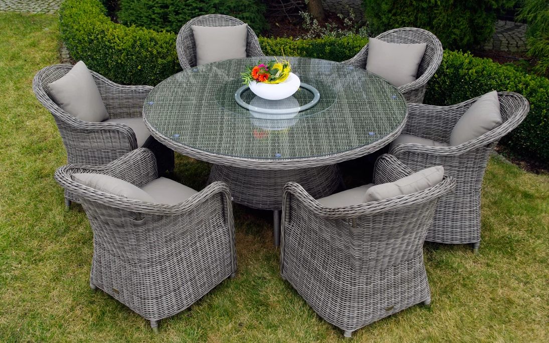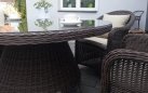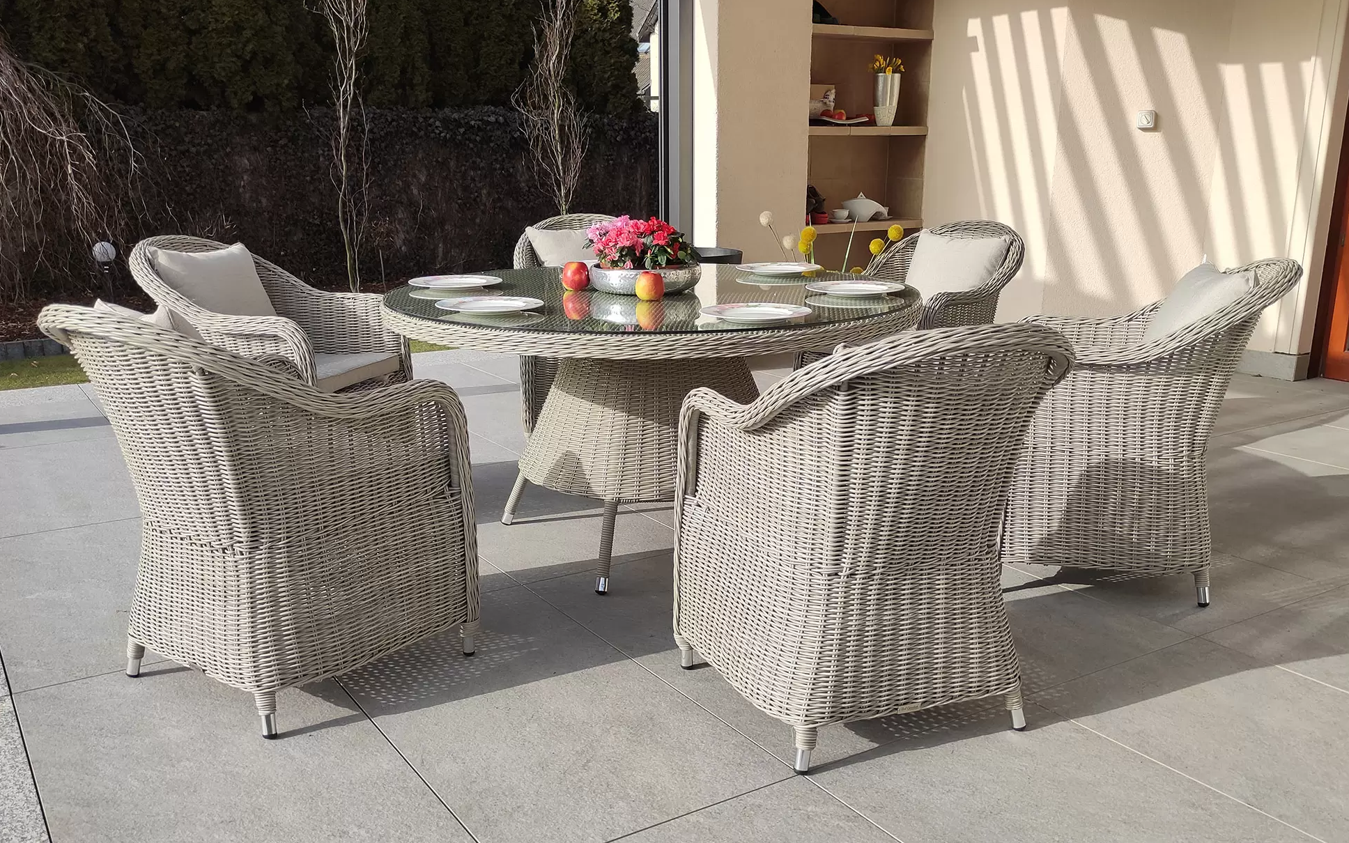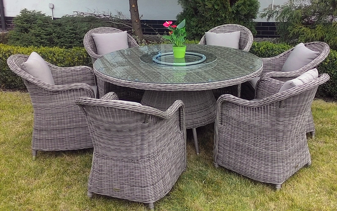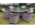 Okrągły stół o śr. 150 cm i 6 klasycznych foteli z poduszkami i jaśkami.