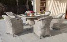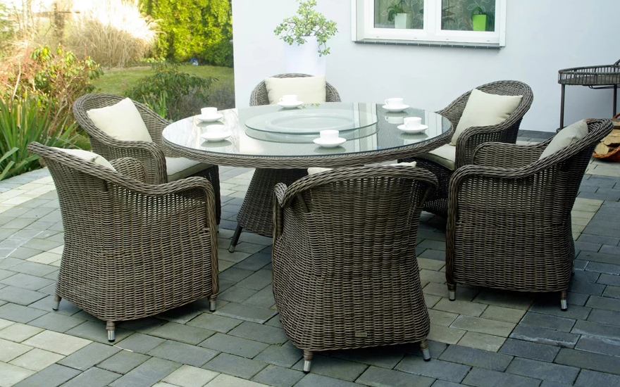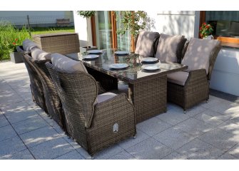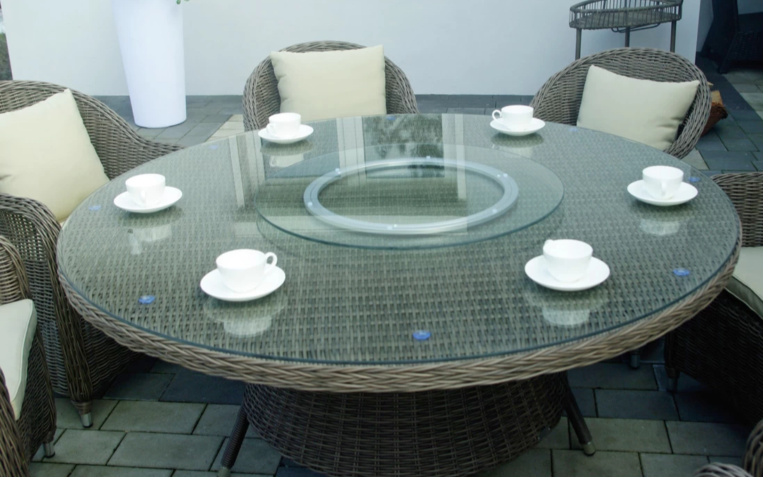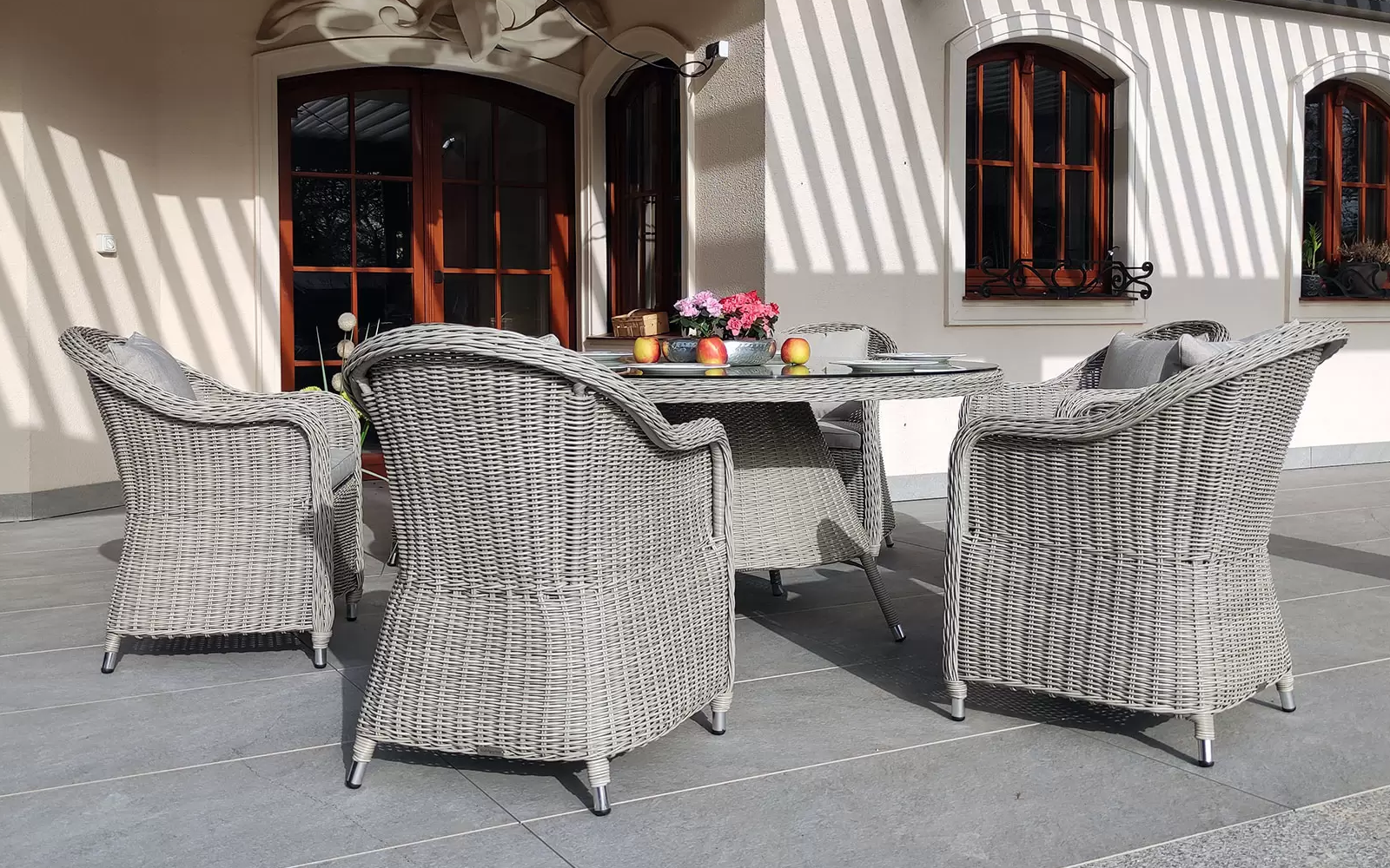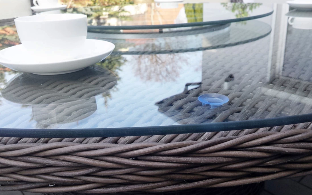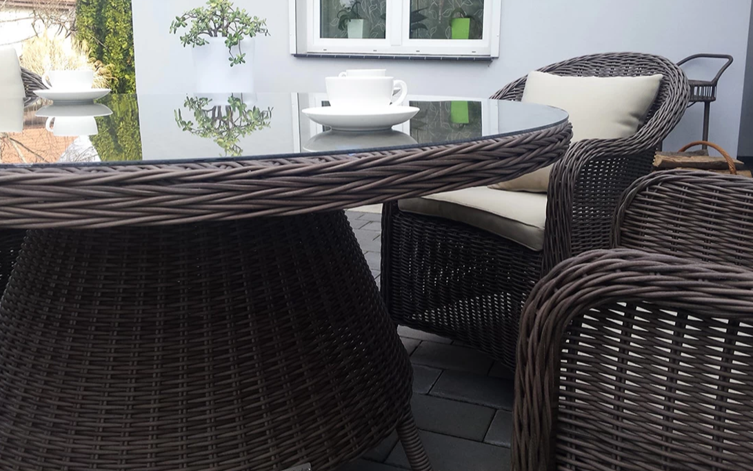 Blat stołu pełny z technorattanu przykryty szkłem hartowanym 5 mm.
