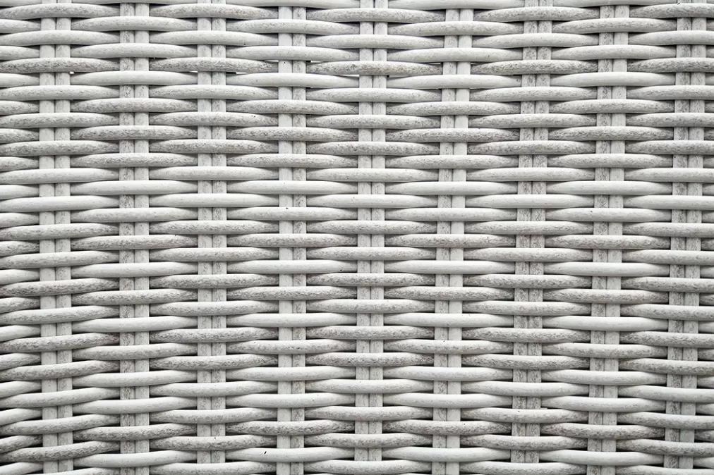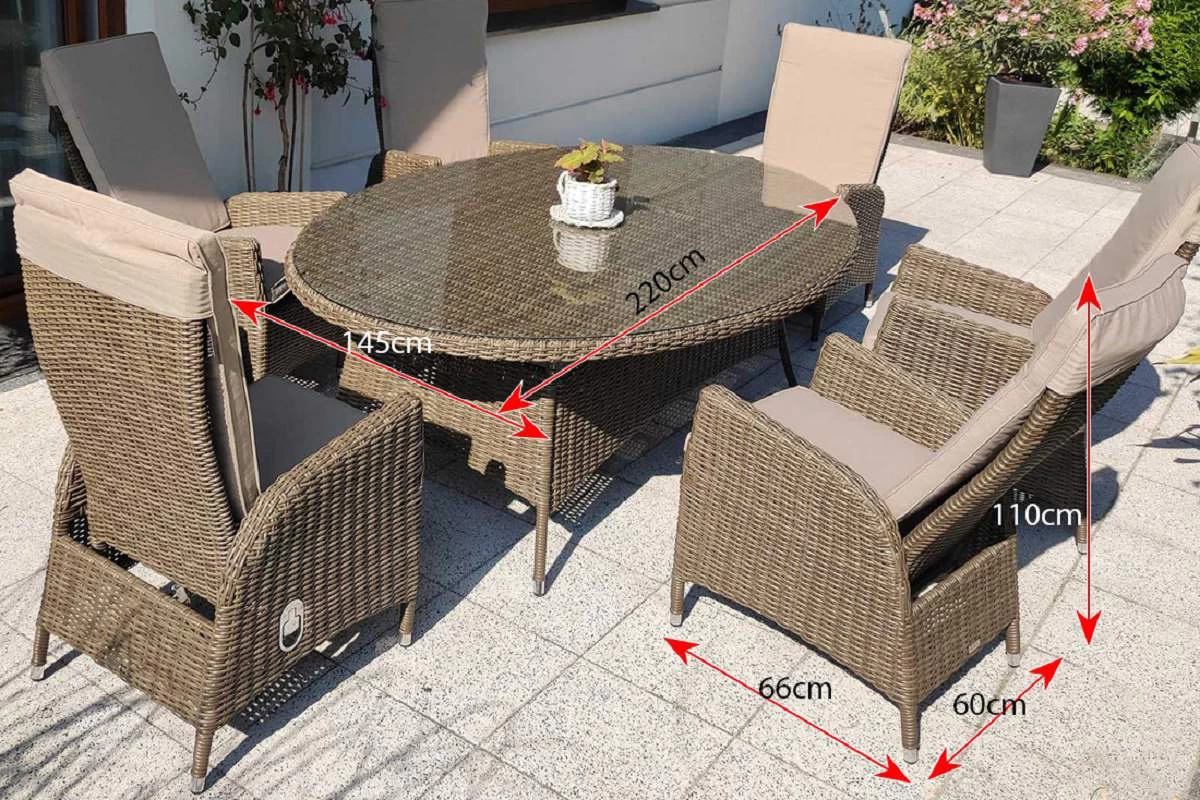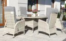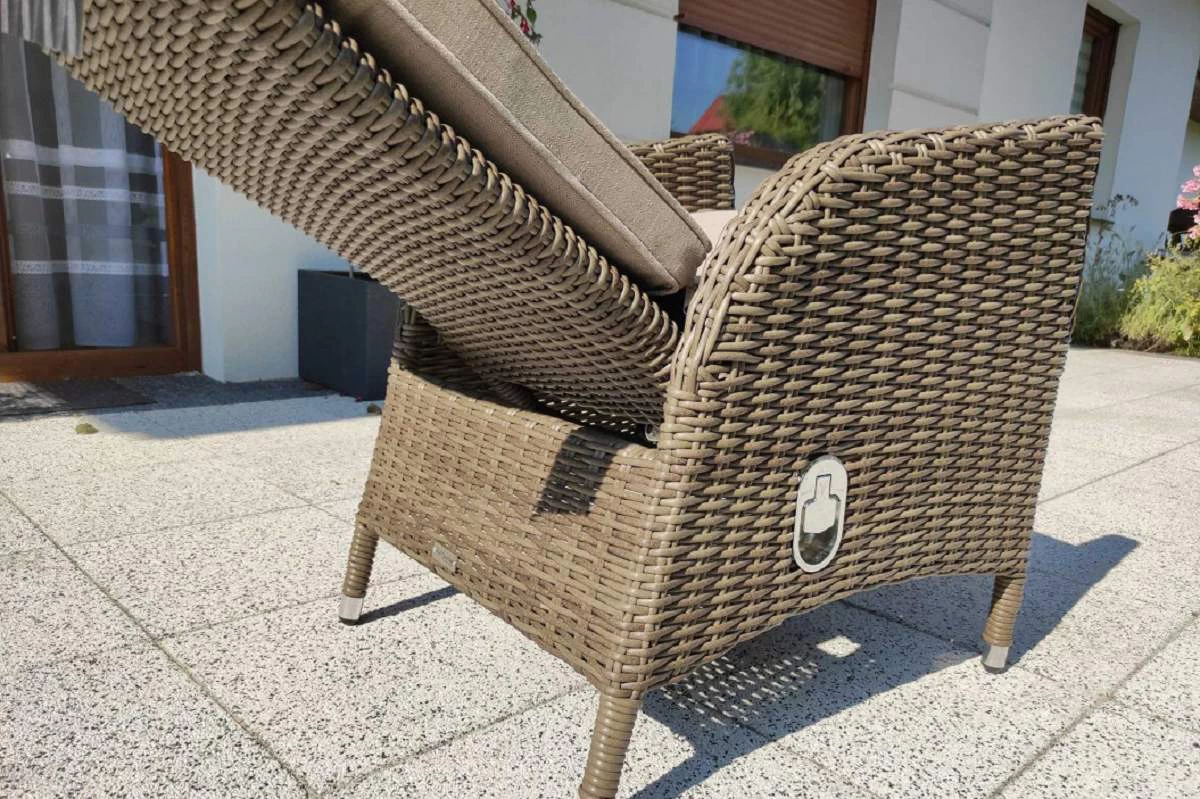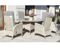 Wykończenie plecionką technorattanową o przekroju półokrągłym (śr. 5 mm). Ranty stołu oraz foteli wykończone są ozdobnym warkoczem z technorattanu okrągłego.