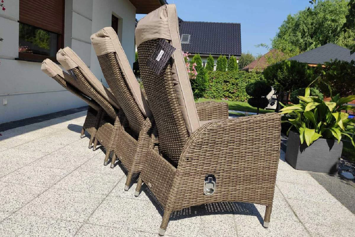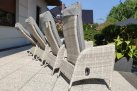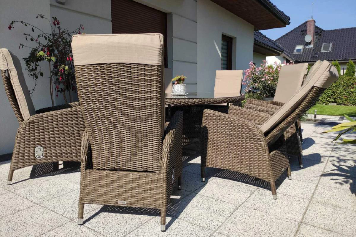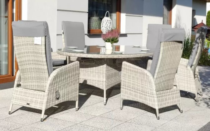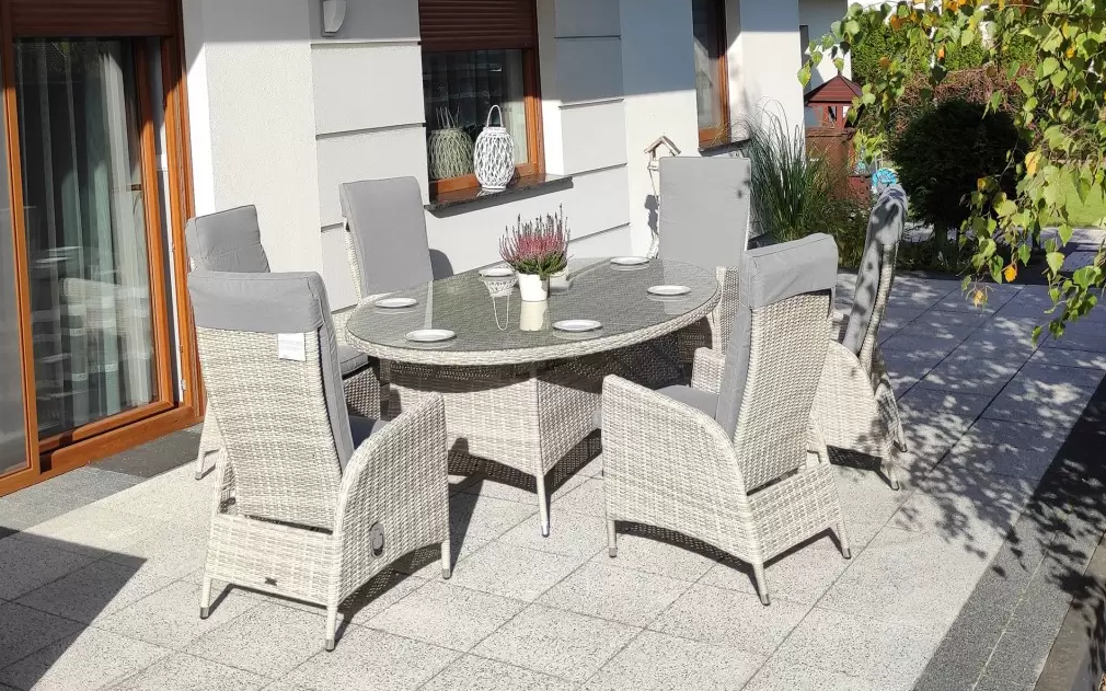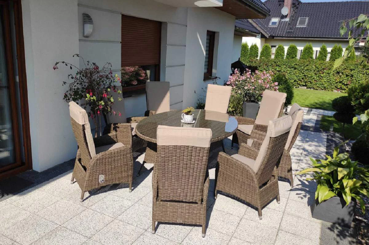Duży komplet mebli obiadowych ogrodowych z wysokimi wygodnymi fotelami. i poduszkami na siedzisku i oparciu.