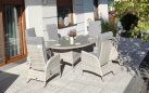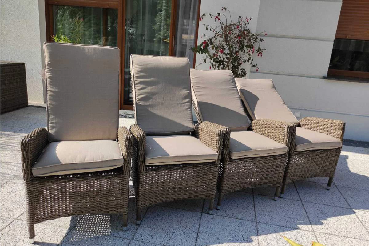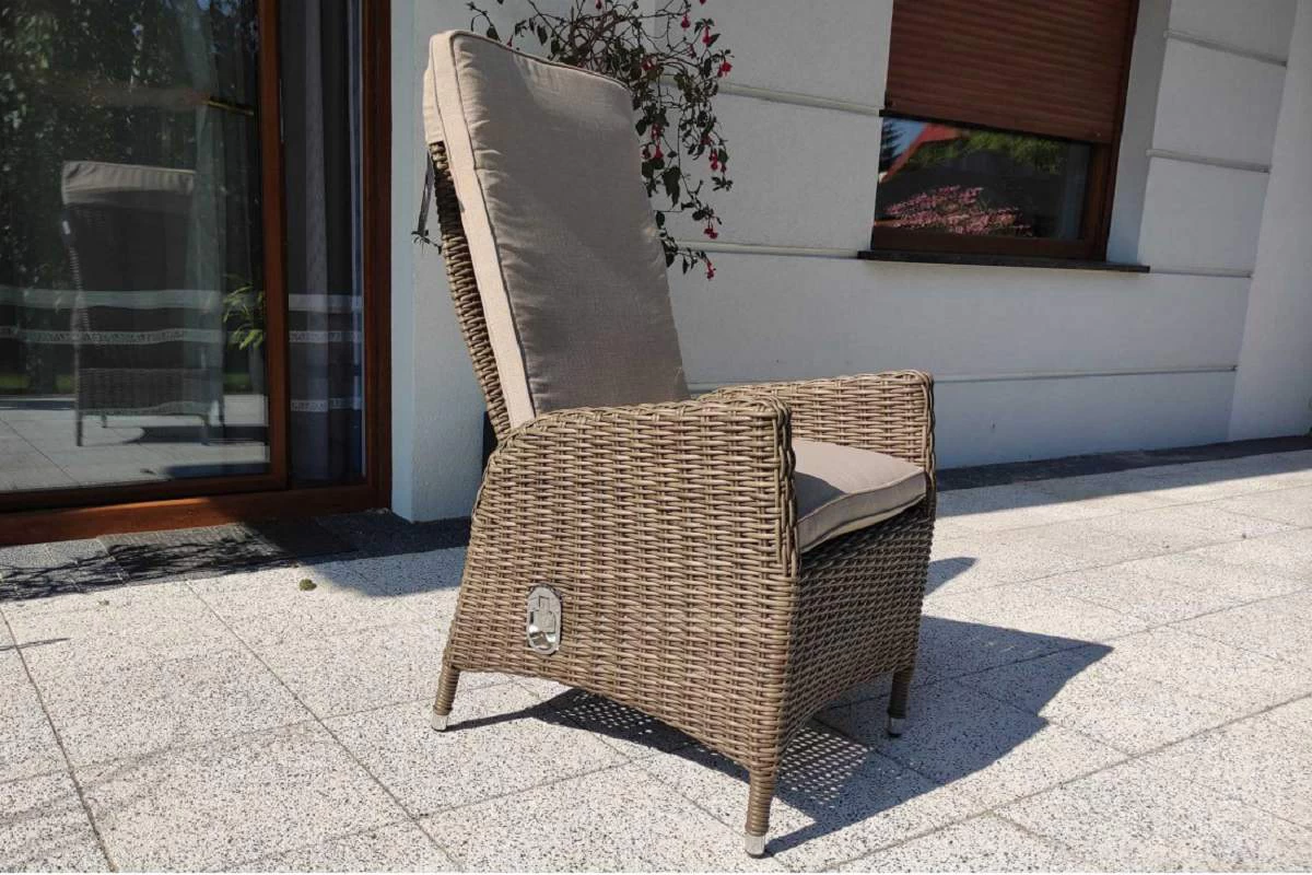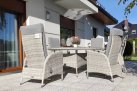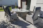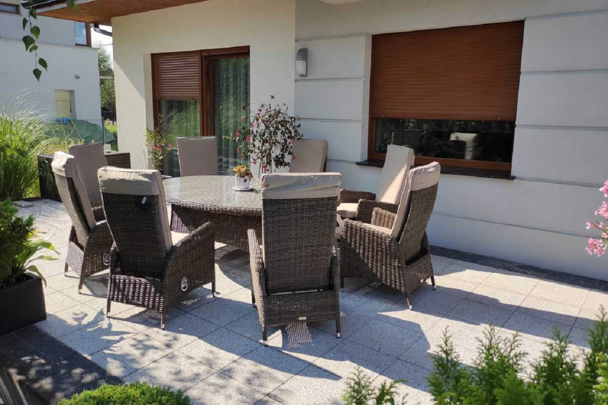 Duży komplet mebli obiadowych ogrodowych z wysokimi wygodnymi fotelami. i poduszkami na siedzisku i oparciu.