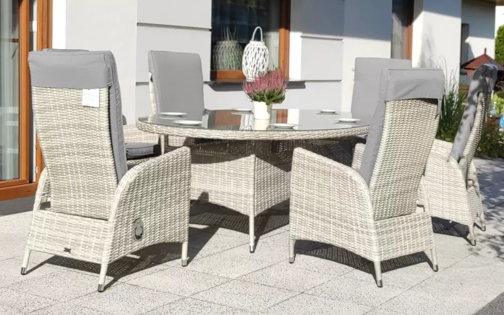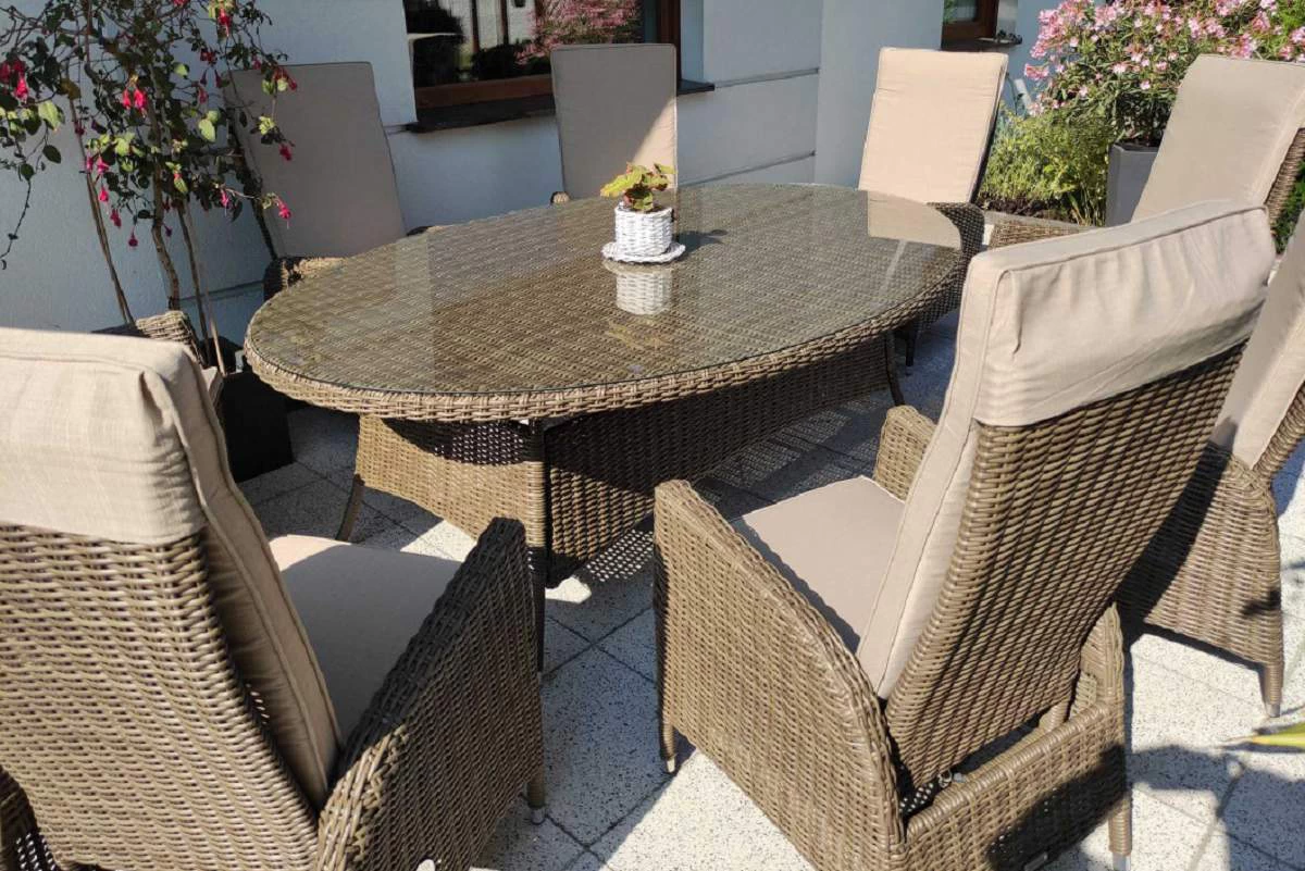 W wysokich temperaturach, w wyniku działania promieni słonecznych może występować efekt "falującego" rattanu na blacie stołu. Dzieje się tak z powodu skupiania energii słonecznej przez szybę. Efekt ten jest odwracalny - obniżenie temperatury, skutkuje natychmiastowym powrotem do pierwotnego stanu. Zalecamy ustawić zestaw pod zadaszeniem lub w zacienionym miejscu.