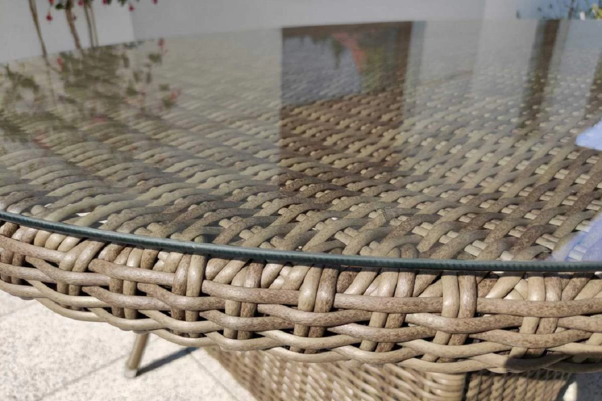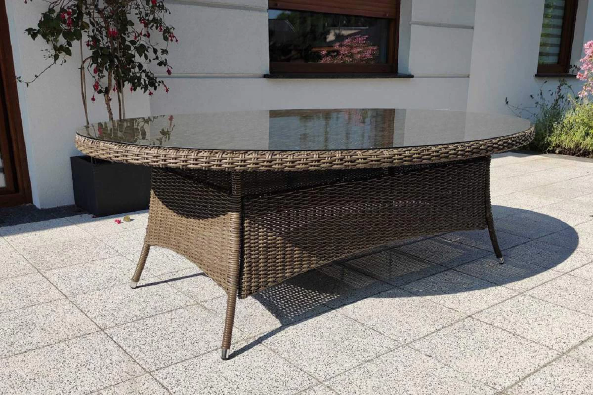 Stół z blatem wykonanym z technorattanu przykryty szkłem hartowanym o grubości 5 mm.
