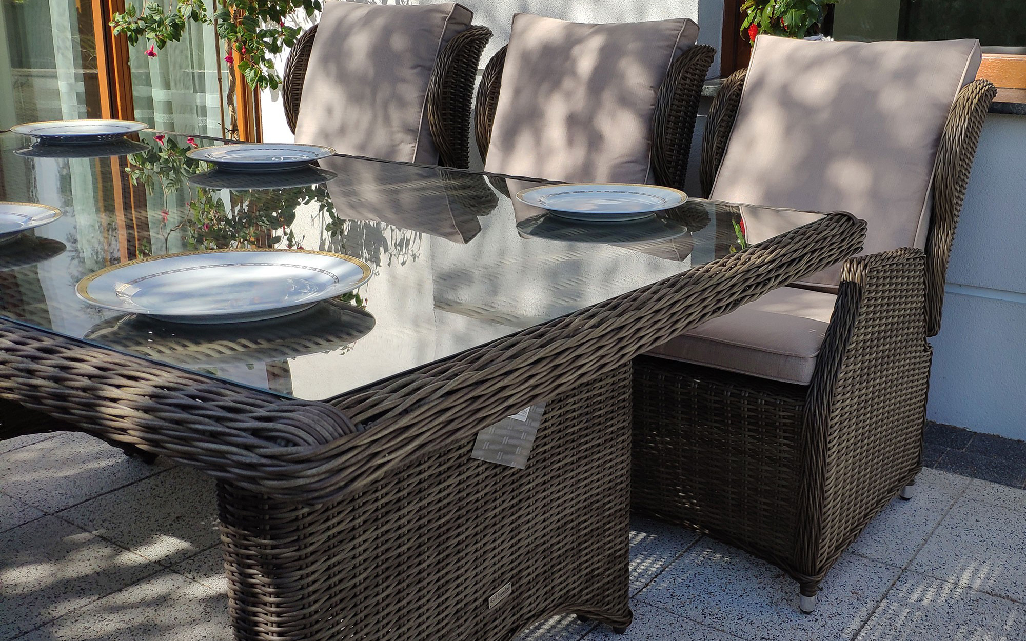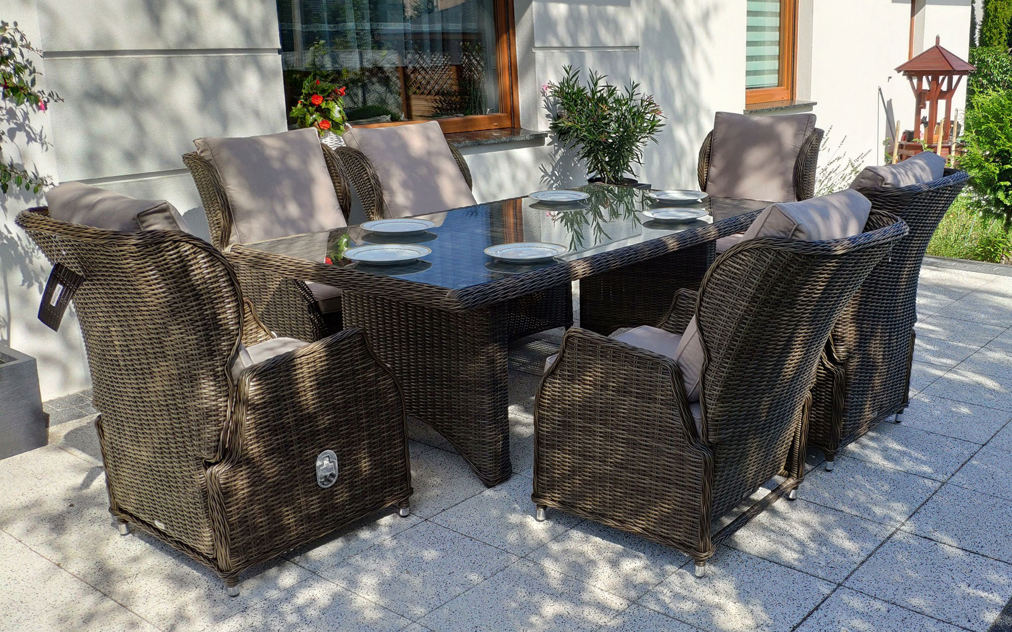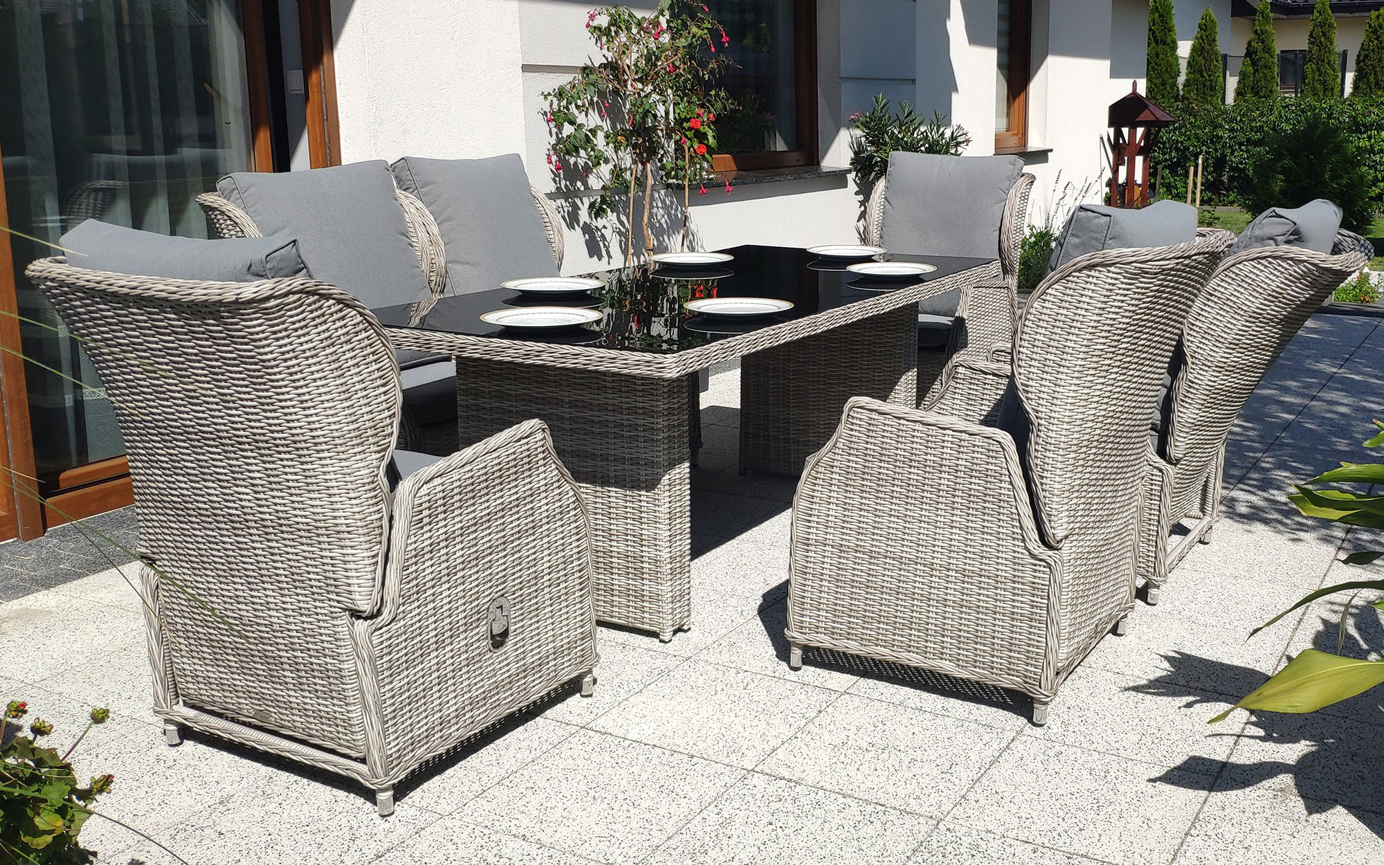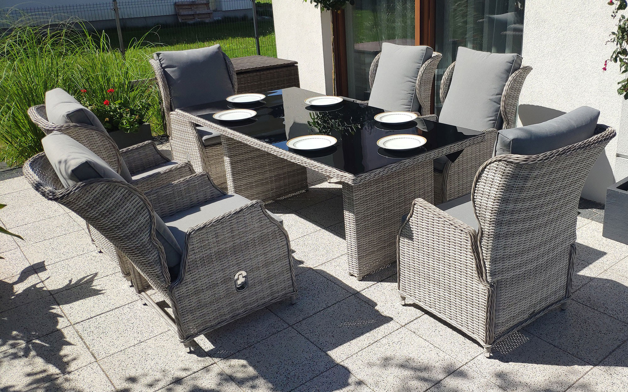 Duży stół prostokątny w o długości 200 pomieści od 6 do 8 osób, a wygodne, rozkładane fotele pozwolą zarówno zjeść obiad na świeżym powietrzu jak i odpocząć po nim w relaksującej pozycji.