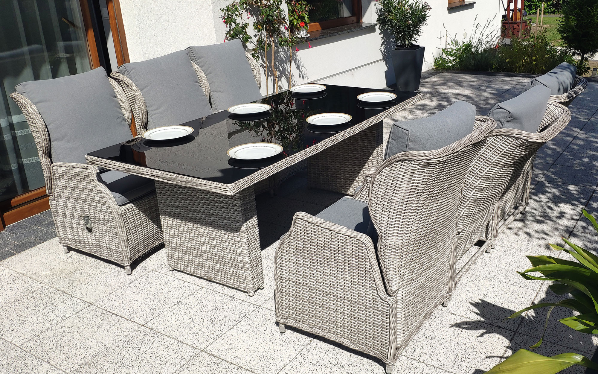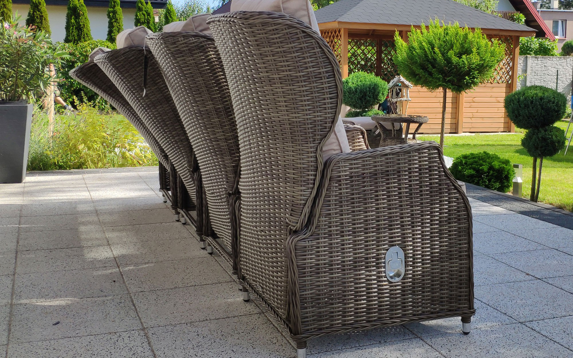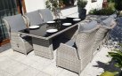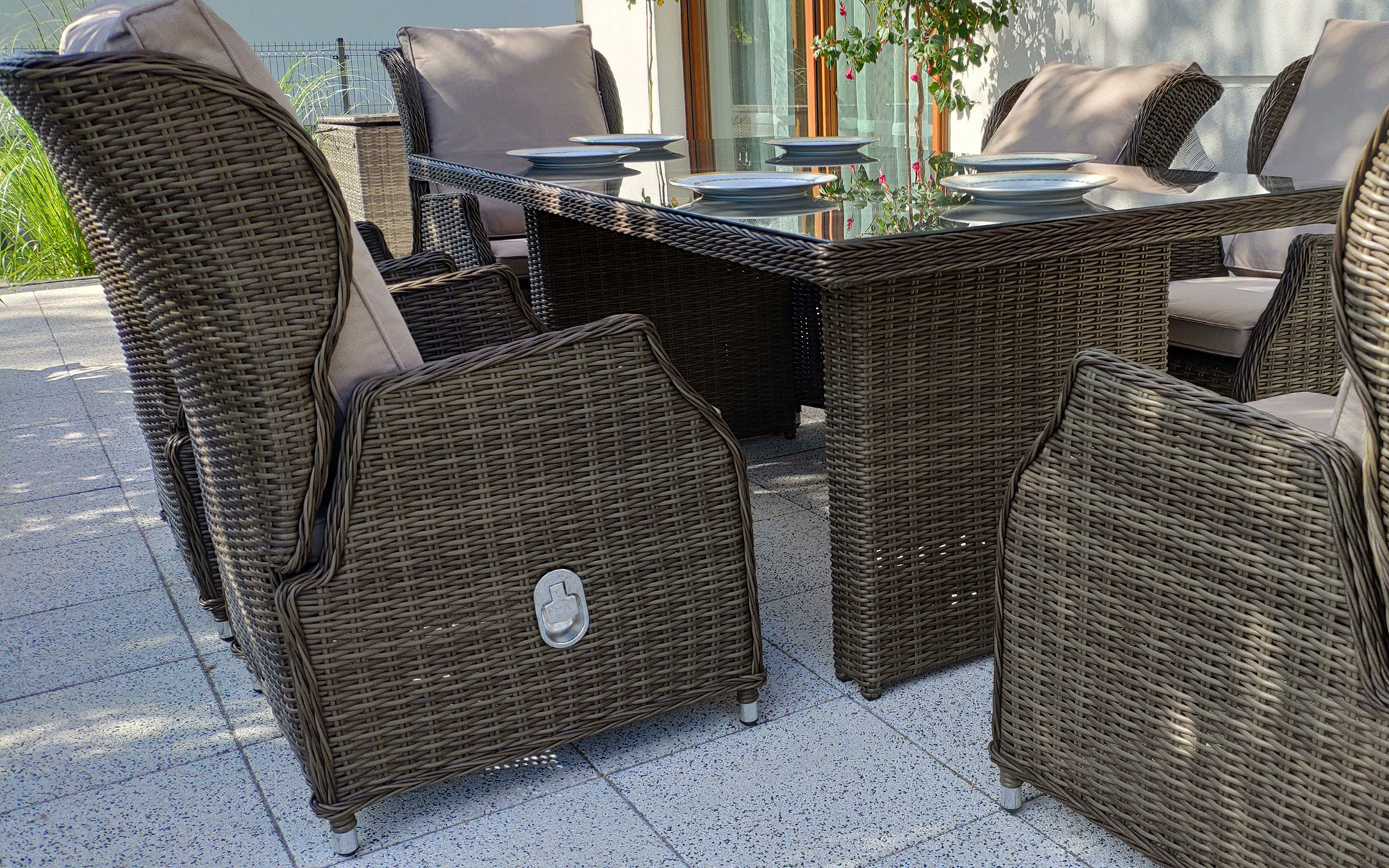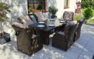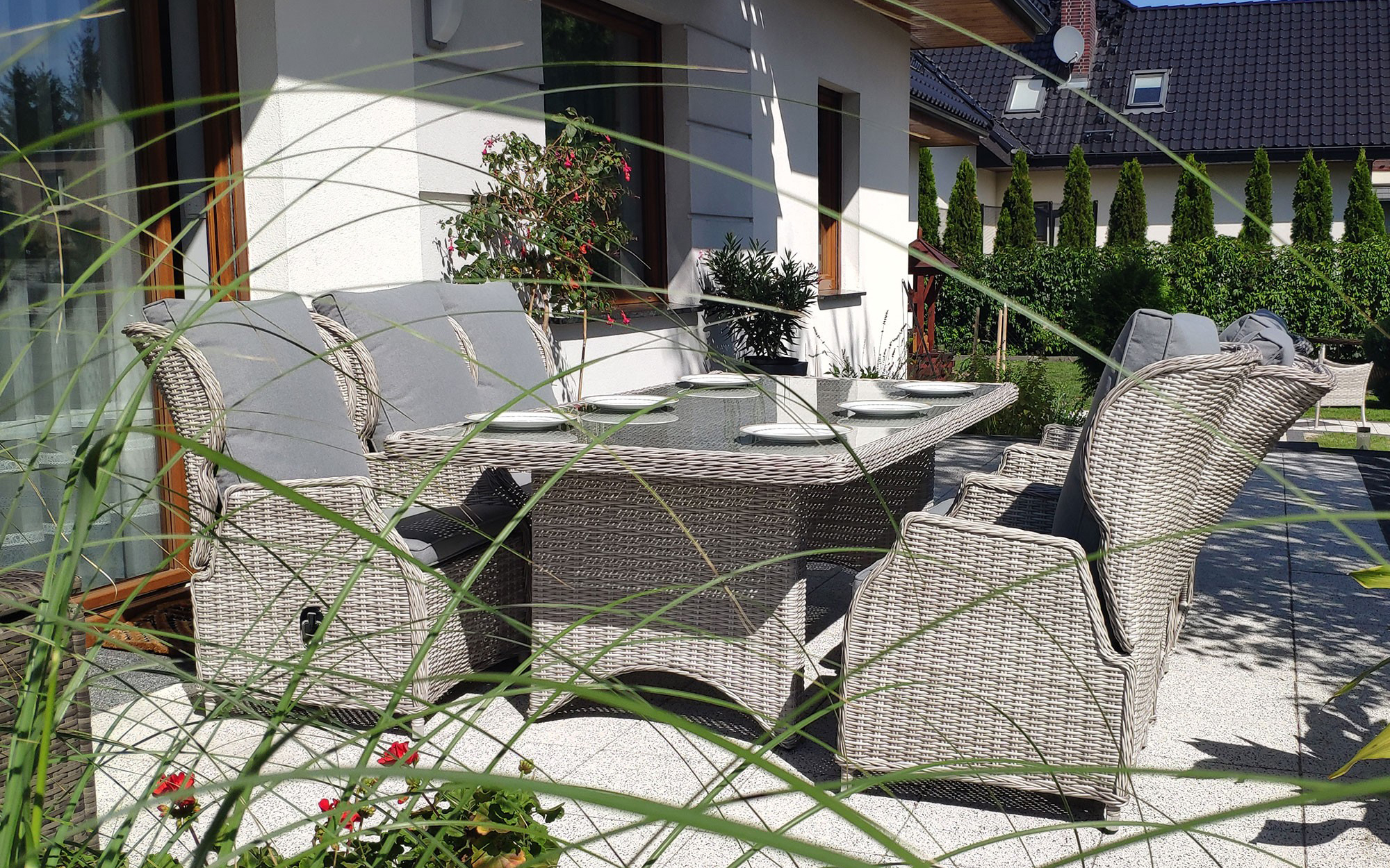 Duży stół prostokątny w o długości 200 pomieści od 6 do 8 osób, a wygodne, rozkładane fotele pozwolą zarówno zjeść obiad na świeżym powietrzu jak i odpocząć po nim w relaksującej pozycji.