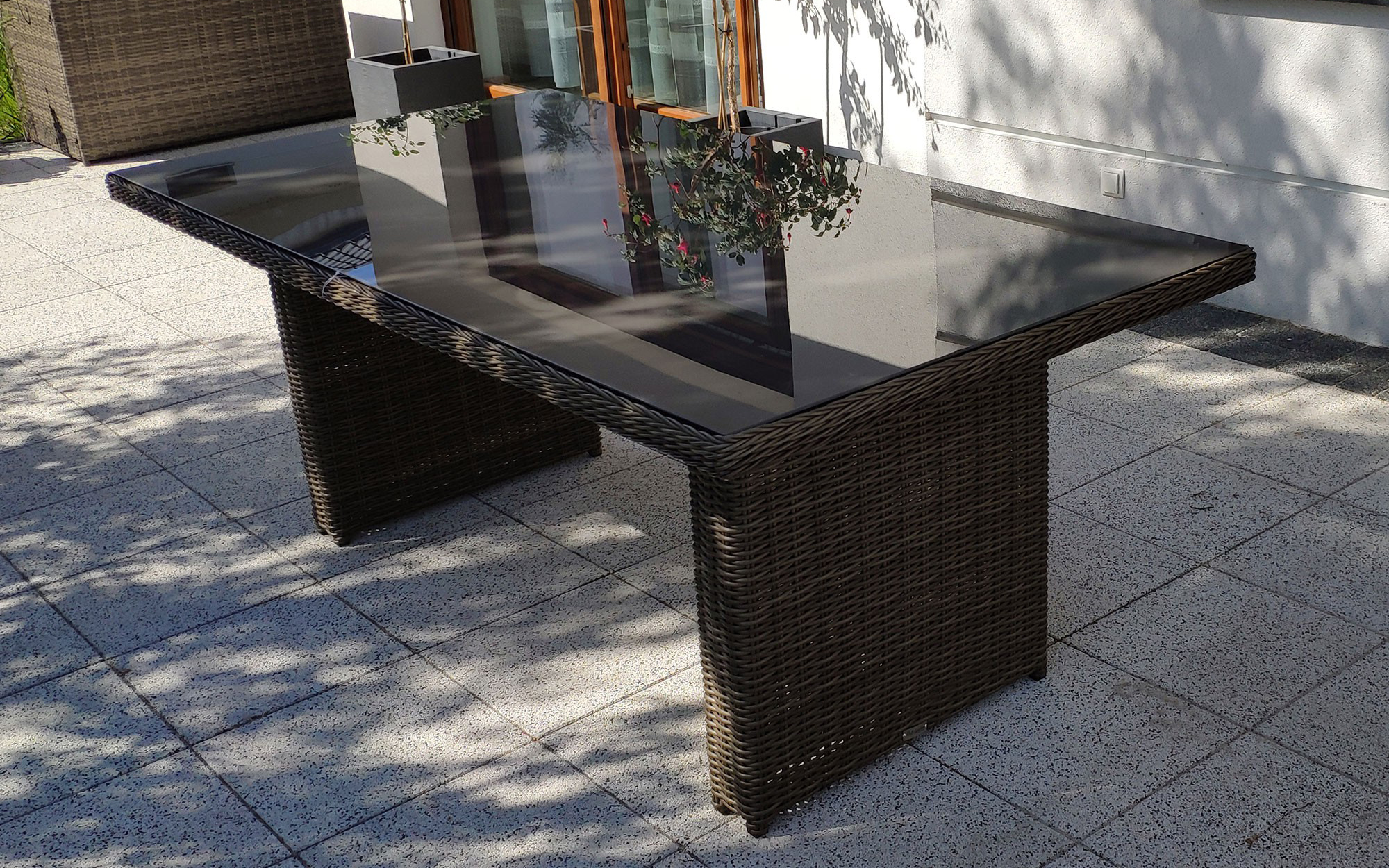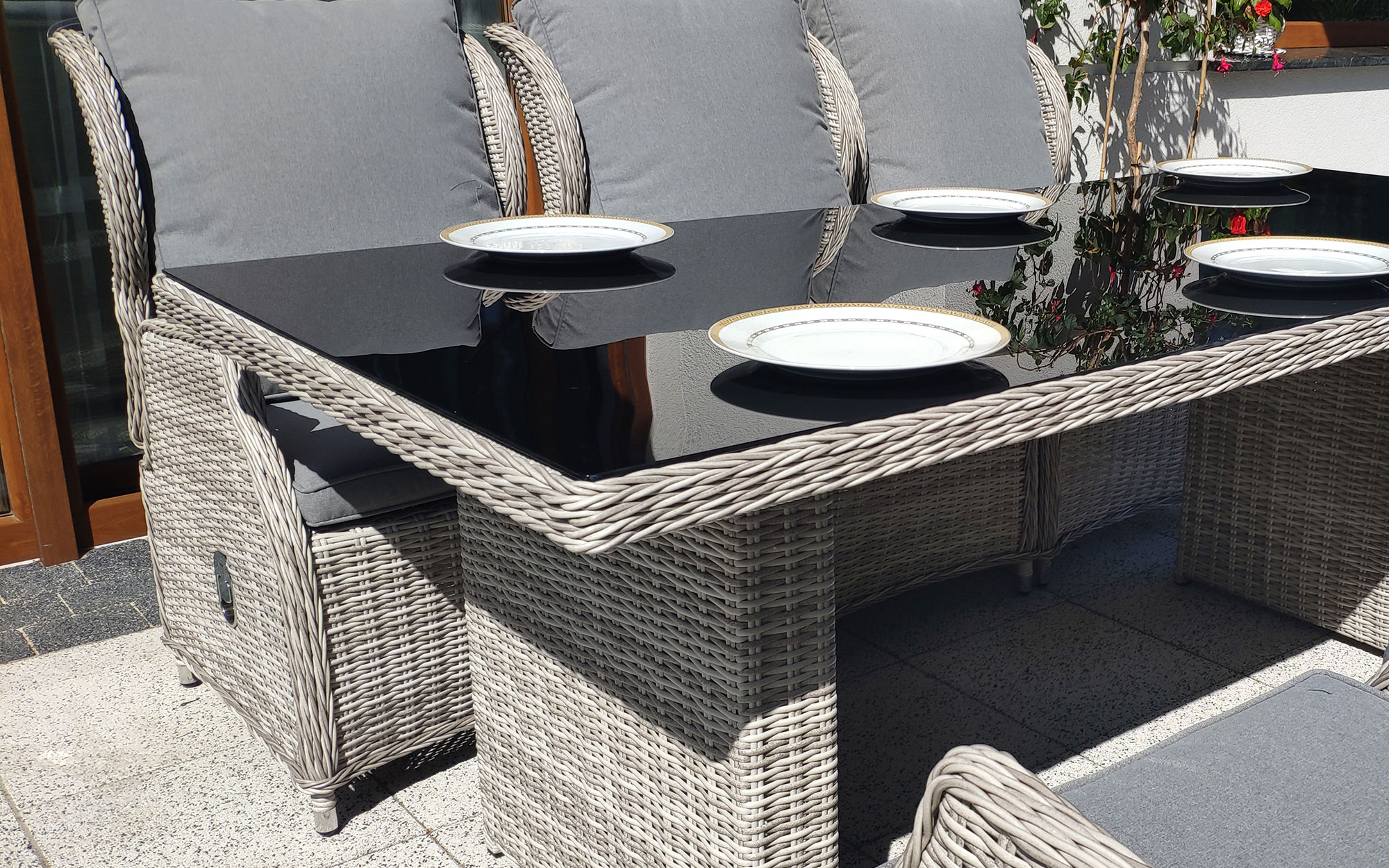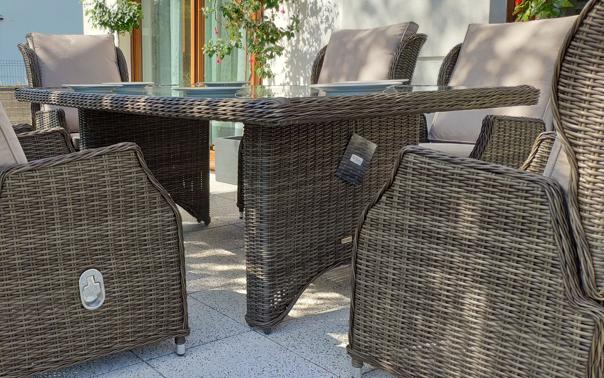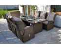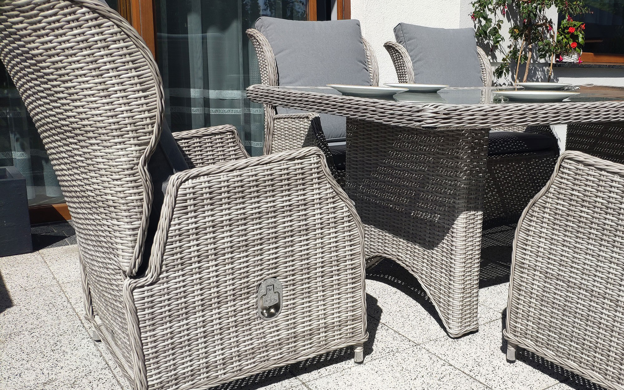 Duży stół prostokątny w o długości 200 pomieści od 6 do 8 osób, a wygodne, rozkładane fotele pozwolą zarówno zjeść obiad na świeżym powietrzu jak i odpocząć po nim w relaksującej pozycji.