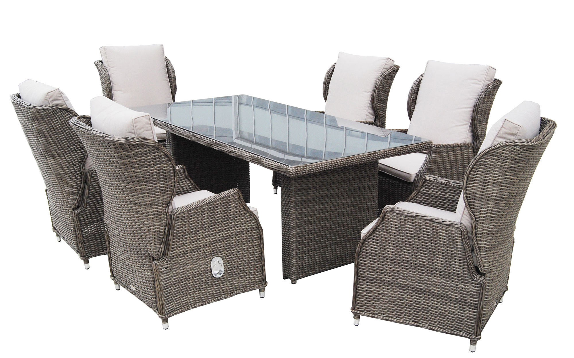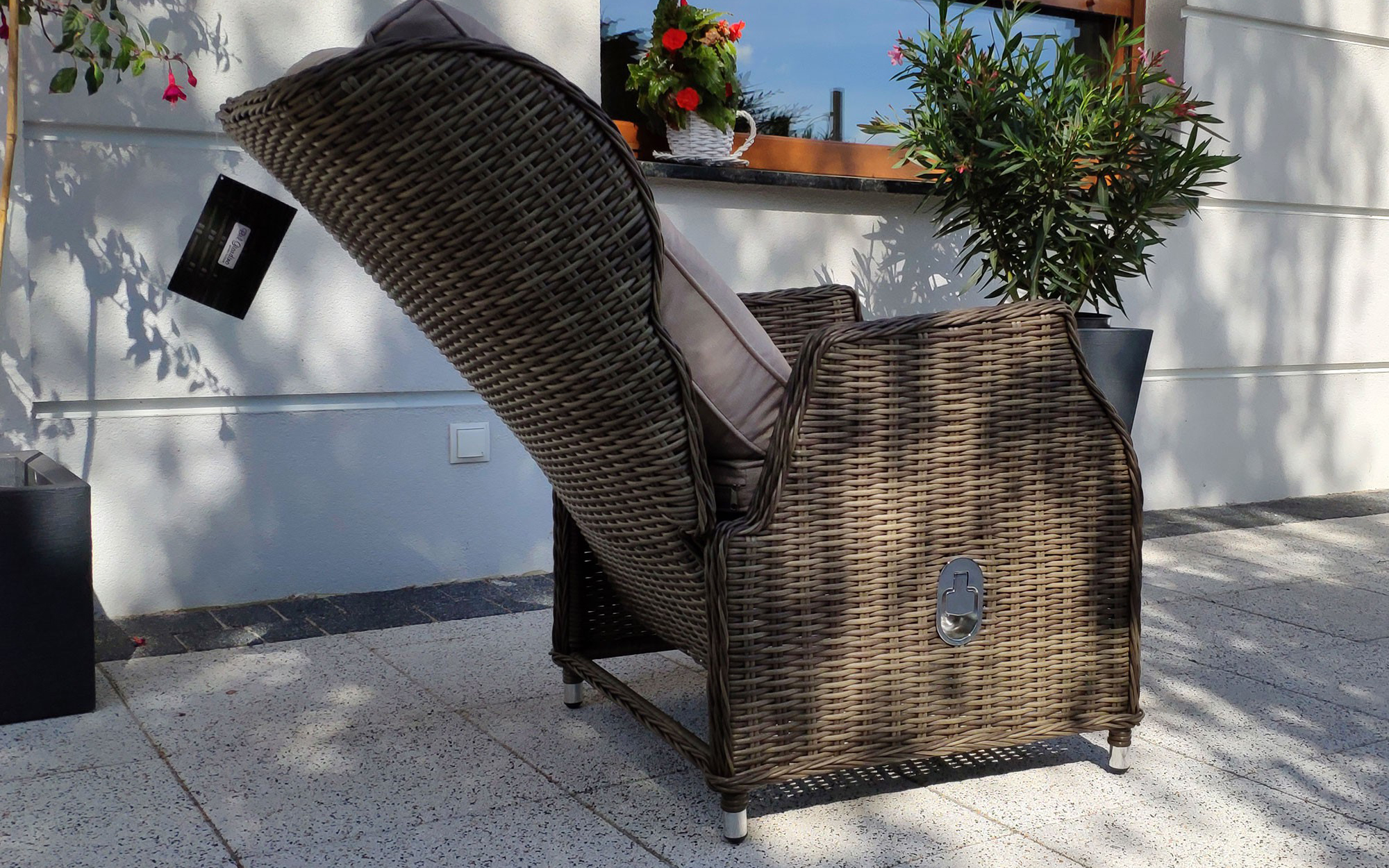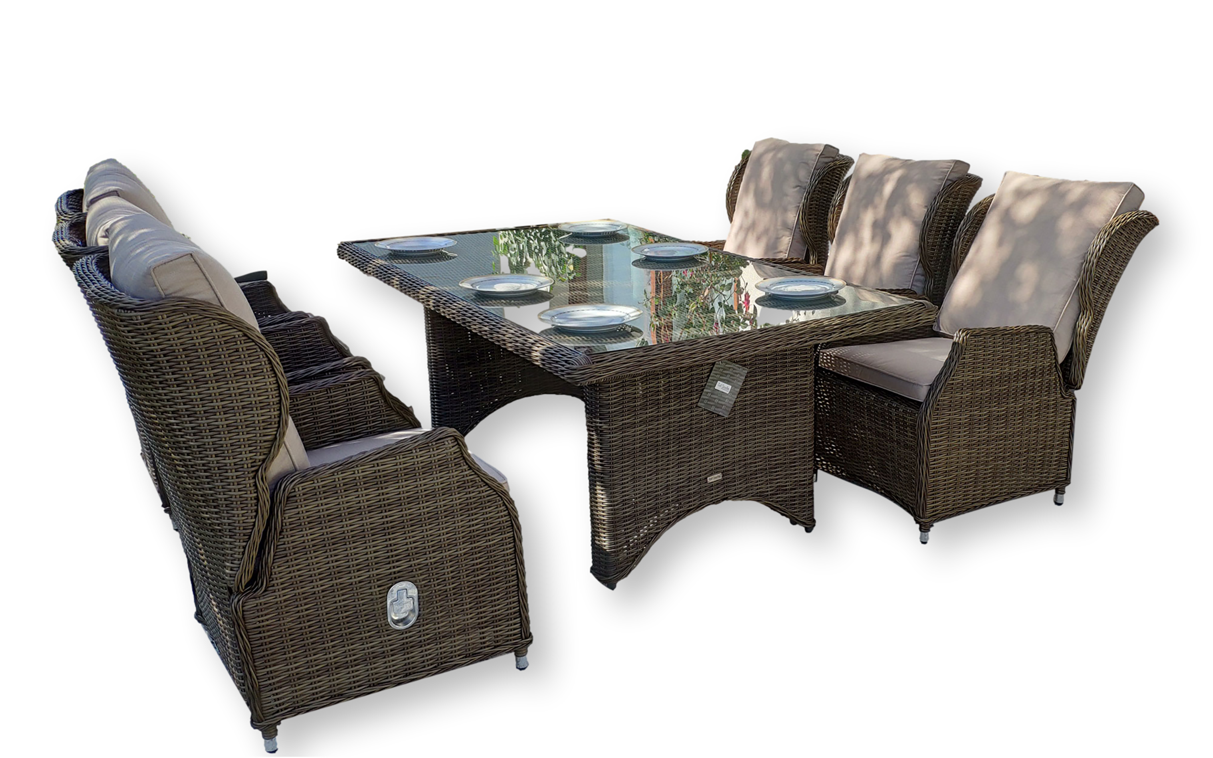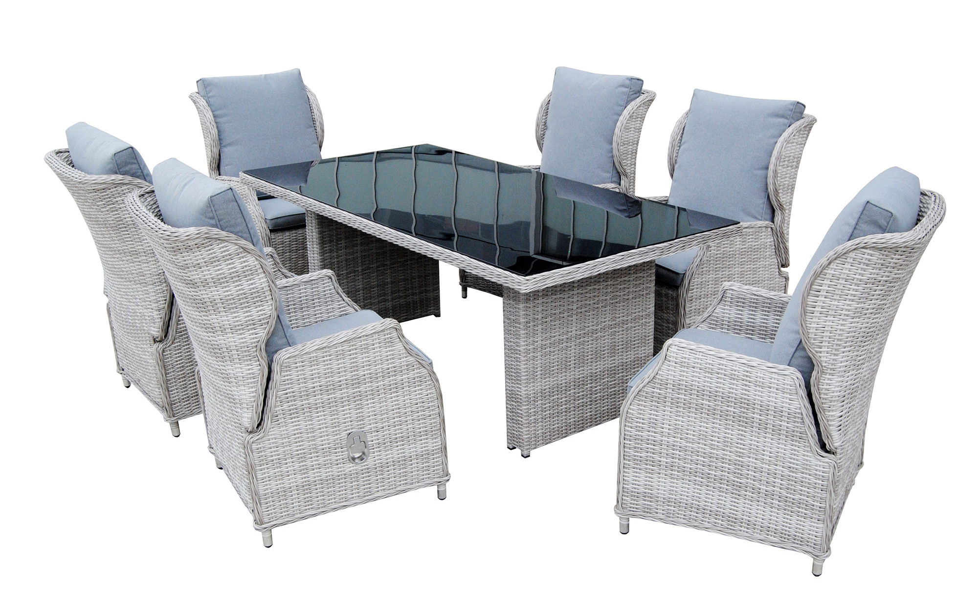 Duży stół prostokątny w o długości 200 pomieści od 6 do 8 osób, a wygodne, rozkładane fotele pozwolą zarówno zjeść obiad na świeżym powietrzu jak i odpocząć po nim w relaksującej pozycji.