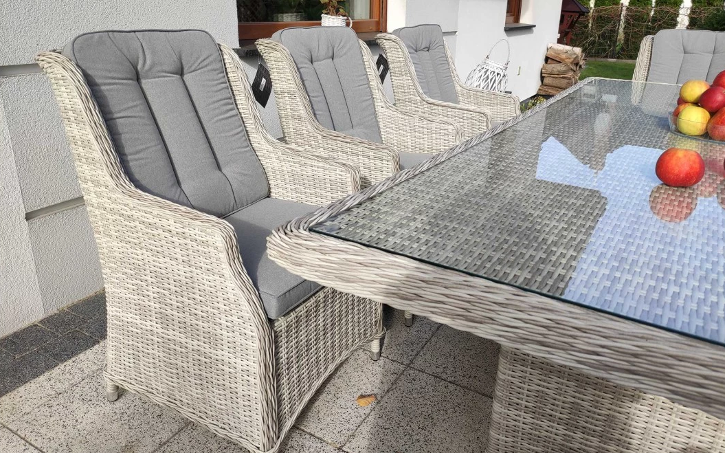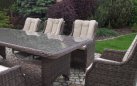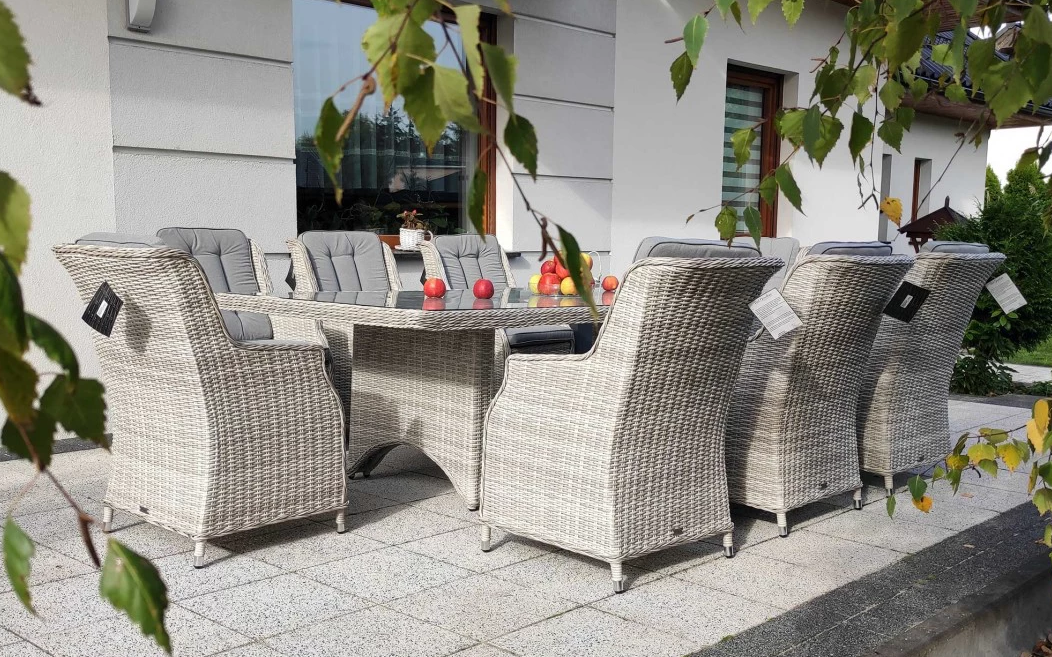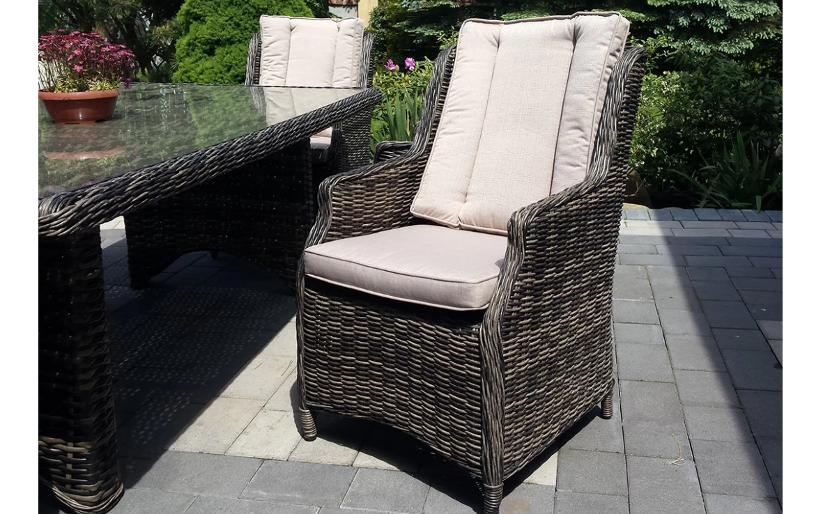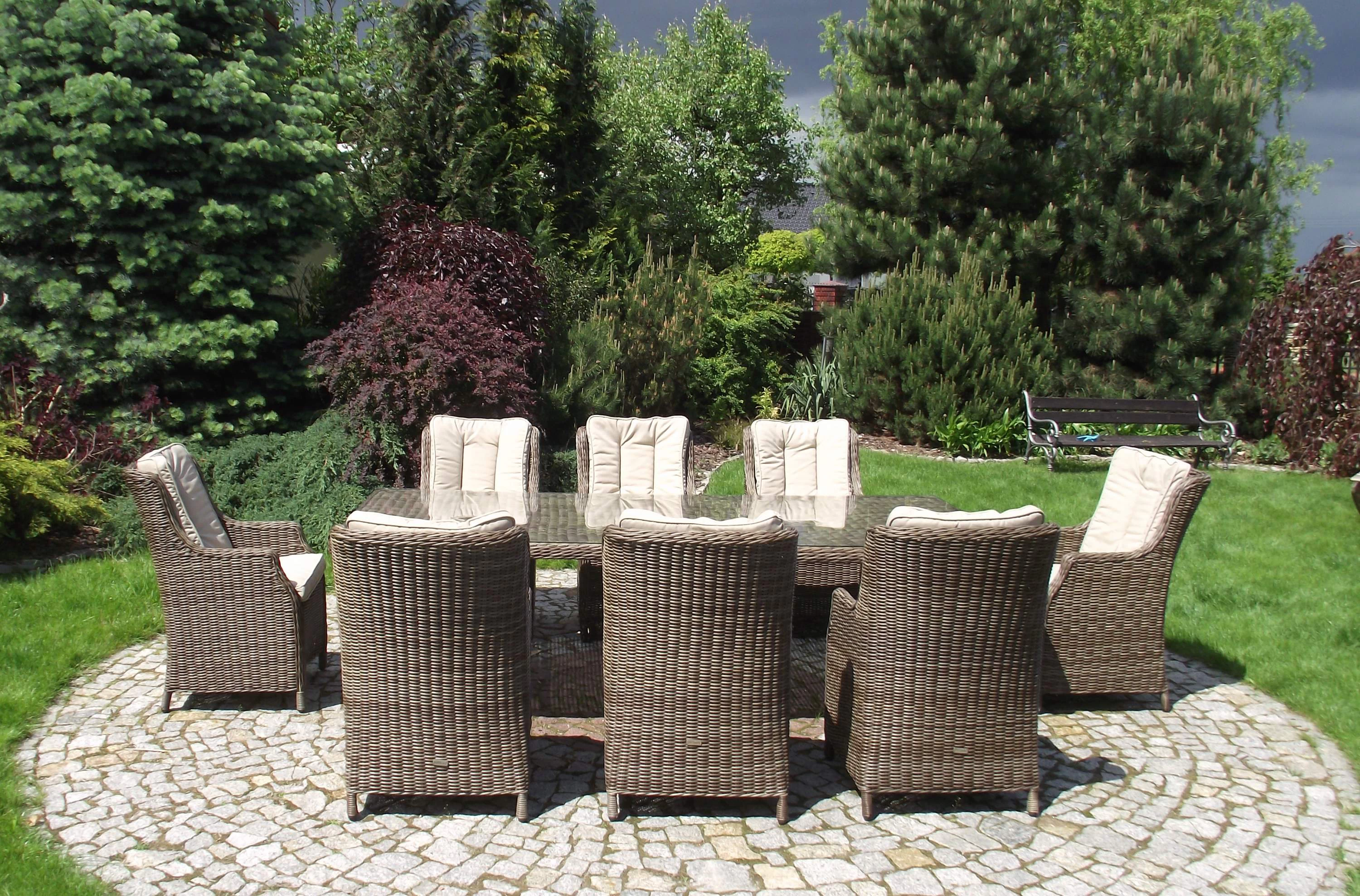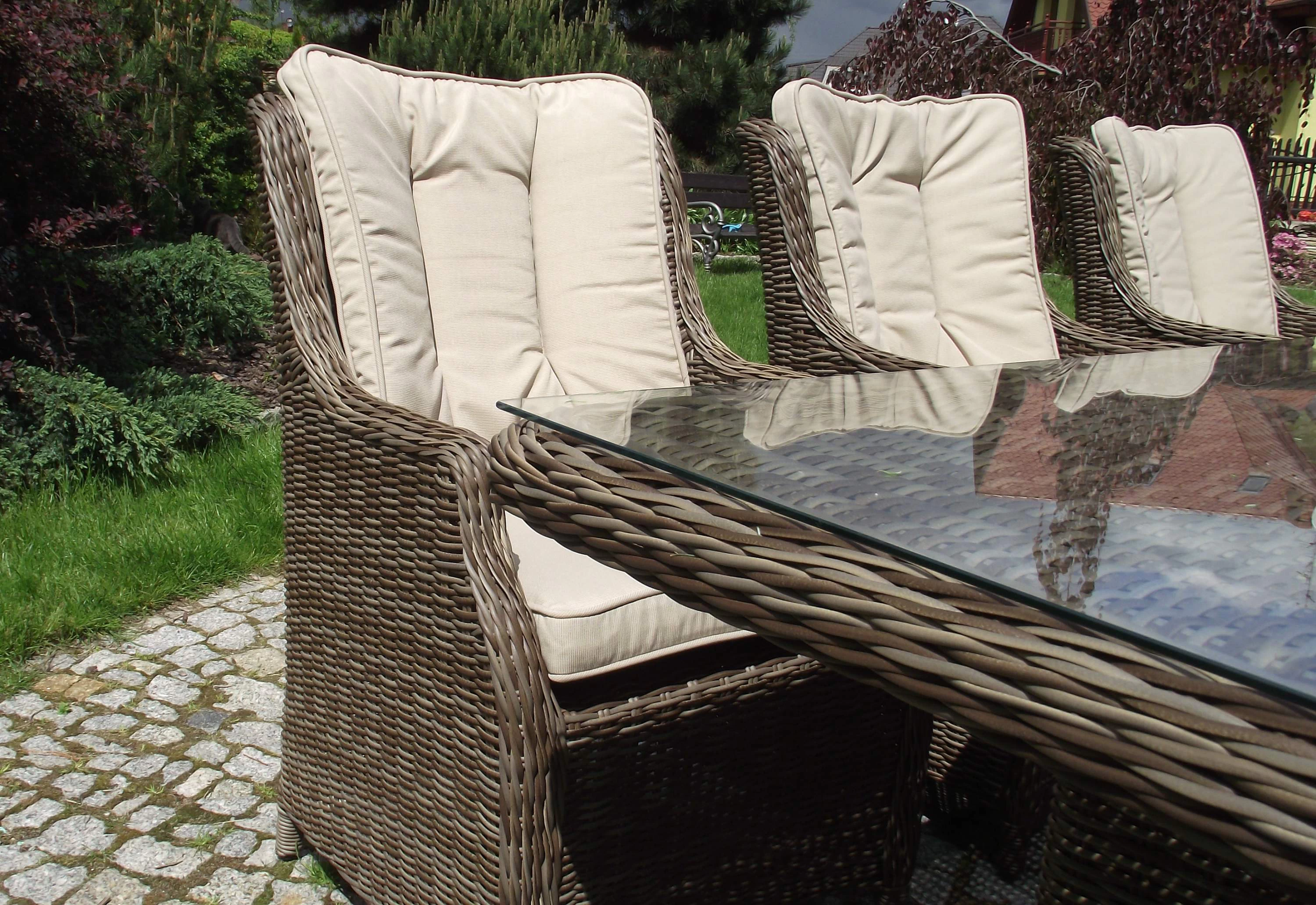Duży komplet mebli obiadowych ogrodowych z wysokimi wygodnymi fotelami. i poduszkami na siedzisku i oparciu.