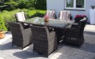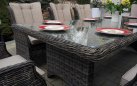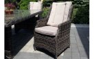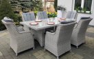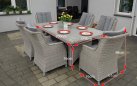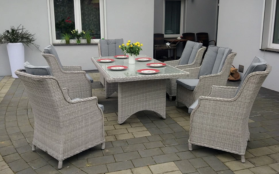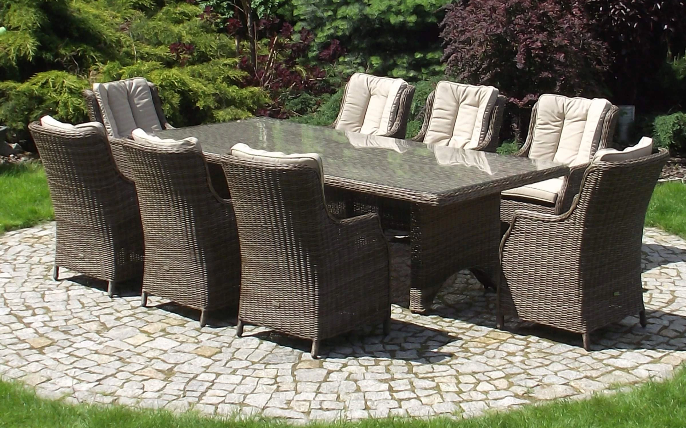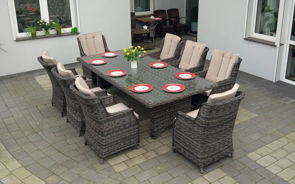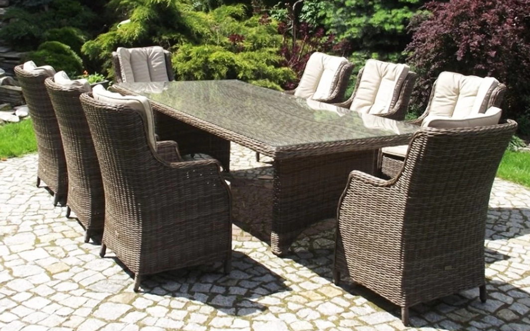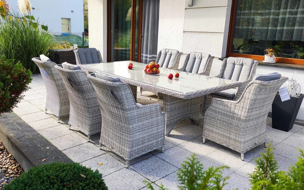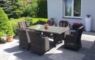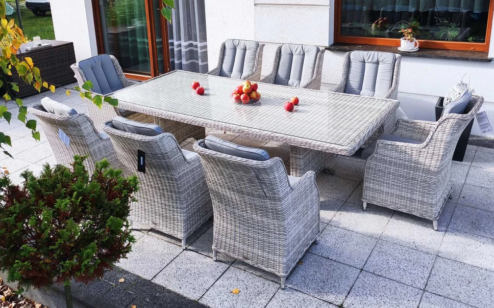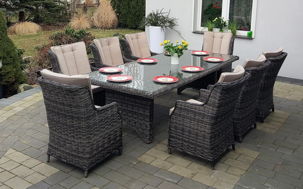 Duży komplet mebli obiadowych ogrodowych z wysokimi wygodnymi fotelami. i poduszkami na siedzisku i oparciu.