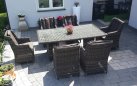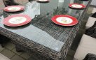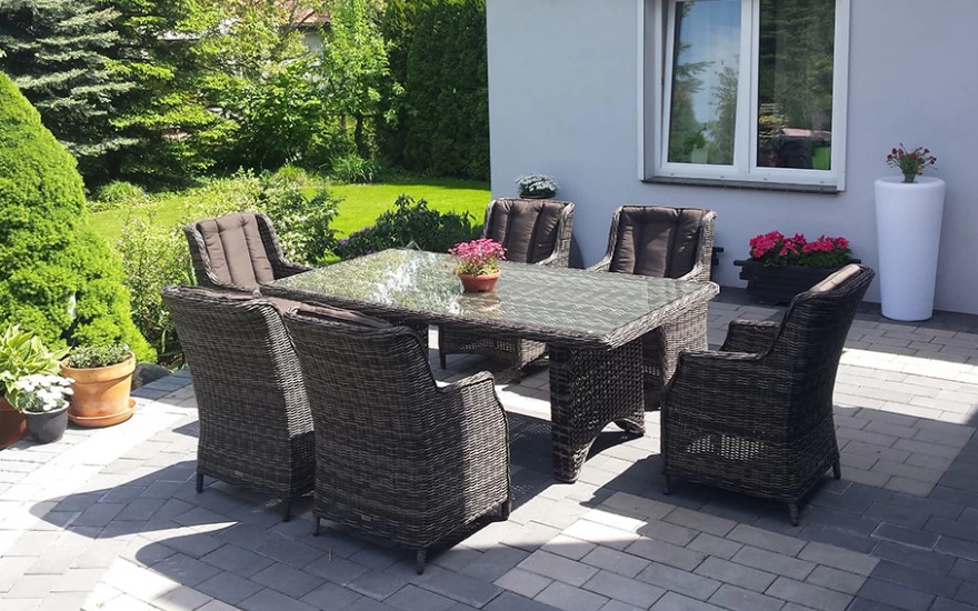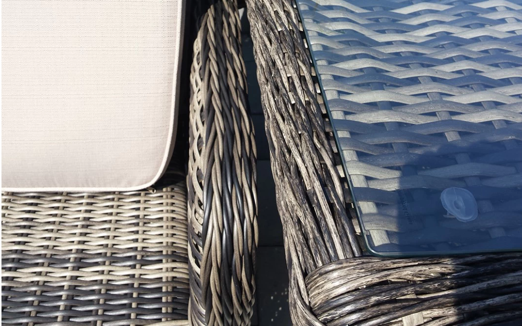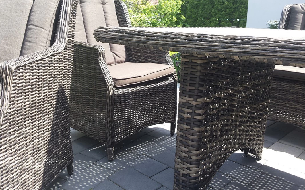 Wykończenie plecionką technorattanową o przekroju półokrągłym (śr. 5 mm). Ranty stołu oraz foteli wykończone są ozdobnym warkoczem z technorattanu okrągłego.