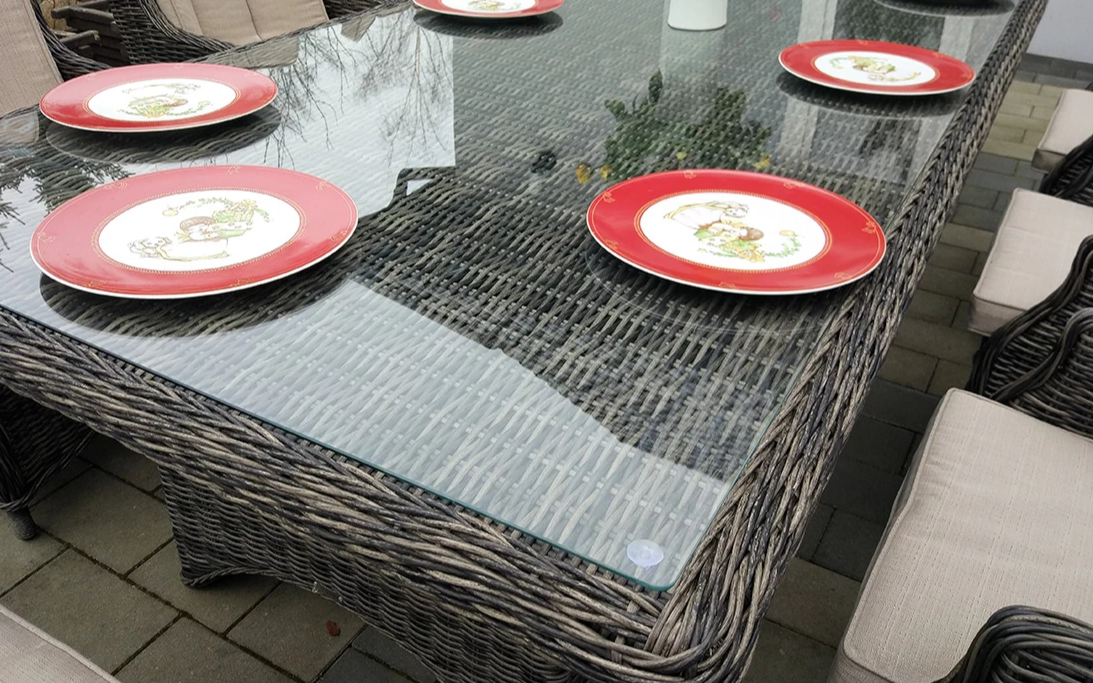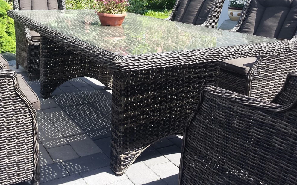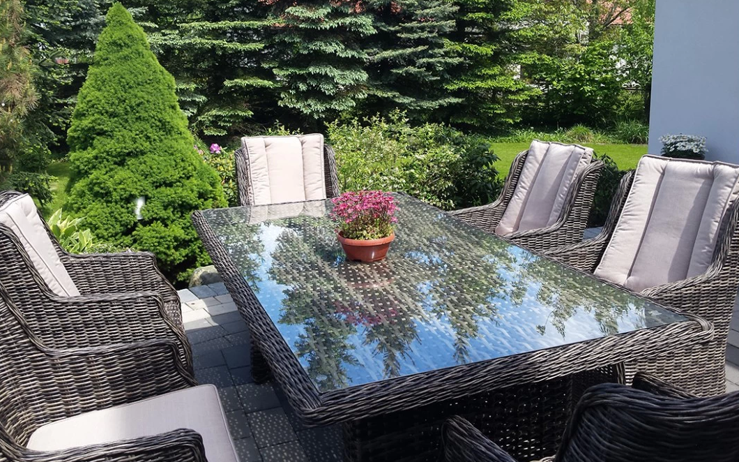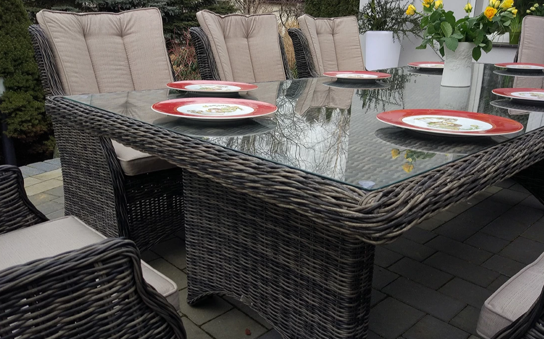 Stół z blatem wykonanym z technorattanu przykryty szkłem hartowanym o grubości 5 mm.