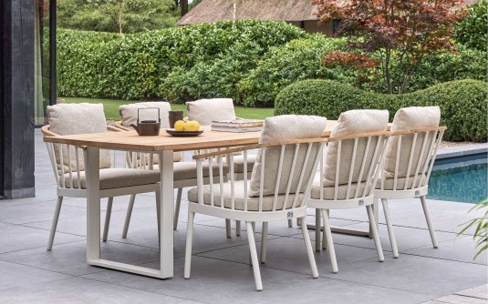 Zestaw obiadowy ogrodowy z teaku jest uważany za bardzo trwały i odporny na warunki atmosferyczne, co czyni go popularnym wyborem dla konstrukcji mebli ogrodowych. Drewno teakowe jest jednym z najtrwalszych gatunków drewna, a jego naturalne olejki nadają mu odporność na wilgoć, owady i grzyby. Meble z teaku nie wymagają zbyt wiele konserwacji, co jest dodatkowym atutem, pod warunkiem jednakże, że akceptujemy z czasem zmianę koloru na srebrzystoszary. Jeżeli chcemy zachować kolor - meble stołowe z teaku wymagają konserwacji olejami i specjalnymi impregnatami aby zachować swój ciepły miodowy kolor. Komplety stołowe z drewna teakowego polecamy szczególnie na zadaszone tarasy lub do patio. Jeśli chcesz kupić meble z teaku, koniecznie zapoznaj się z instrukcją dotyczącą ich pielęgnacji i odpowiednio je pielęgnuj, aby cieszyć się nimi przez wiele lat.
