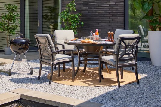 Aluminiowy okrągły stół ogrodowy o średnicy 122 cm w kolorze czarnym z paleniskiem / 4 krzesła z podłokietnikami z szarymi poduszkami Olefin