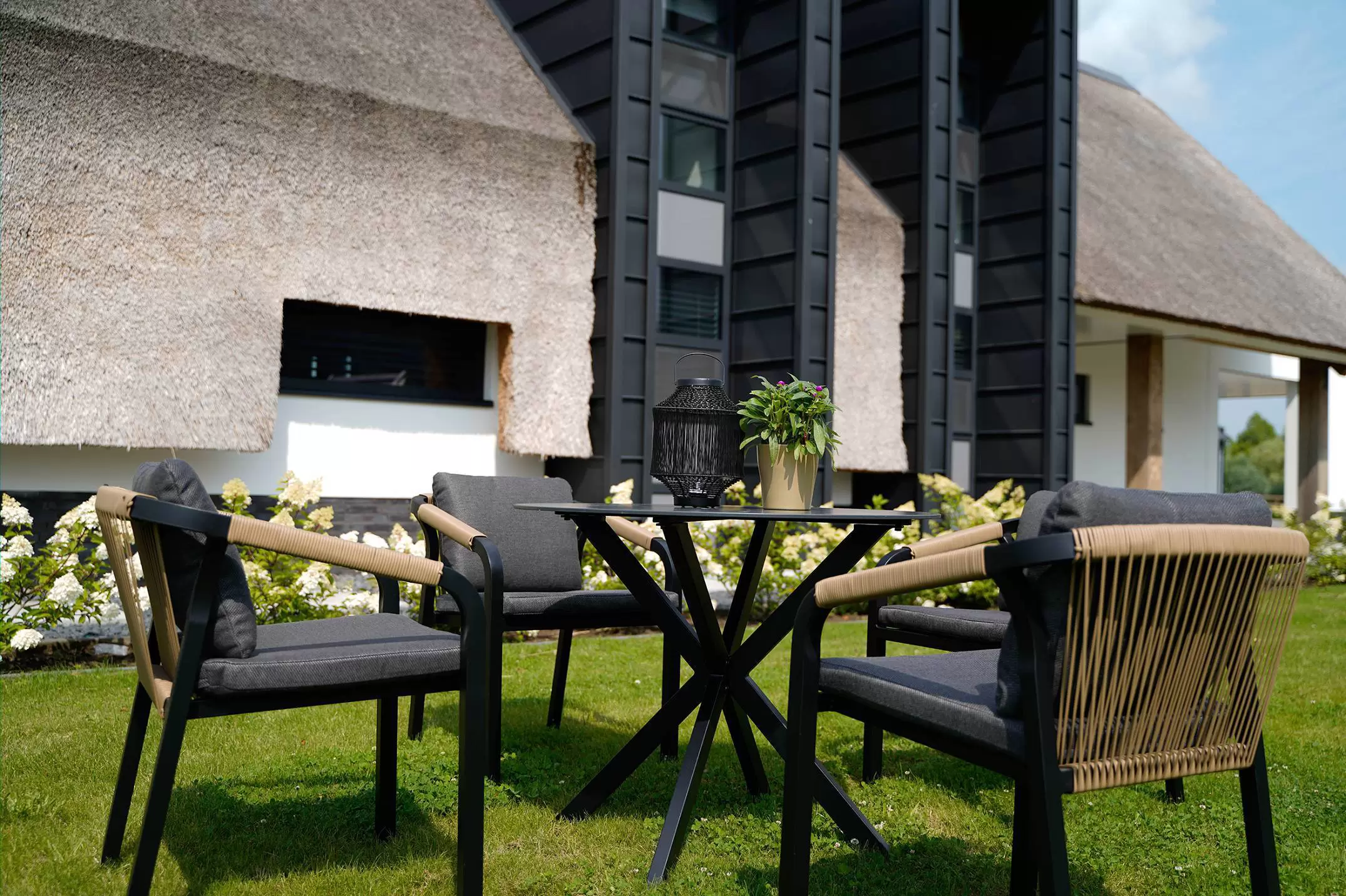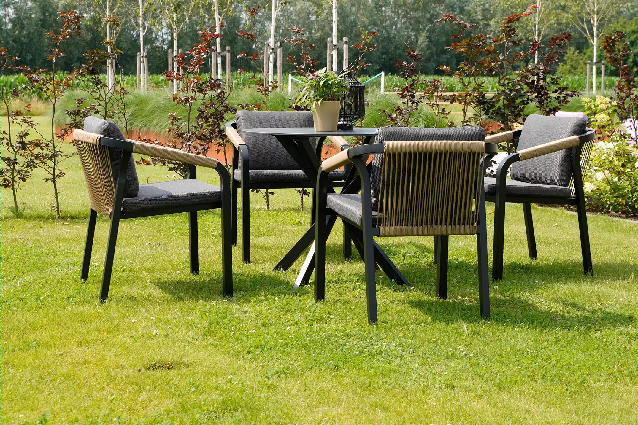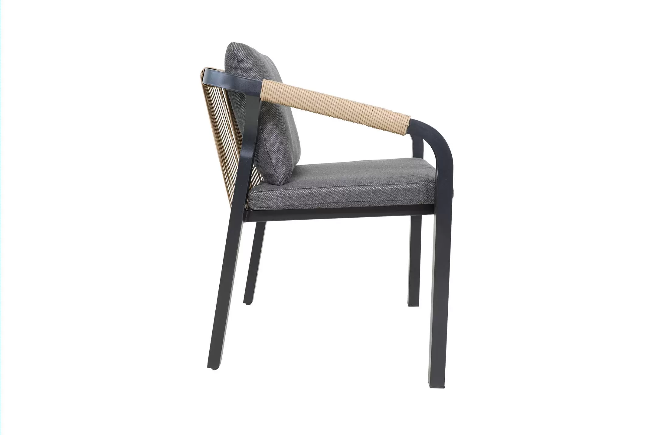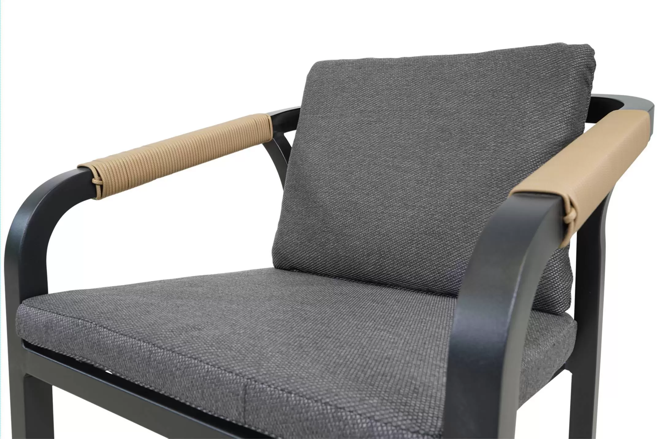 Aluminiowa konstrukcja malowana proszkowo w kolorze antracyt. Podłokietniki oplecione technorattanem.