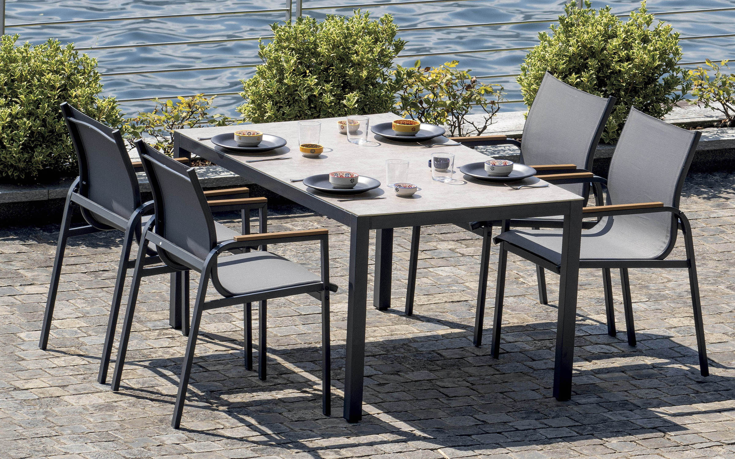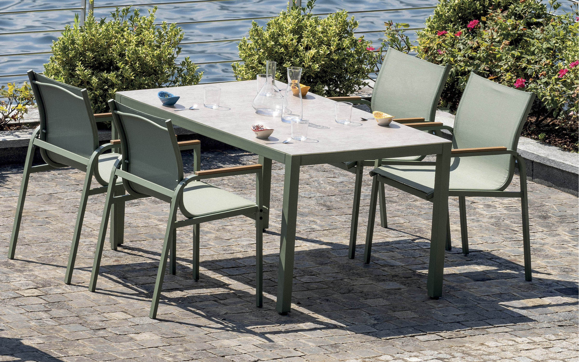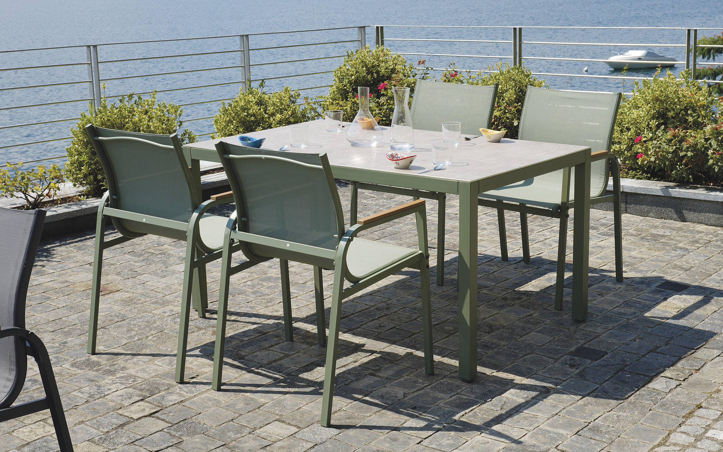 Kompletny zestaw ogrodowy składający się ze stołu i czterech krzeseł z podłokietnikami. Wykonany z trwałej stali z powłoką antykorozyjną. Blat stołu ze szkła drukowanego o grubości 5 mm nadaje elegancki wygląd i jest łatwy w utrzymaniu. Krzesła wyposażone są we wstawki z polywood. Zestaw dostępny w dwóch wersjach kolorystycznych: antracytowej i zielonej.