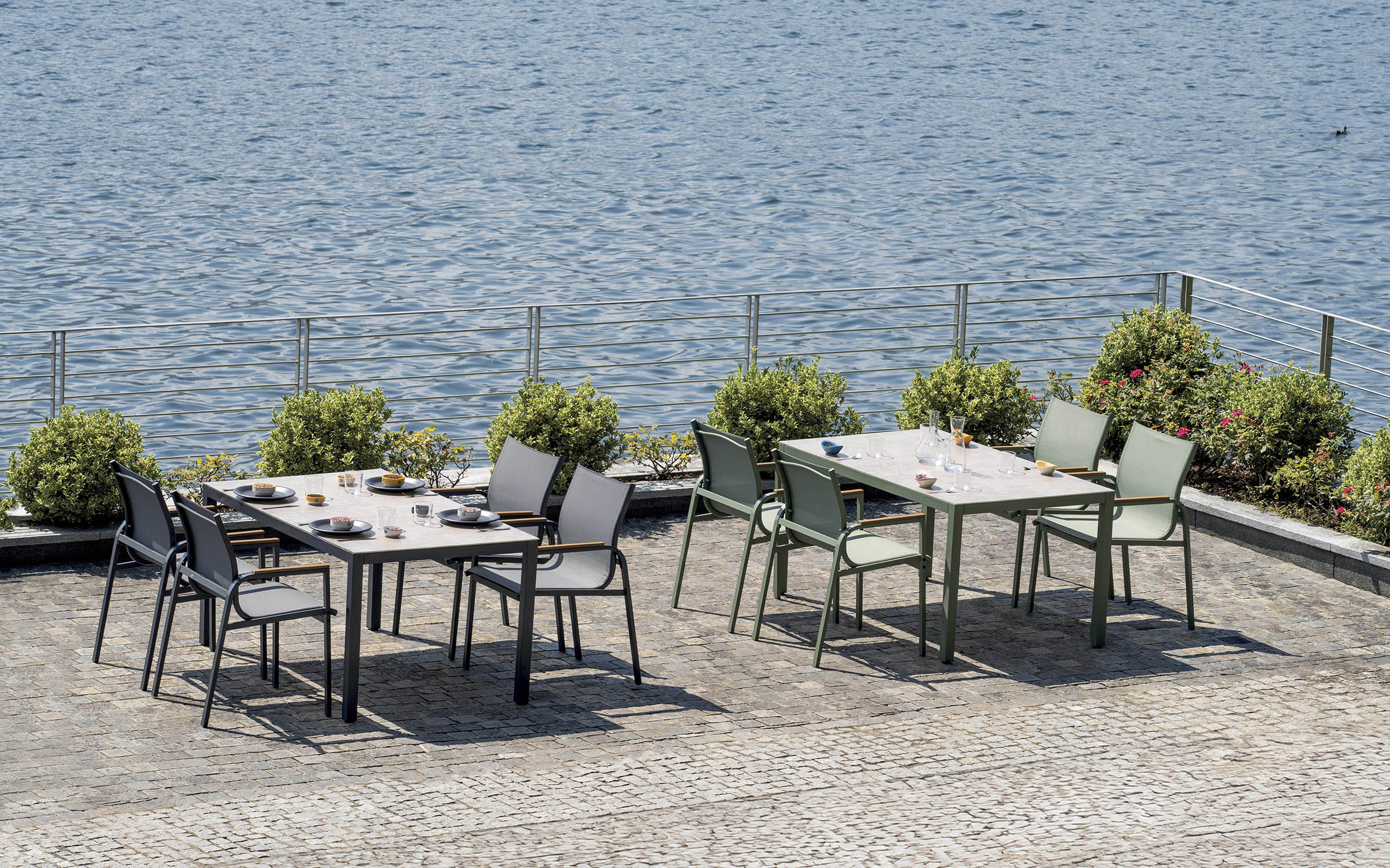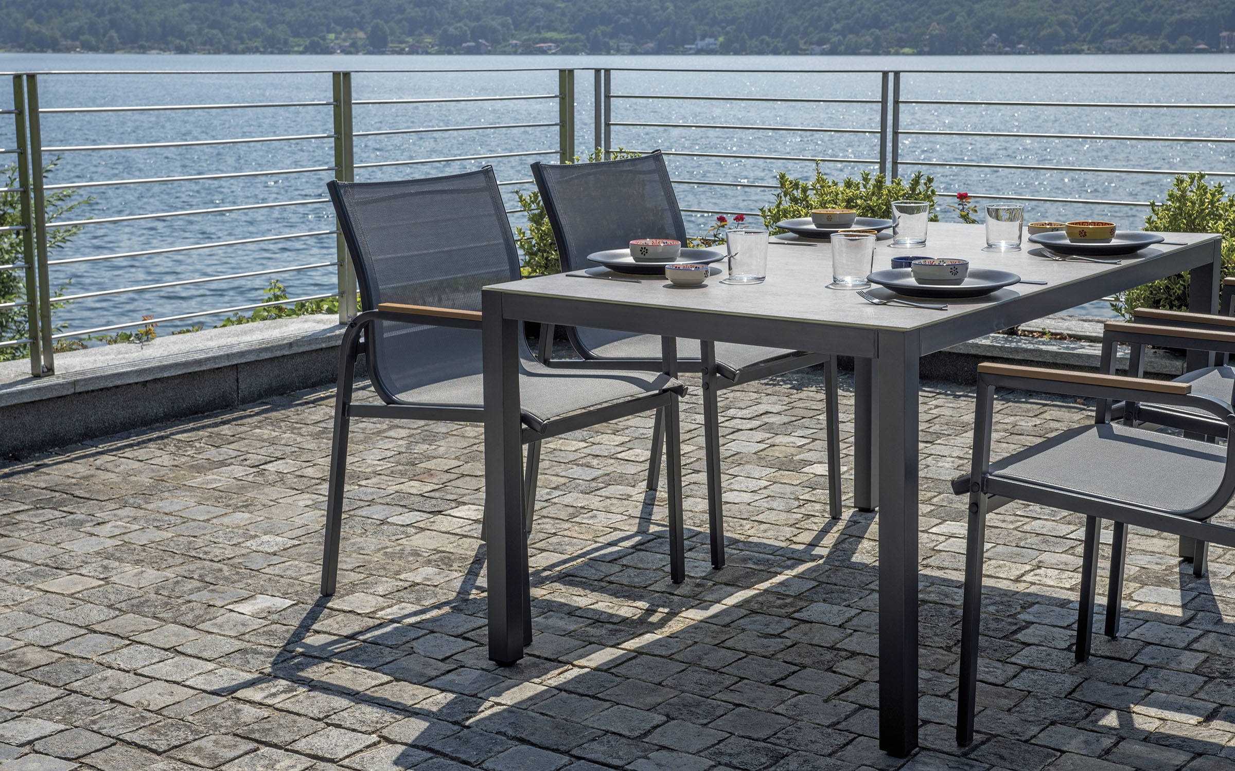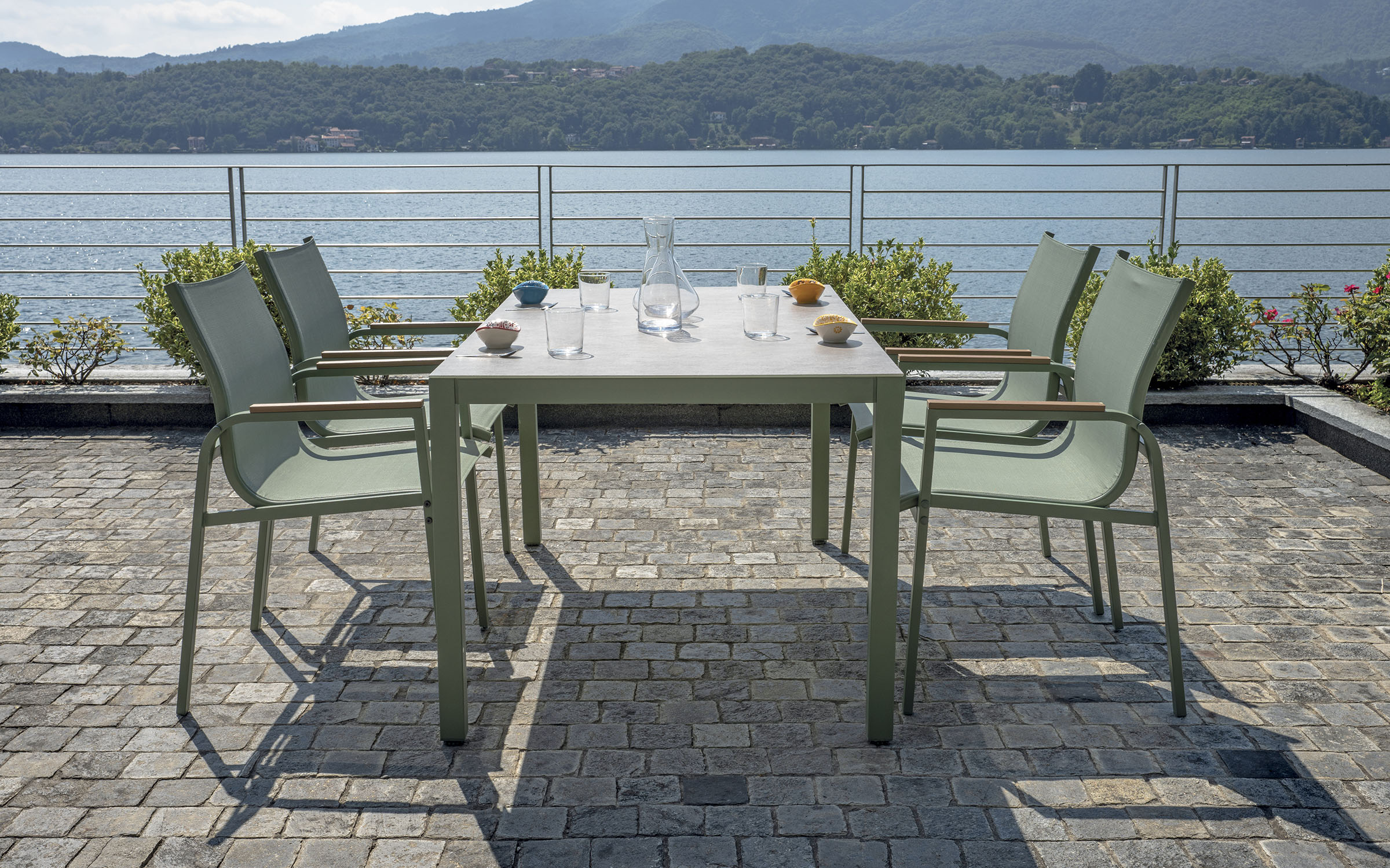 Kompletny zestaw ogrodowy składający się ze stołu i czterech krzeseł z podłokietnikami. Wykonany z trwałej stali z powłoką antykorozyjną. Blat stołu ze szkła drukowanego o grubości 5 mm nadaje elegancki wygląd i jest łatwy w utrzymaniu. Krzesła wyposażone są we wstawki z polywood. Zestaw dostępny w dwóch wersjach kolorystycznych: antracytowej i zielonej.