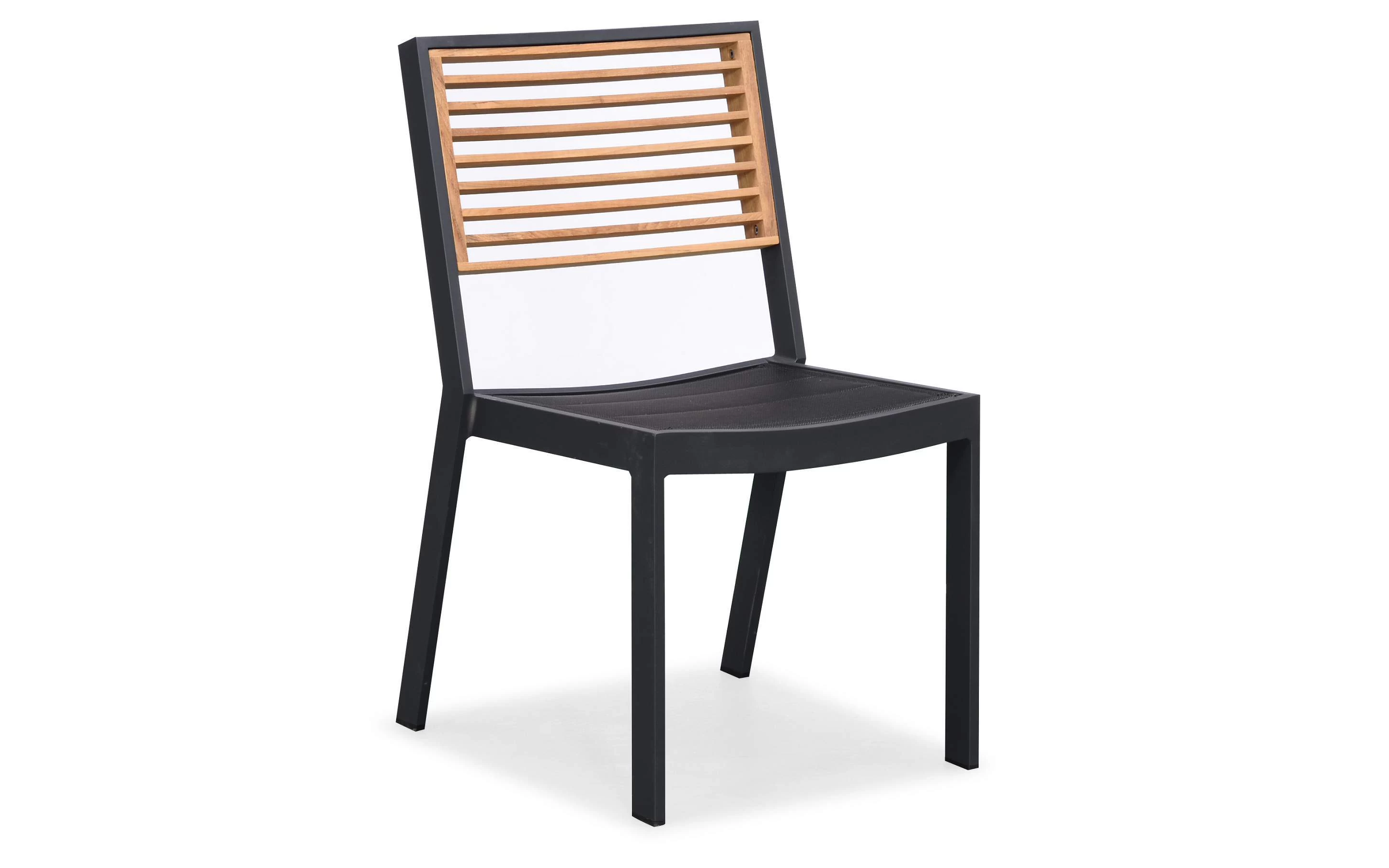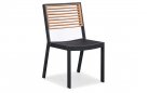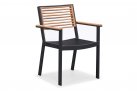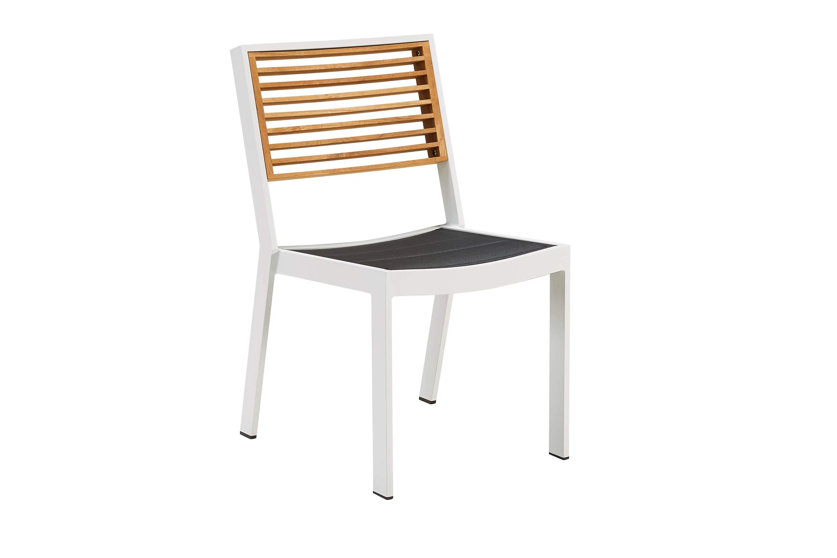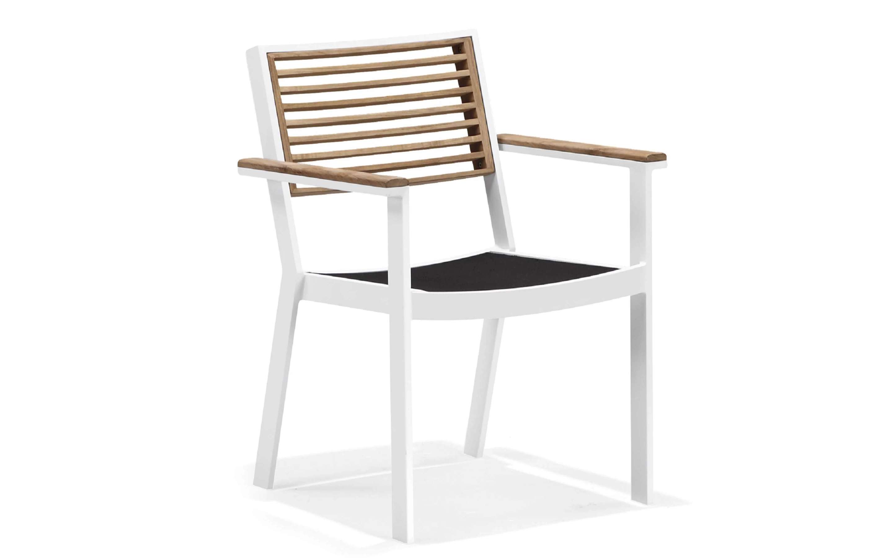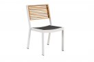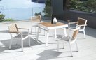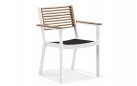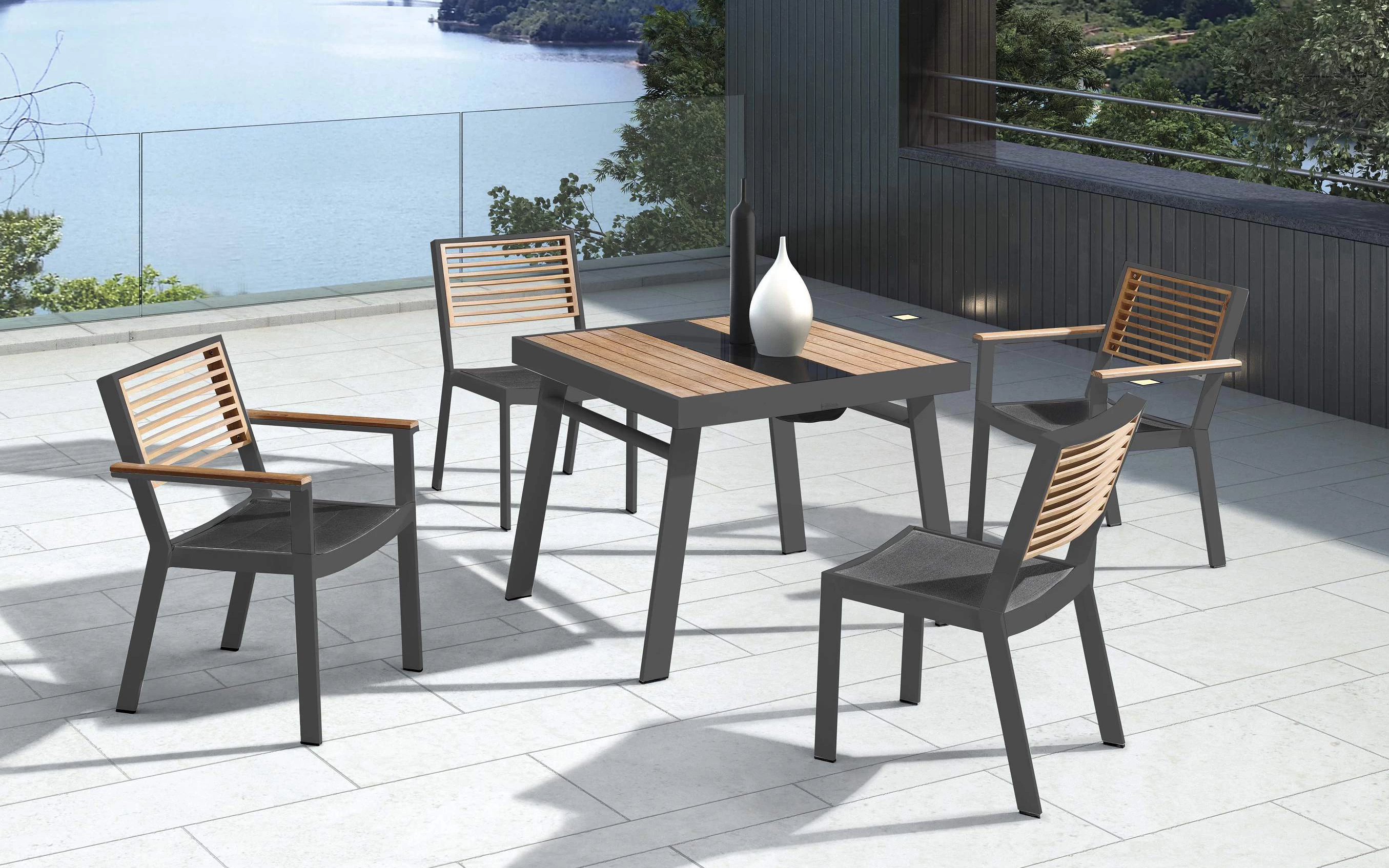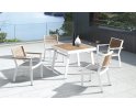 Komplet mebli stołowych dla 4 osób na taras firmy HIGOLD. Konstrukcja opiera się na spawanej ramie aluminiowej malowanej proszkowo na kolor biały lub czarny i elementach dekoracyjnych z teaku. Siedzisko foteli/krzeseł z grubej tekstyliny.