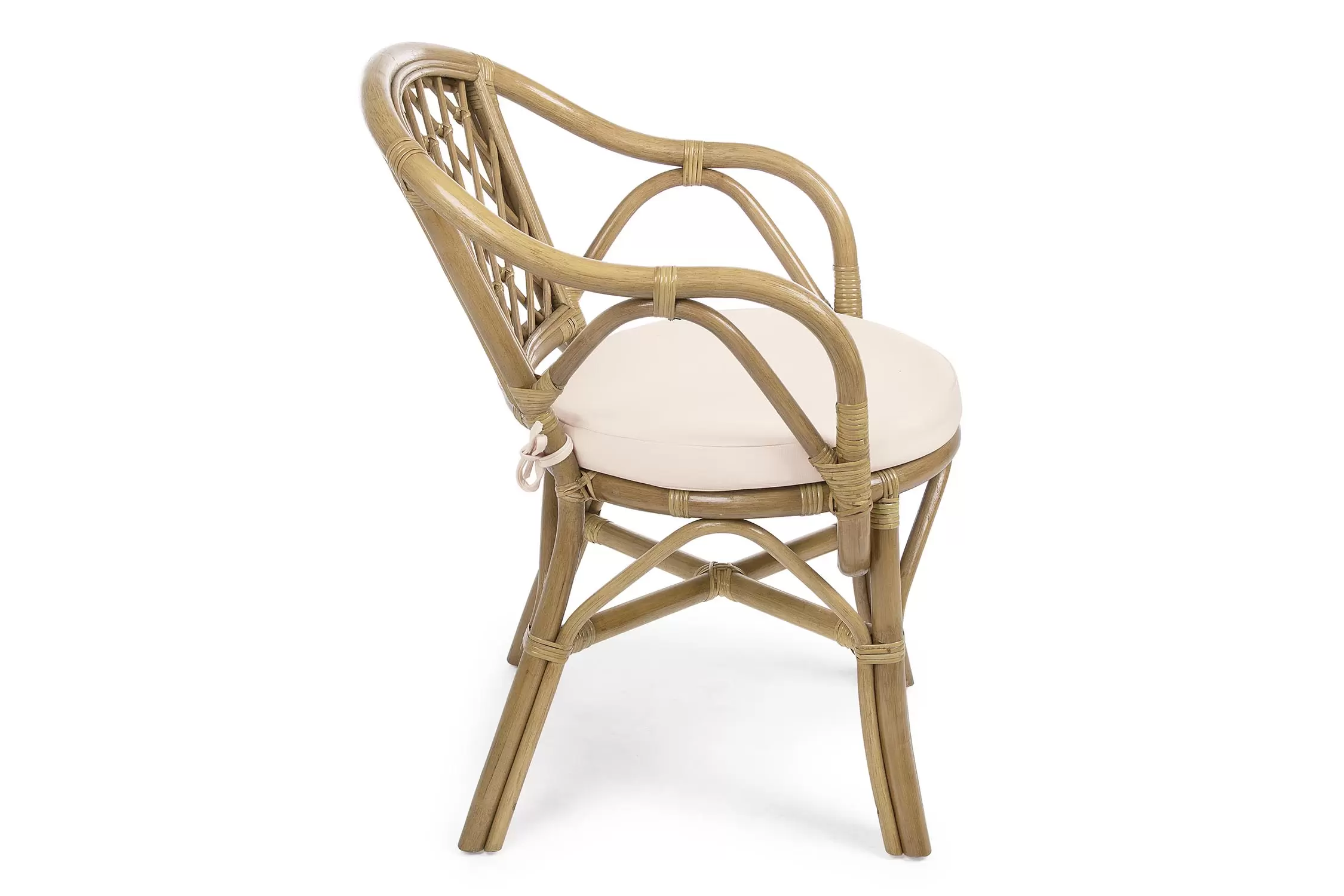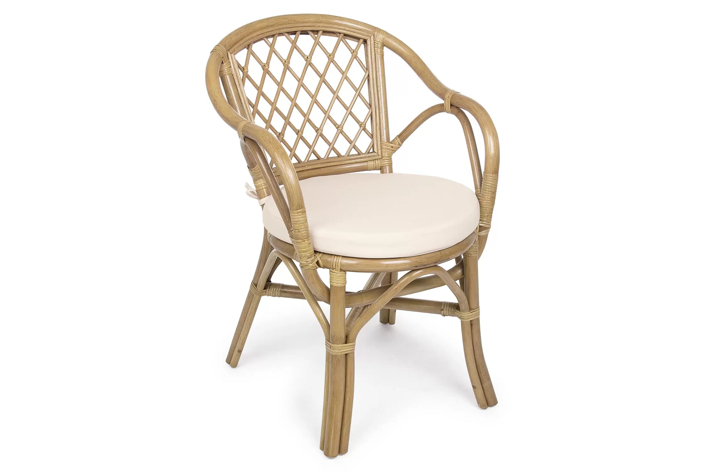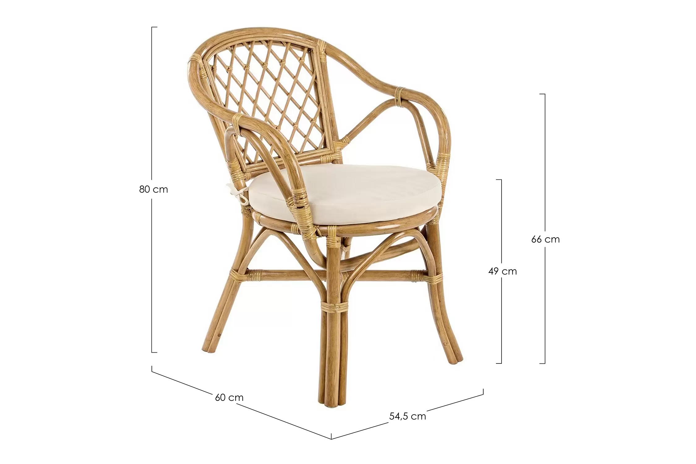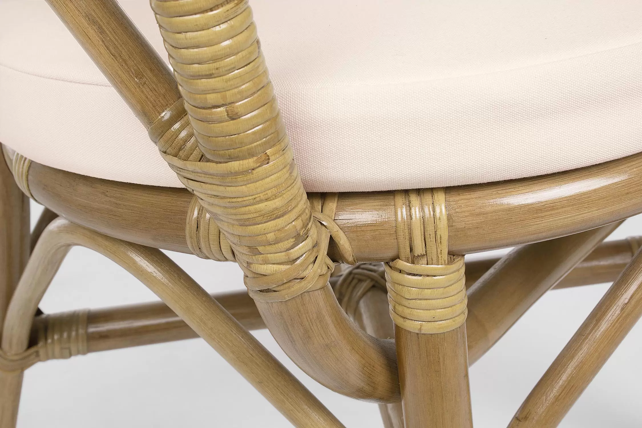 Klasyczny fotel z naturalnego rattanu z podłokietnikami. Poduszka na siedzisku białokremowa. Fotel polecamy do użytku w wewnętrznym ogrodzie i do osłoniętego patio.