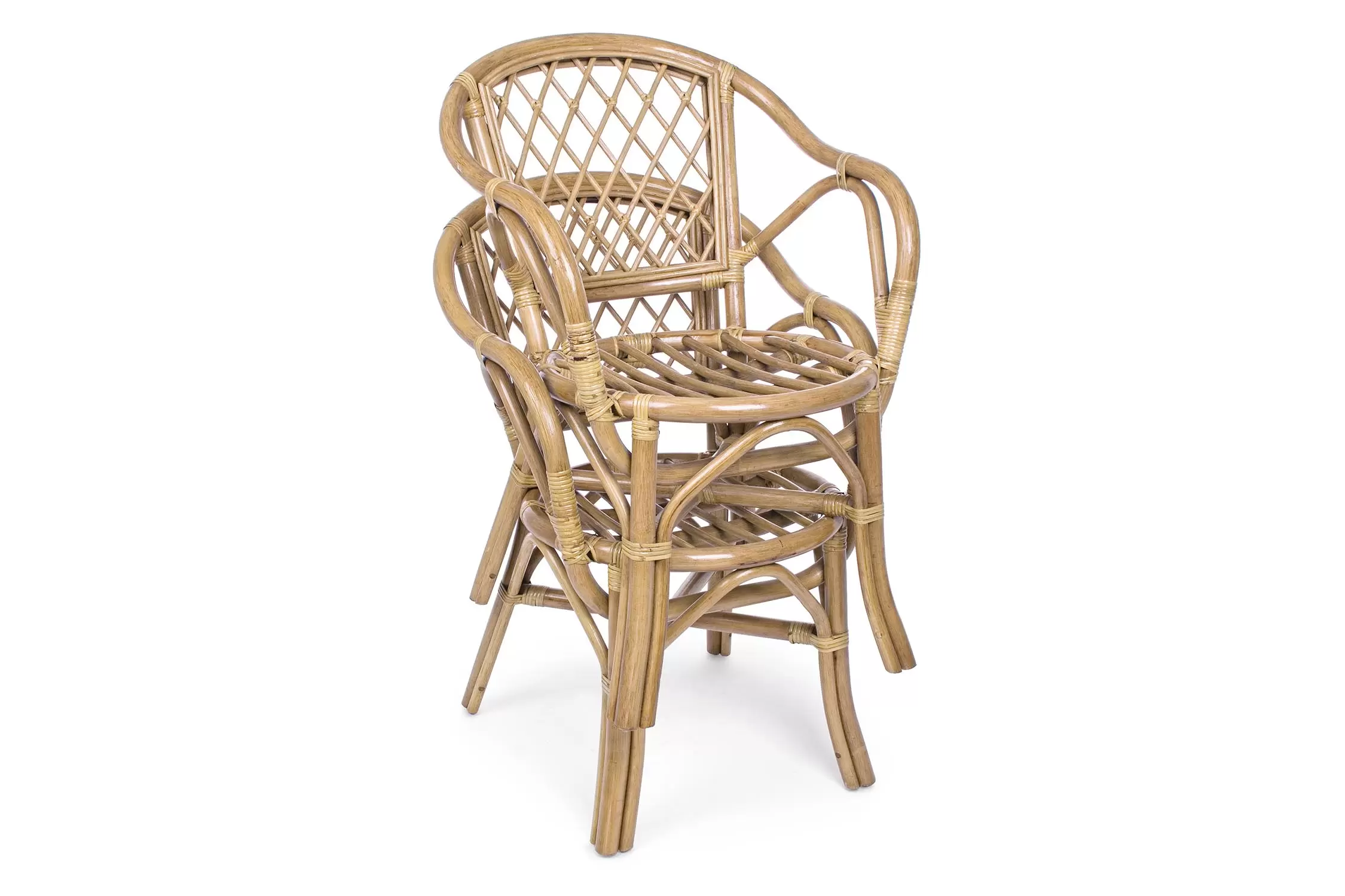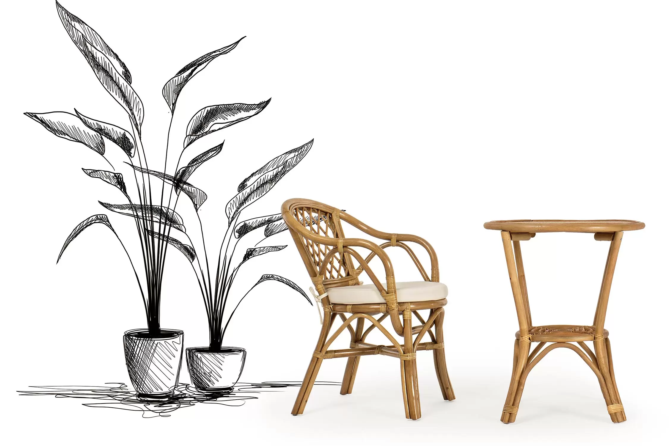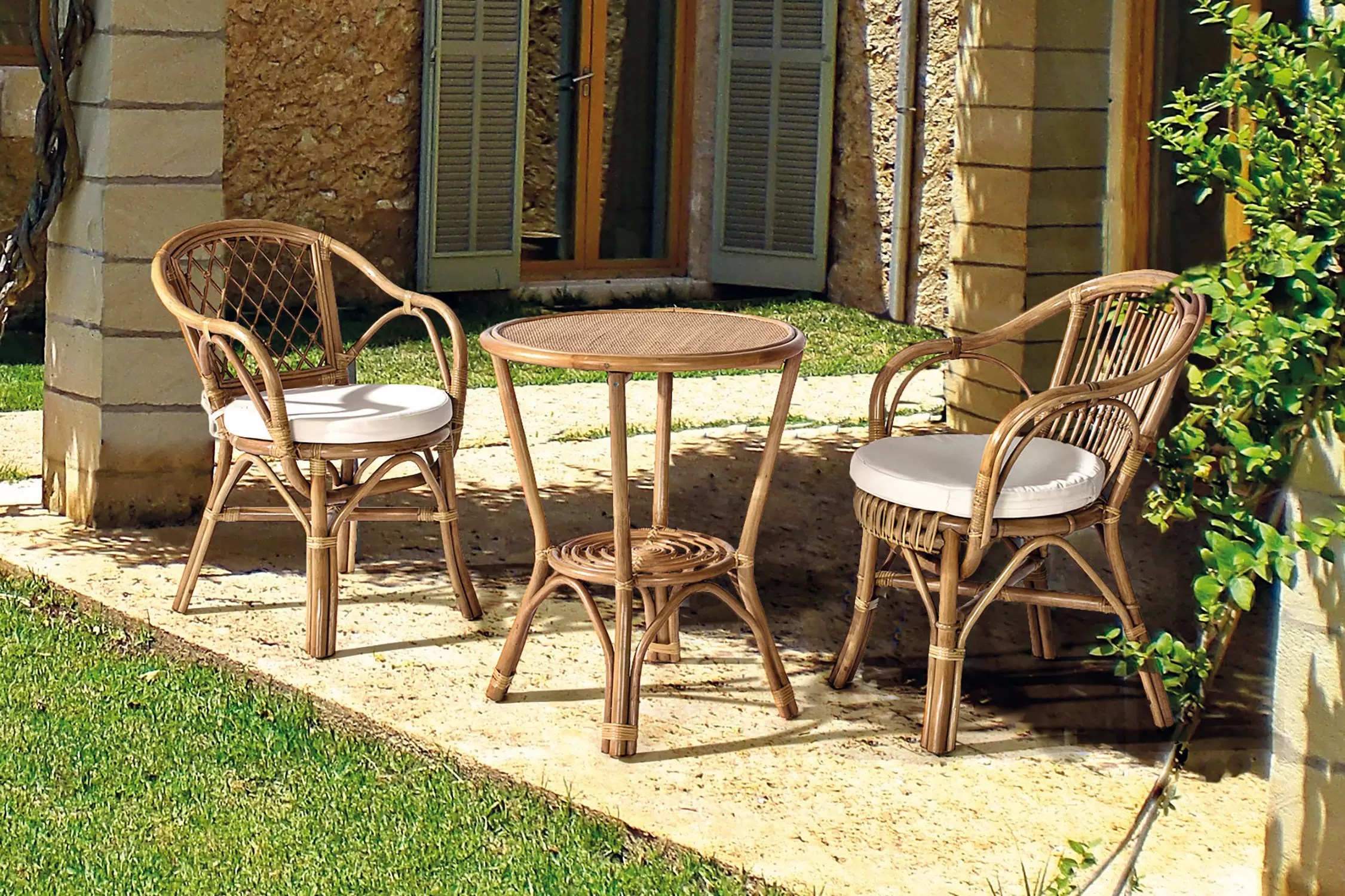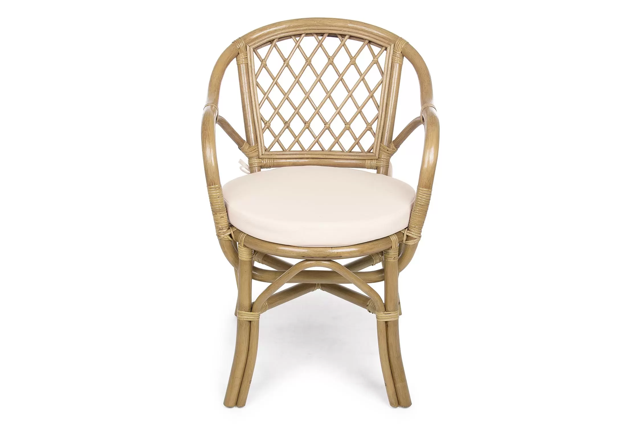 Klasyczny fotel z naturalnego rattanu z podłokietnikami. Poduszka na siedzisku białokremowa. Fotel polecamy do użytku w wewnętrznym ogrodzie i do osłoniętego patio.