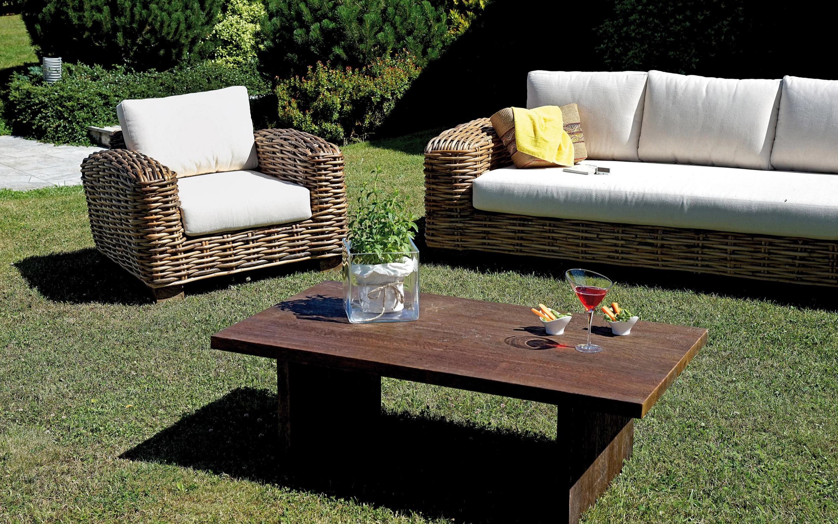 Konstrukcja z rattanu gigant w kolorze naturalnym, z dodatkami z drewna mango. Blat stolika z drewna mango. Poduszki zdejmowane w kolorze écru, wykonane z tkaniny policotton (bawełna + poliester).