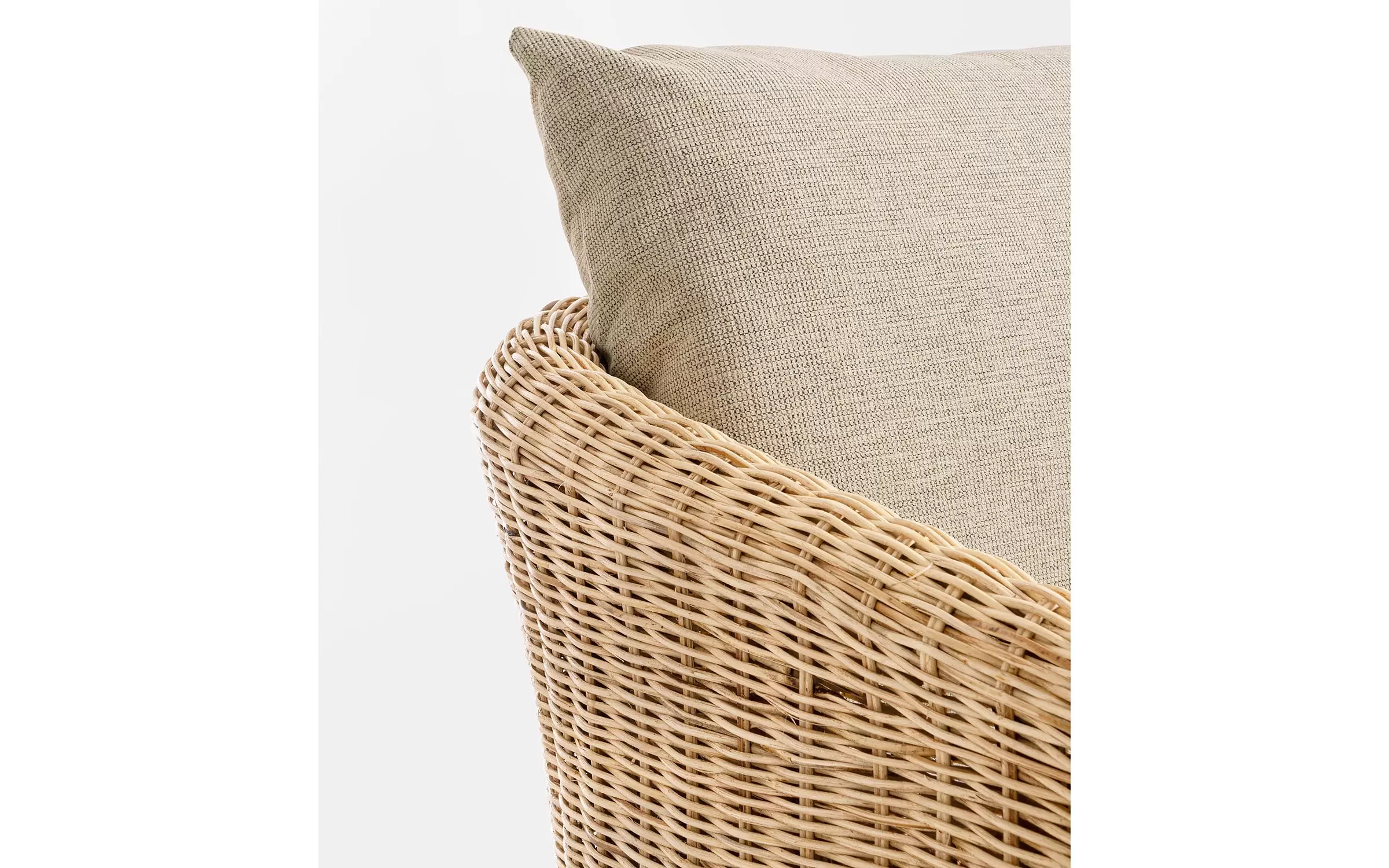 Klasyczny fotel wypoczynkowy z naturalnego rattanu z beżowo-kremowymi poduszkami.