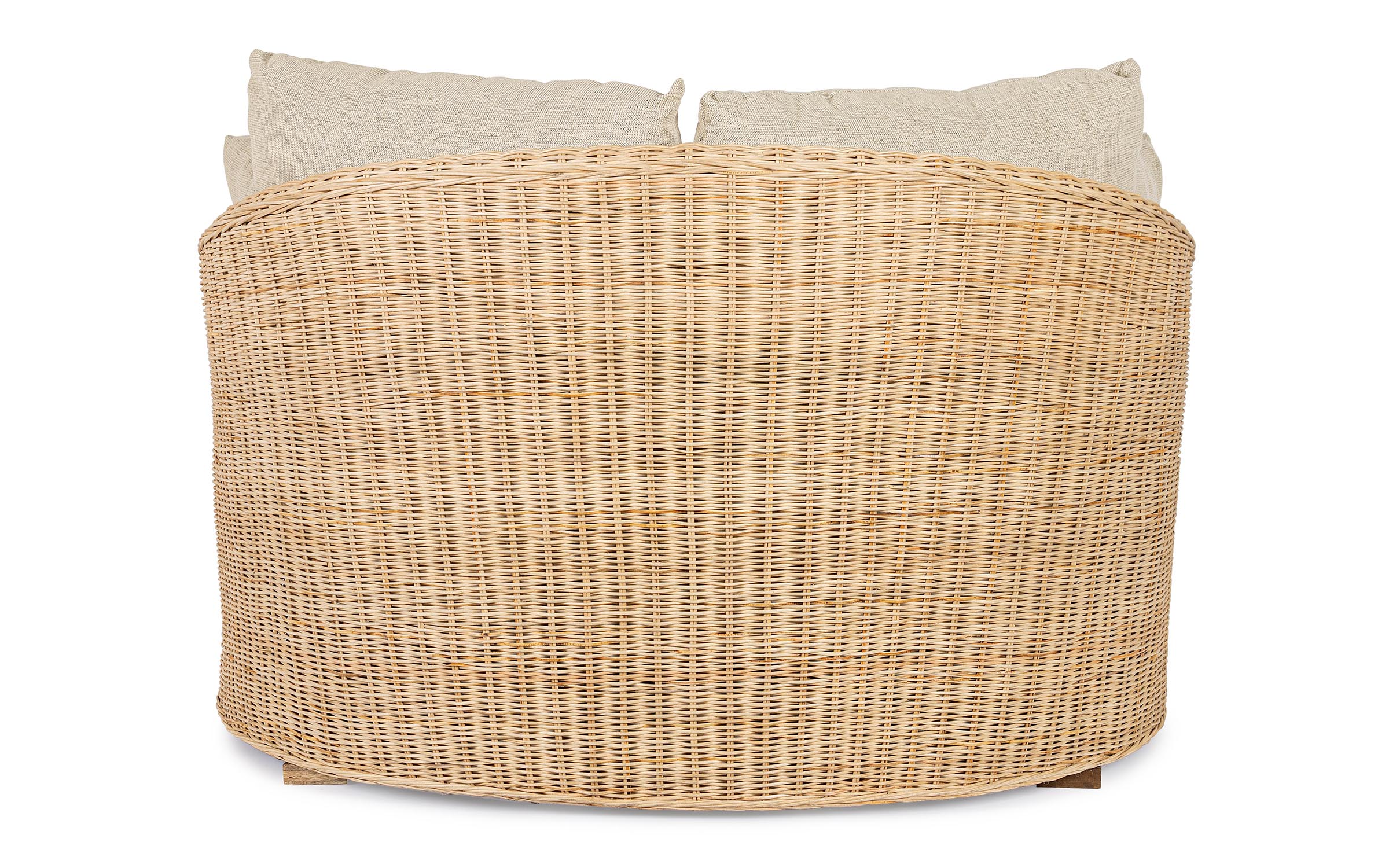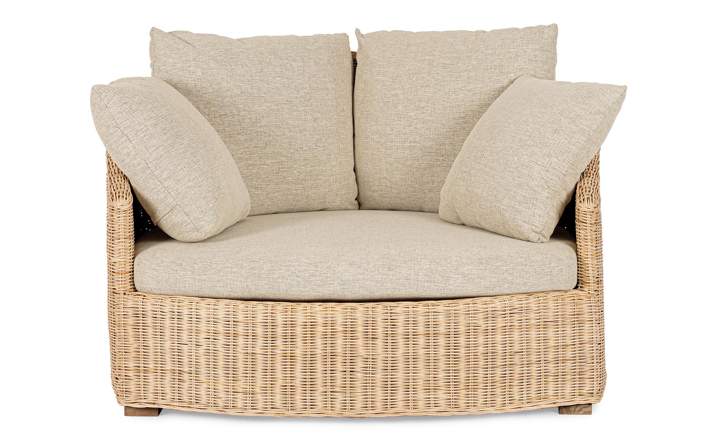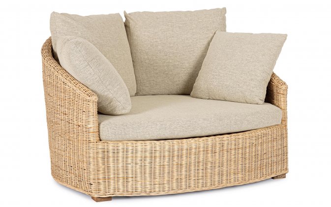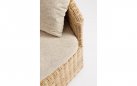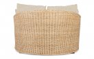 Mała sofka/łóżko w klasycznym wykonaniu wypoczynkowe z naturalnego rattanu z beżowo-kremowymi poduszkami.