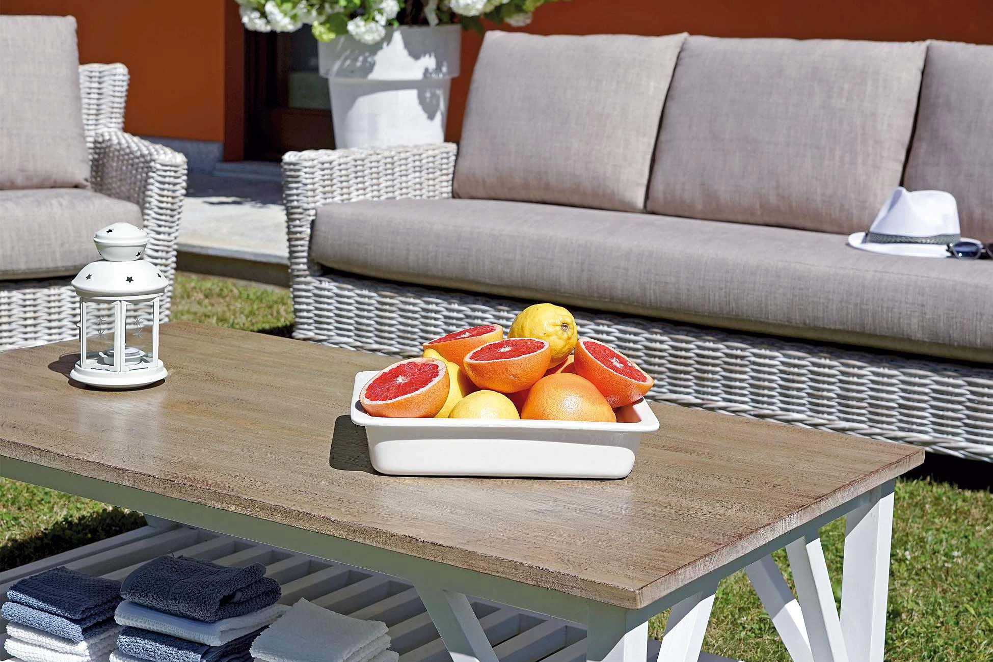 Meble w tym zestawie mają kolor szaro-popielaty i zbudowane są z naturalnego rattanu. Całość świetnie prezentuje się nie tylko na zewnątrz, ale także we wnętrzach, np. w ogrodzie zimowym. Stylowo zaprojektowany stolik, wykonany z drewna mango, doskonale komponuje się z całym zestawem. Znajdujące się na fotelach poduszki mają poszewki w kolorze melange. Istnieje możliwość zdjęcia poduszek do prania. Elementy zestawu to: sofa, dwa fotele oraz stolik.