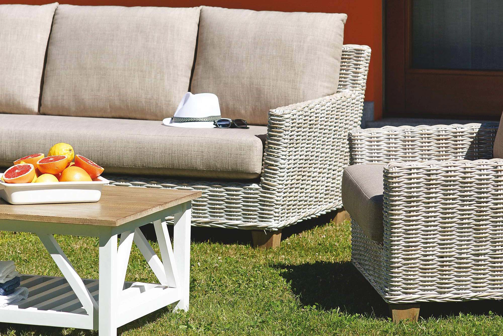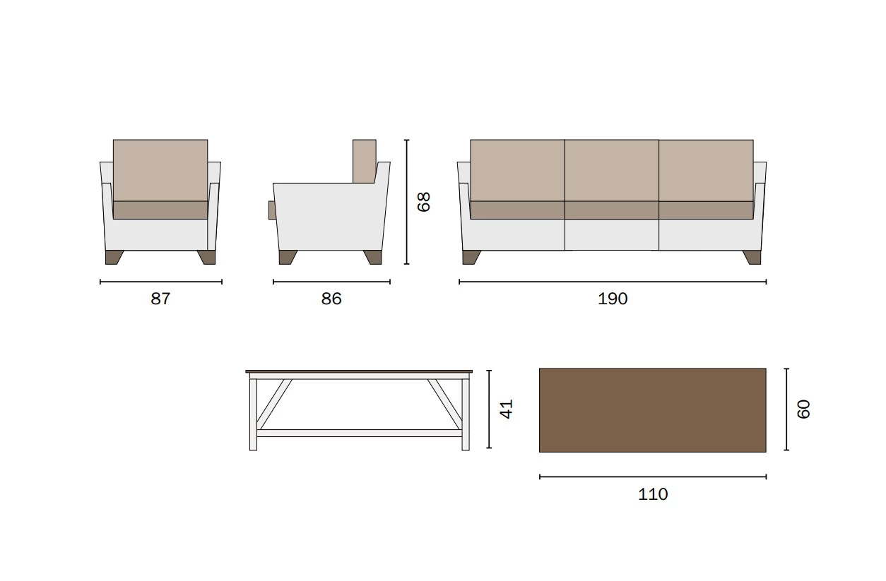 W zestawie znajduje się stolik kawowy z blatem drewnianym o wymiarach 110×60 cm i wysokości 41 cm. Poduszki w kolorze sabbia mélange są zdejmowane i wykonane z mieszanki bawełny i poliestru (policotton) – trwałej i przyjemnej w dotyku.
