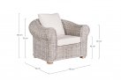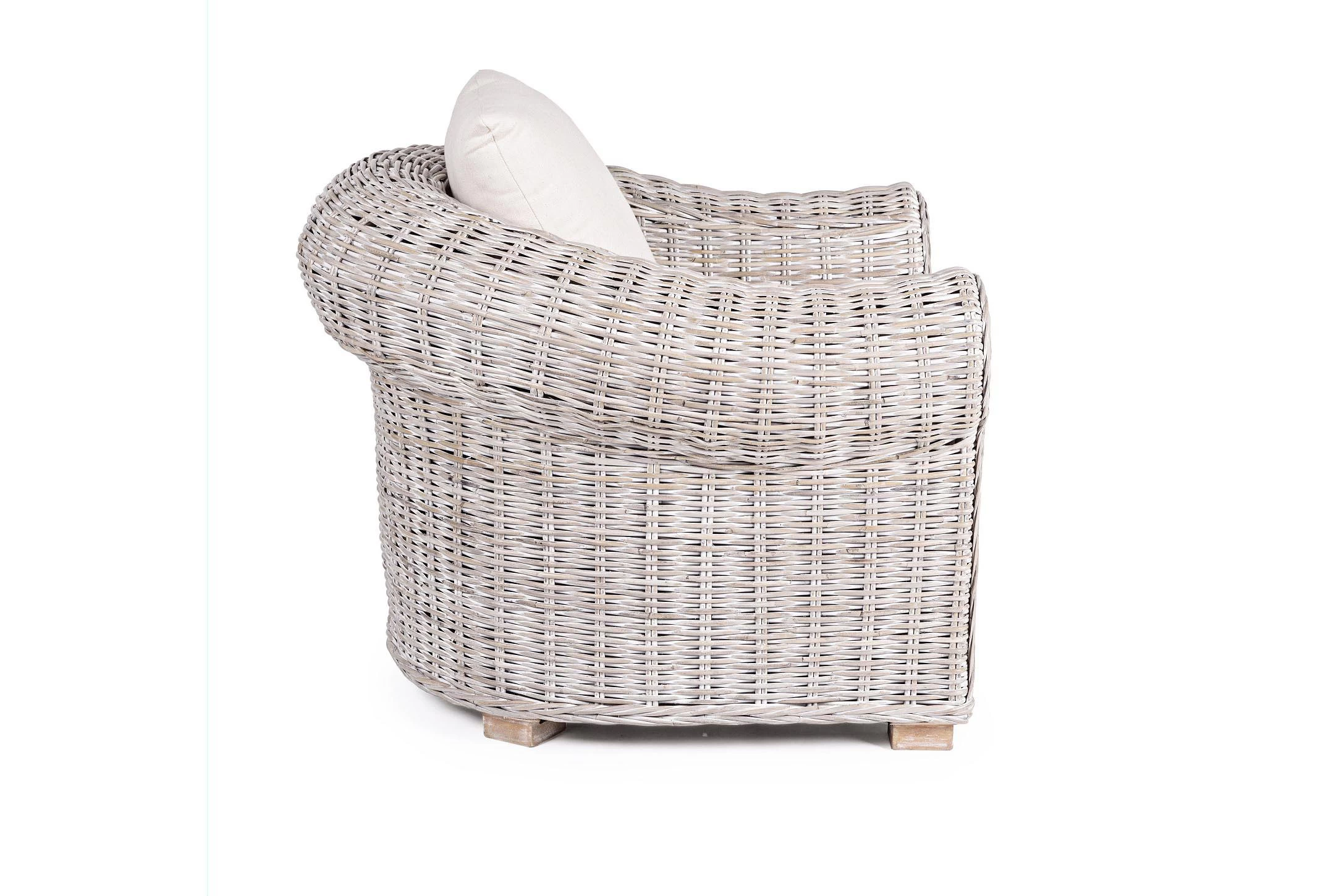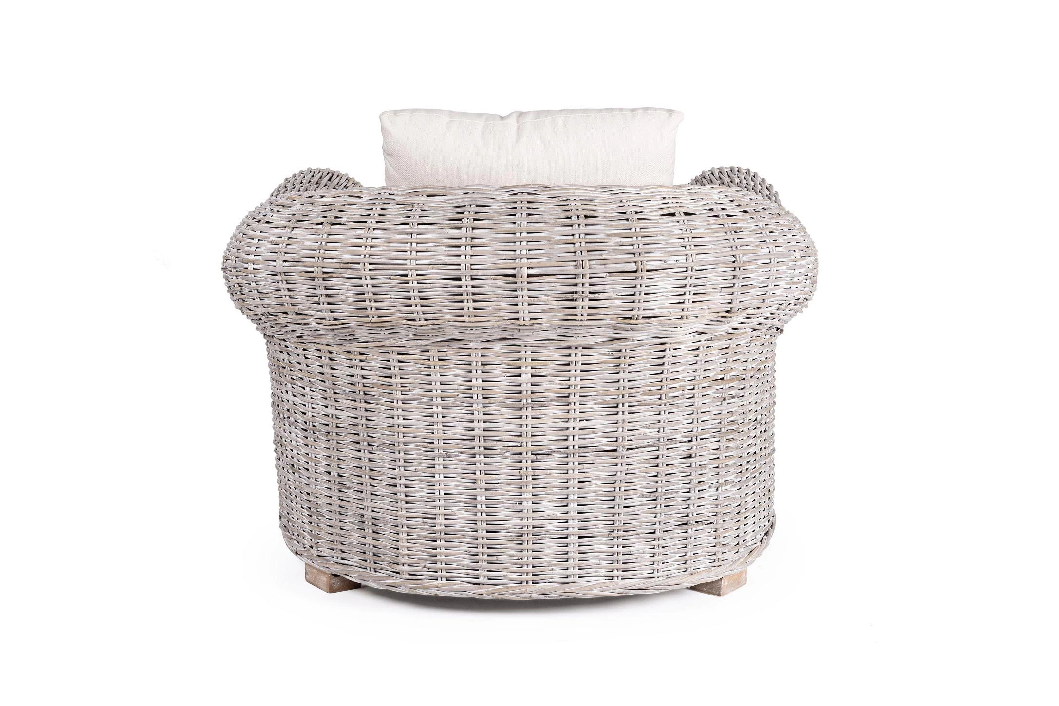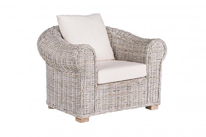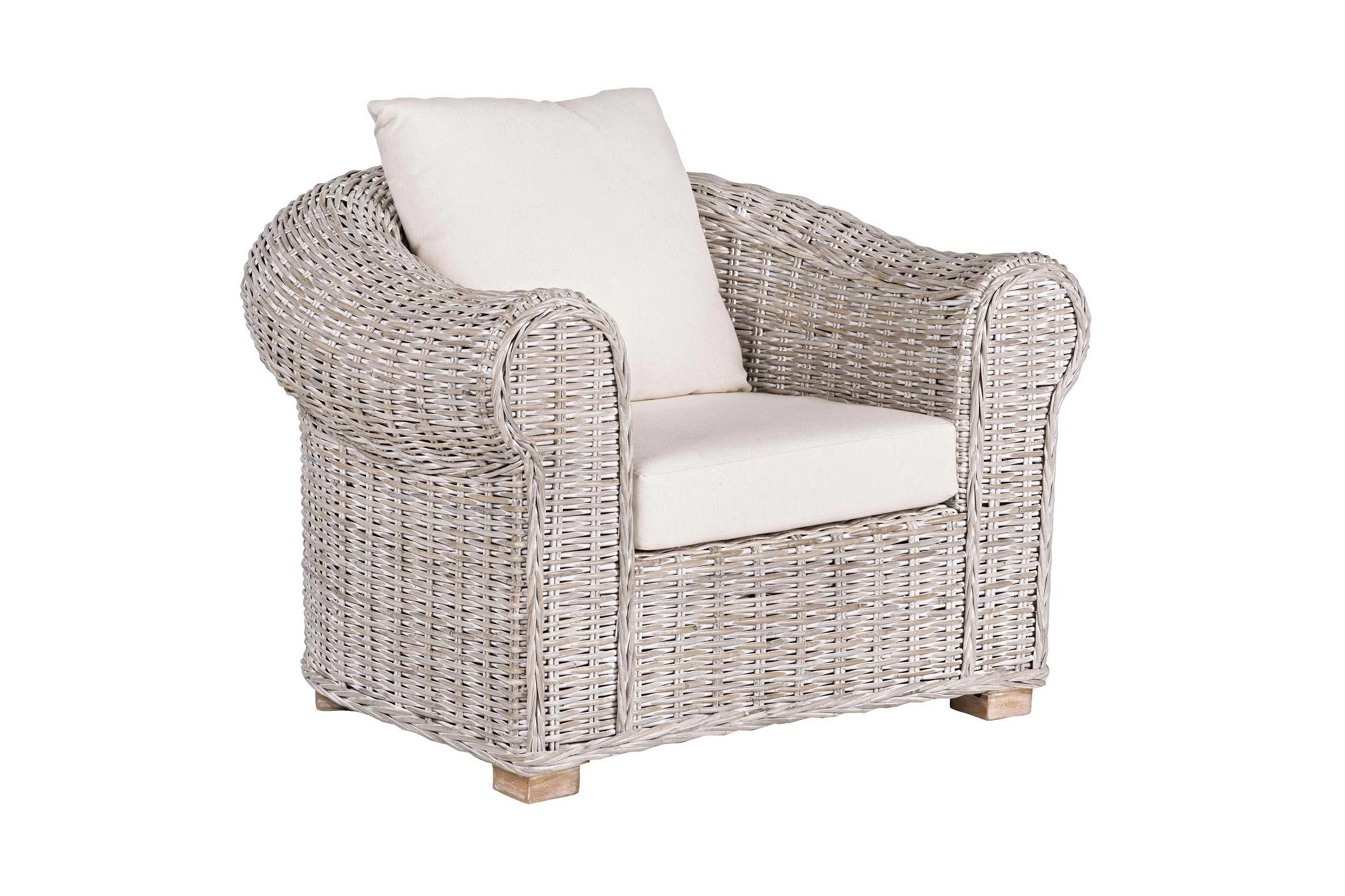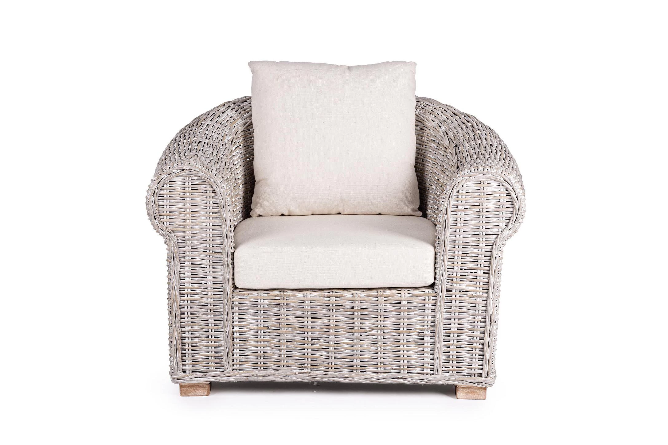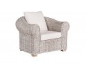 Klasyczny fotel wypoczynkowy z naturalnego bielonego rattanu z beżowymi poduszkami.
