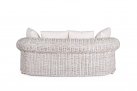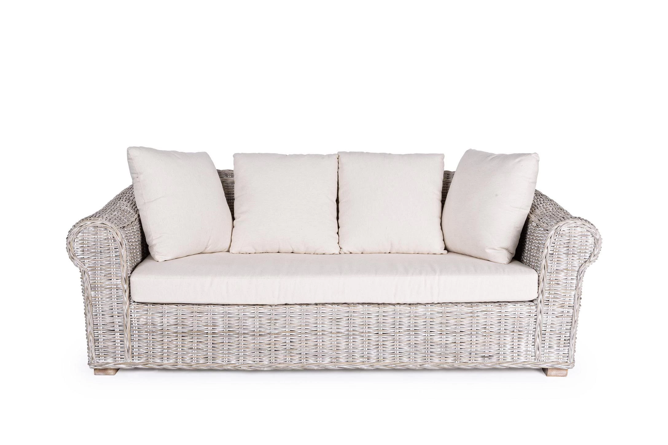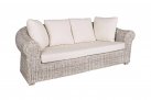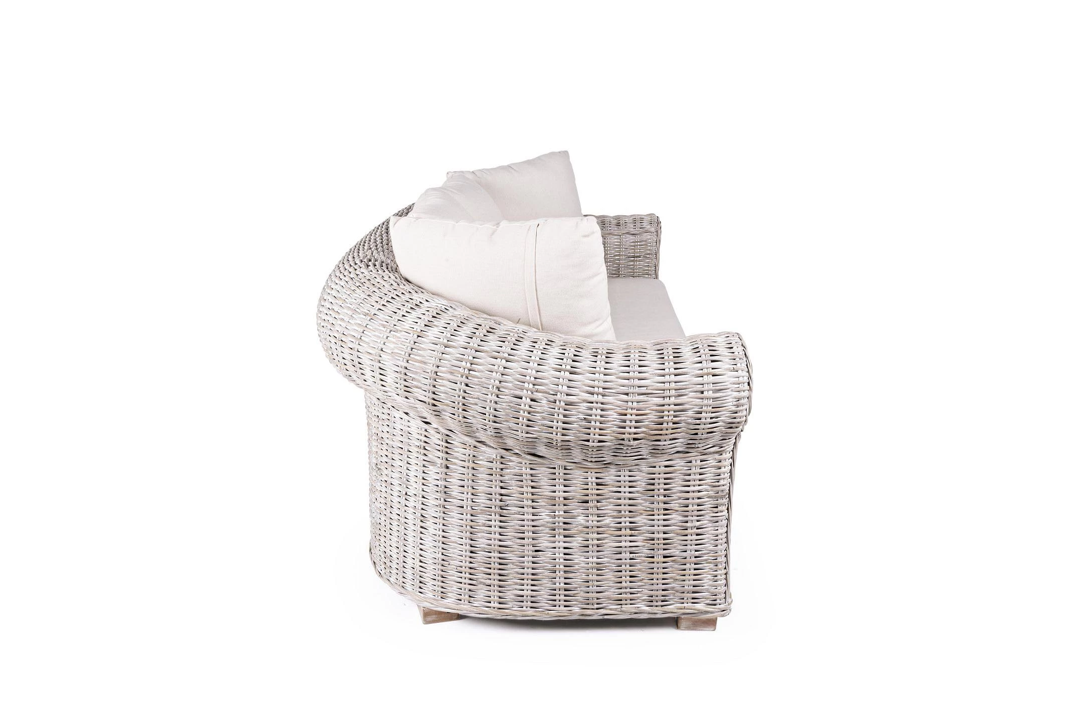Klasyczna sofa wypoczynkowa z naturalnego bielonego rattanu z beżowymi poduszkami.