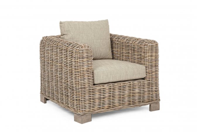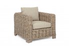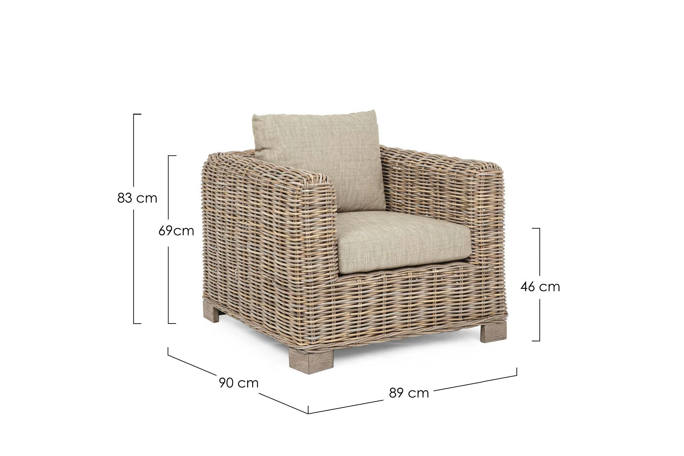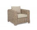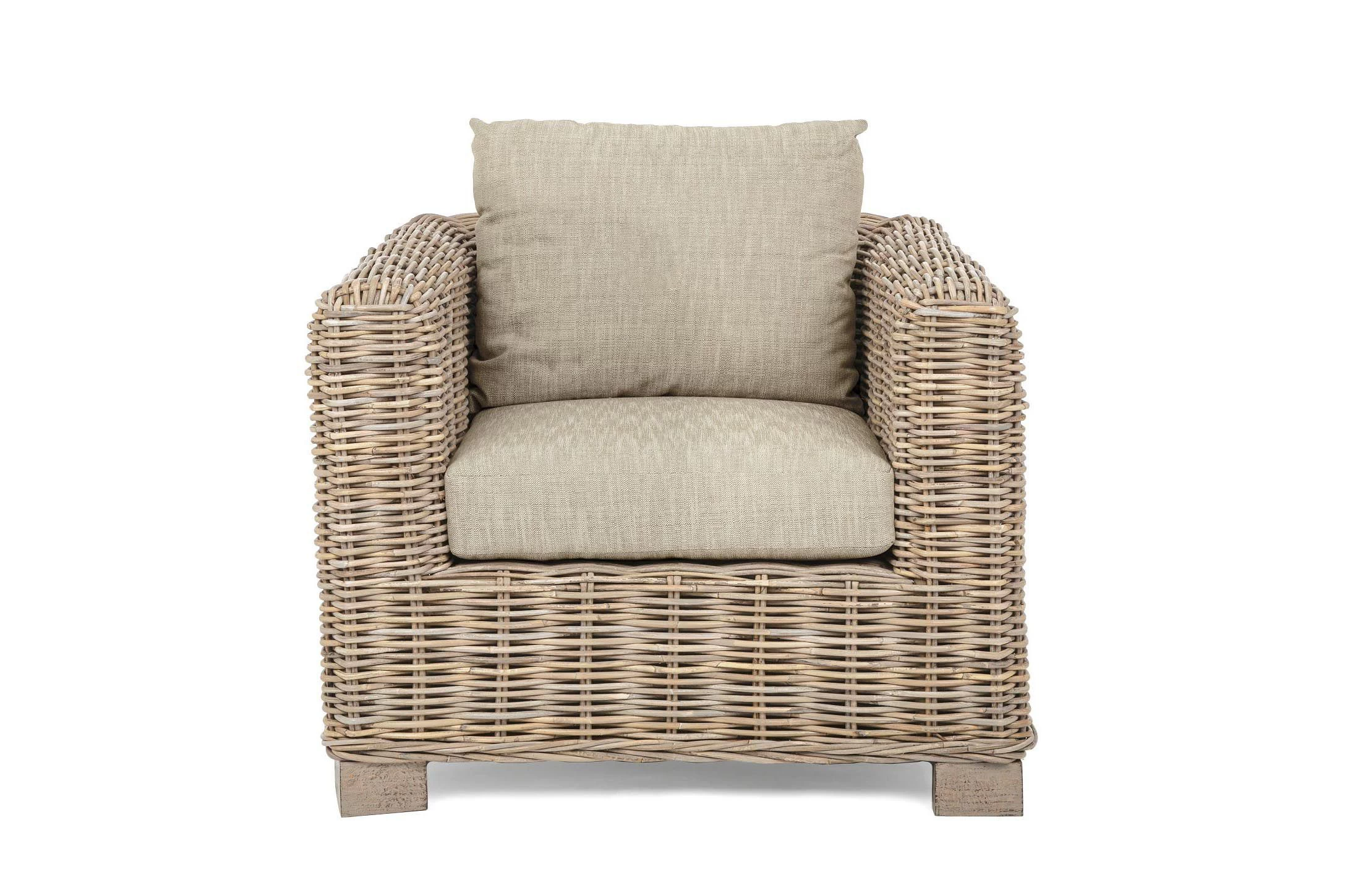 Klasyczny fotel wypoczynkowy z naturalnego rattanu z beżowymi poduszkami.