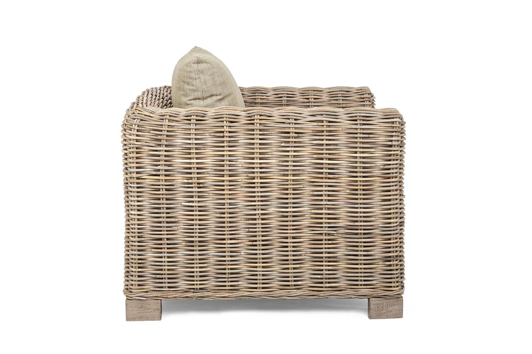 Mimo mniejszych gabarytów zewnętrznych, projekt zachowuje imponującą głębokość siedziska, co pozwala na pełne odprężenie w pozycji półleżącej, typowe dla luksusowych mebli wypoczynkowych. Surowa, niejednolita barwa plecionki w odcieniach szarości i beżu sprawia, że każda sofa jest niepowtarzalnym dziełem rzemiosła. To mebel stworzony dla osób ceniących autentyczność i chcących otaczać się przedmiotami z duszą, które stanowią wyraźny, naturalny akcent w domowej przestrzeni.
