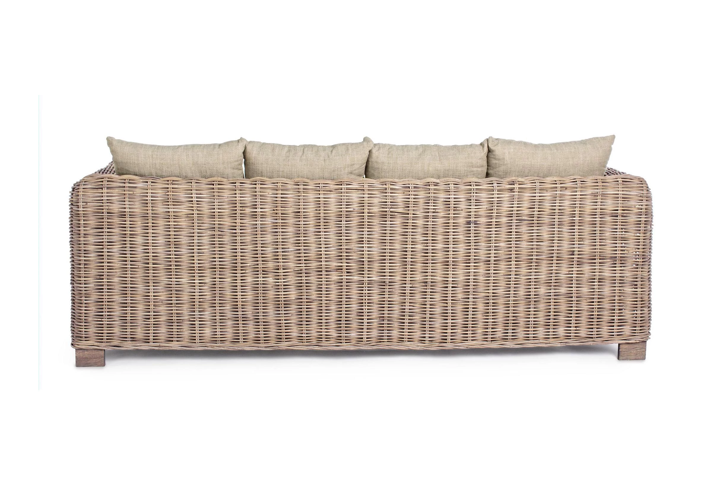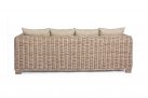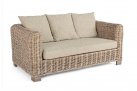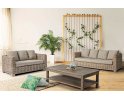 Klasyczny komplet wypoczynkowy z naturalnego rattanu ze stolikiem i beżowo-kremowymi poduszkami. Dobrano stolik Brasilia z drewna mango identycznego jak nogi sof i fotela. Można dobierać inne stoliki oraz komponować inne zestawy z kolekcji FORTALEZA.