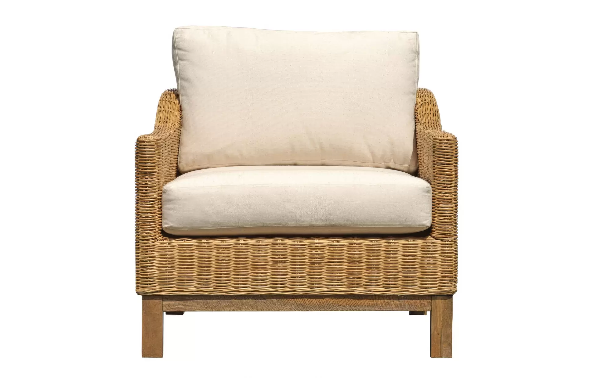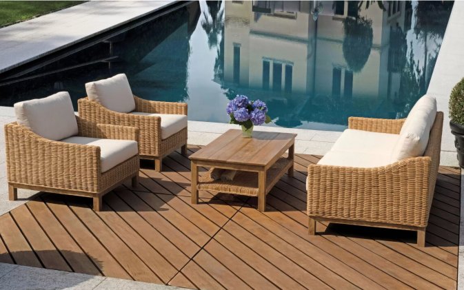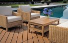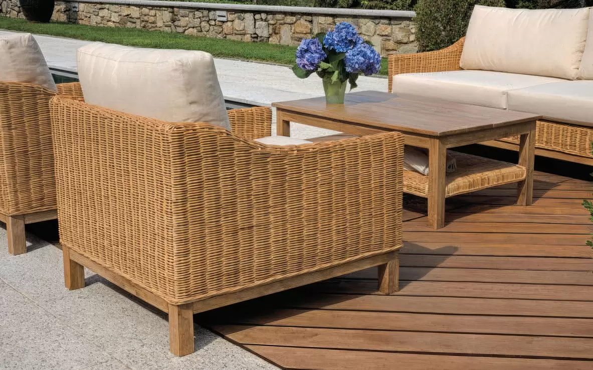 Ciepły zestaw z podłokietnikami o luksusowym wyglądzie, wykonany z naturalnego rattanu. Stolik zbudowany jest w całości z drewna mango.